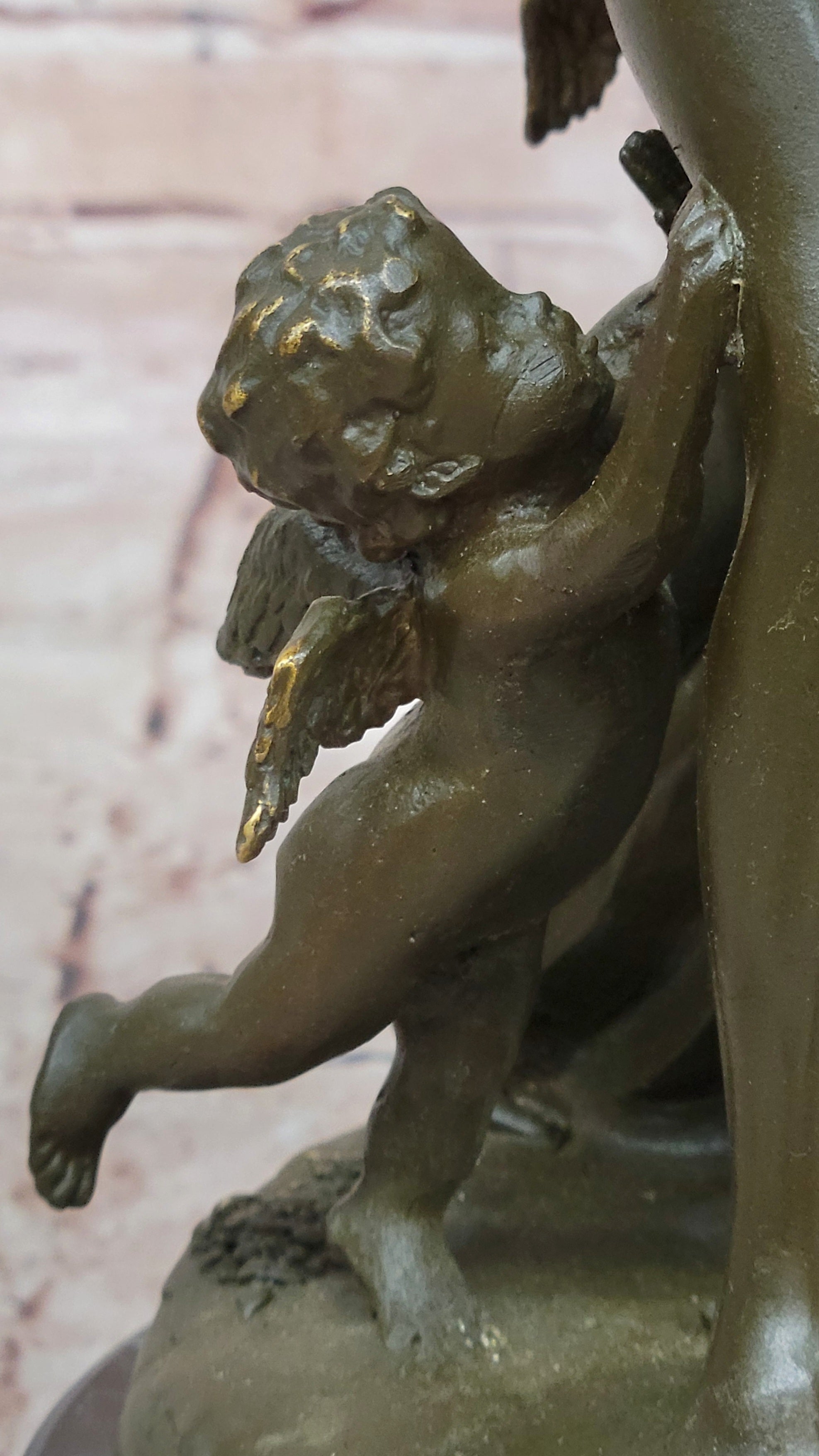 Handcrafted using the meticulous lost wax casting method, the sculpture is made of 100% genuine bronze and finished in a rich brown patina that highlights every intricate detail—from the soft curls of the angel’s hair to the gentle folds of the flowing garments. The round black marble base not only provides elegant contrast and support but also enhances the sculpture's visual presence. Each curve and contour is brought to life with careful craftsmanship, resulting in a truly museum-quality piece.
