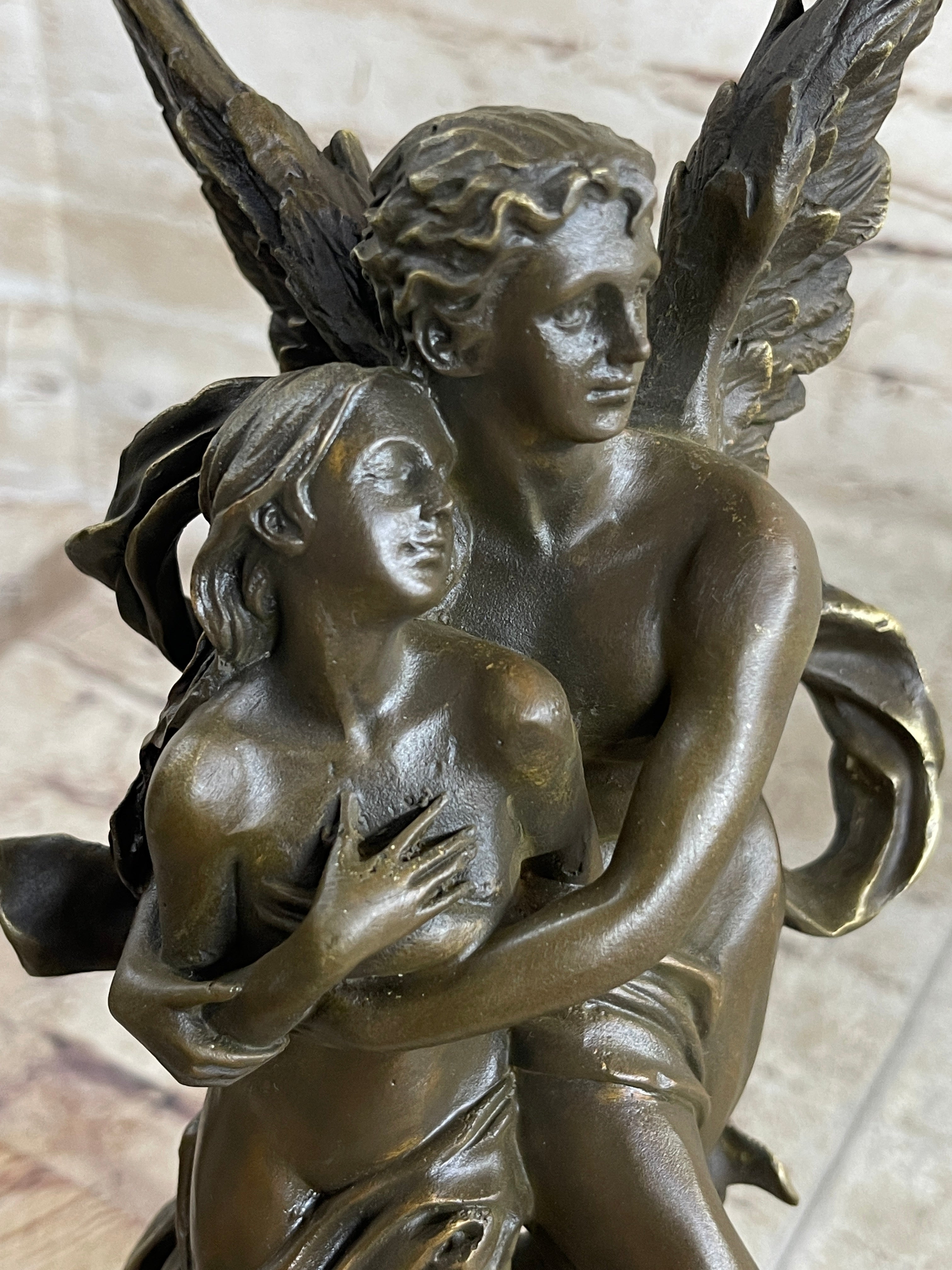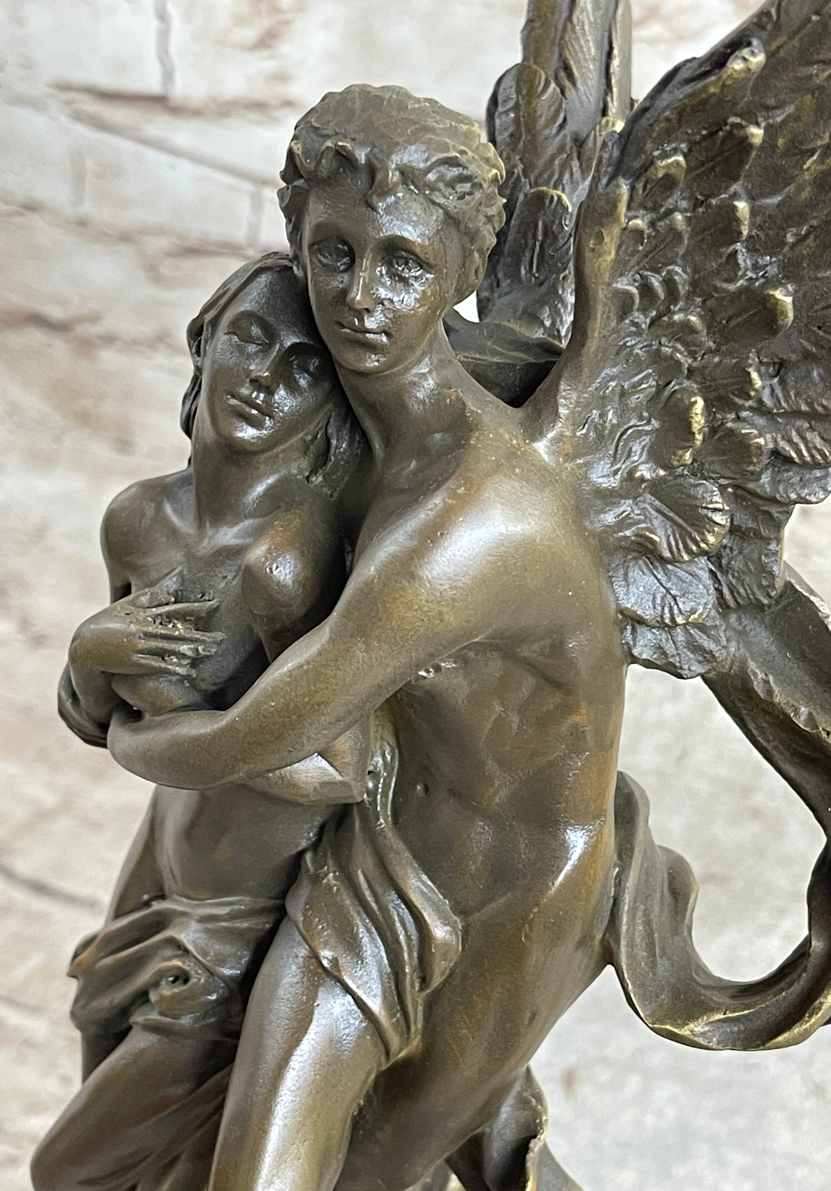 Introducing a captivating bronze sculpture that brings to life the timeless tale of Cupid and Psyche. This exquisite piece depicts the romantic couple locked in a loving embrace, their connection palpable and filled with pure affection. Cupid, with his wings gracefully spread, carries his beloved Psyche in his arms as they ascend to the sky. After years of bringing love to others, Cupid has finally found his own true love, and this sculpture captures the joy and gratitude he feels.