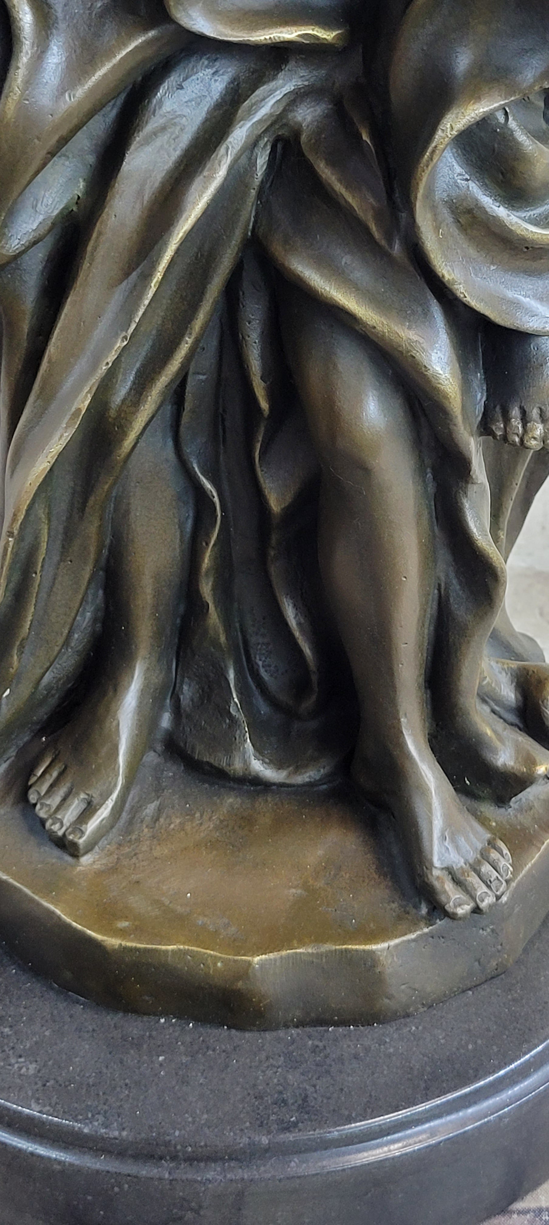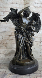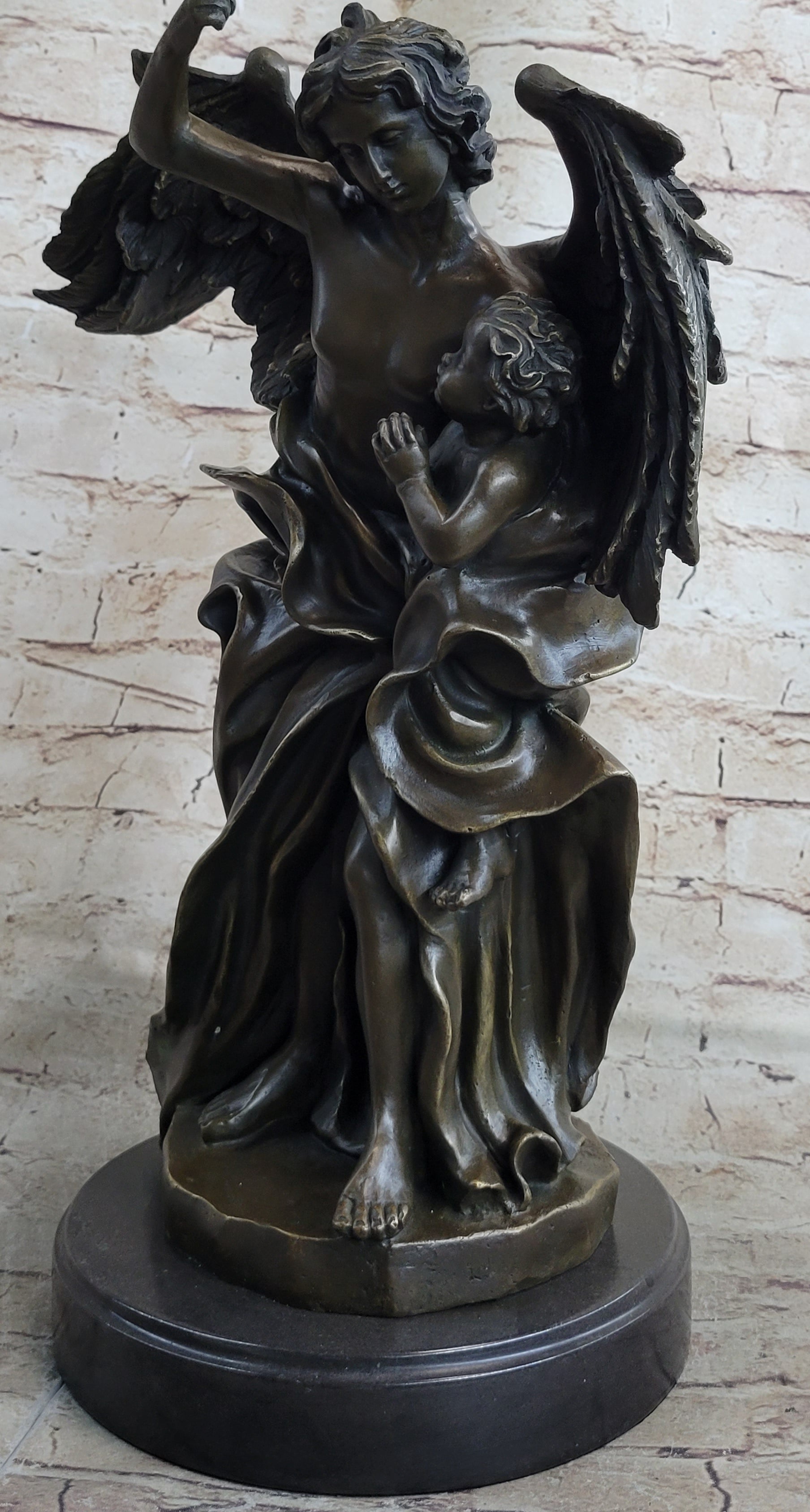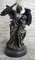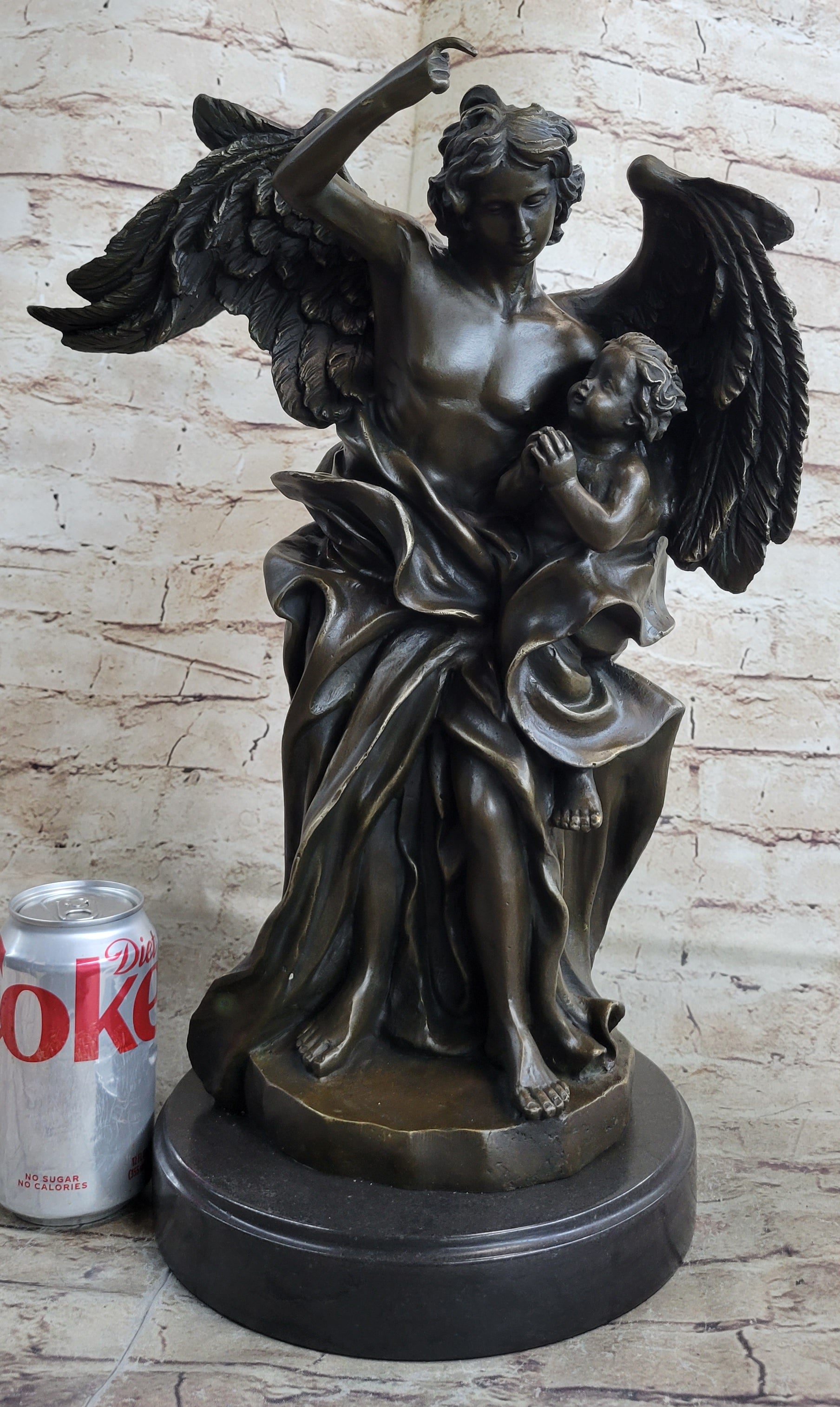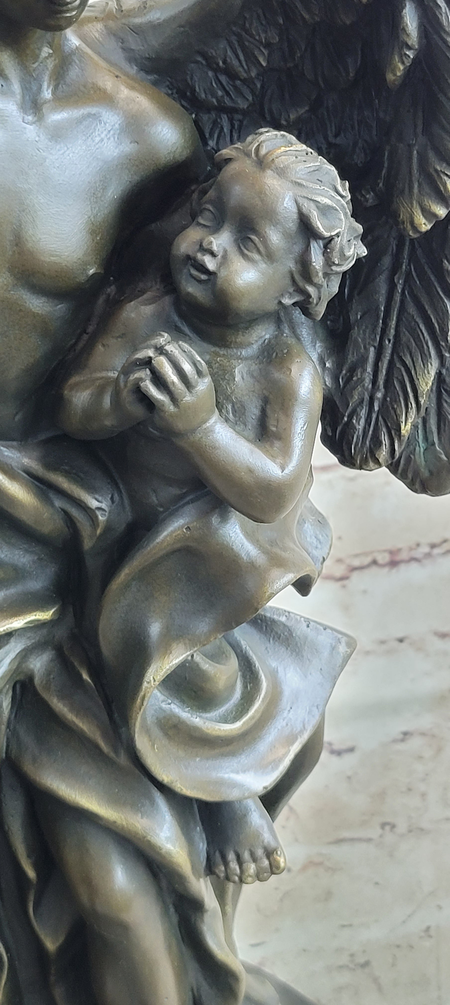 Signed Leonard Large Muscular Angel with a Child Bronze Marble Sculpture Statue