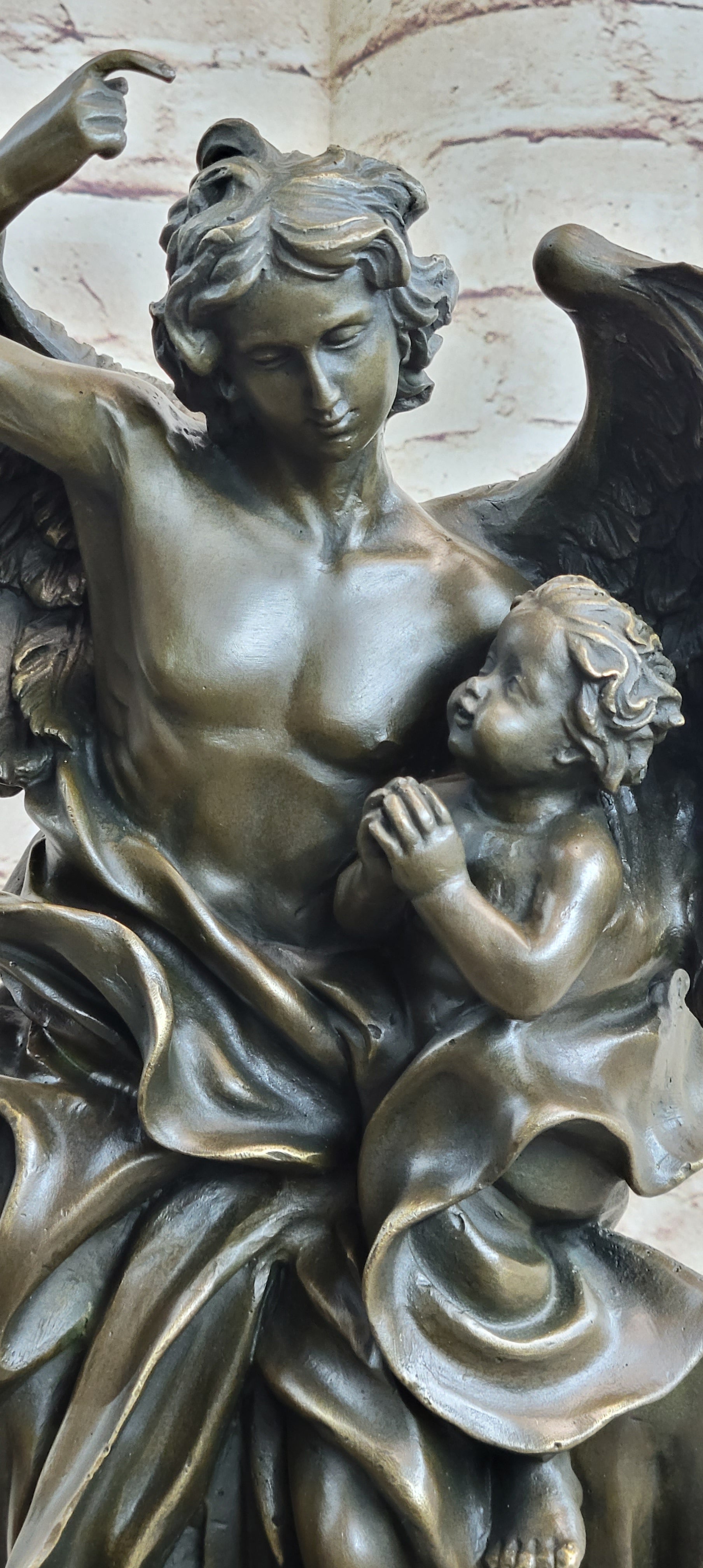 A muscular angel holds a beautiful, healthy baby with tender care in this stunning bronze sculpture. The angel's raised finger gently touches the precious baby, embodying a moment of pure affection and guardianship. His majestic wings, spread wide in a W shape, are detailed with thick feathers, evoking the grace and strength of a bird in flight.