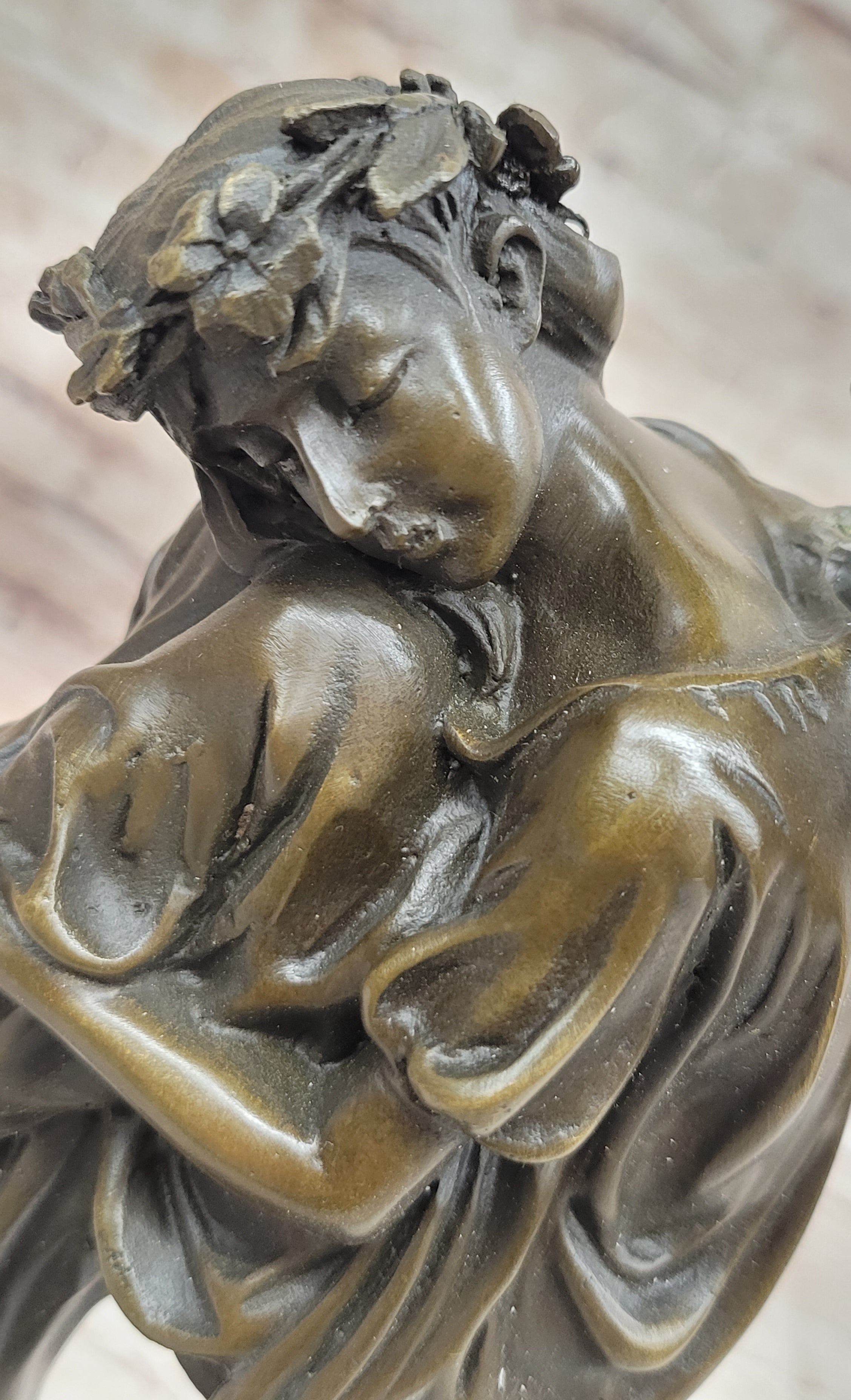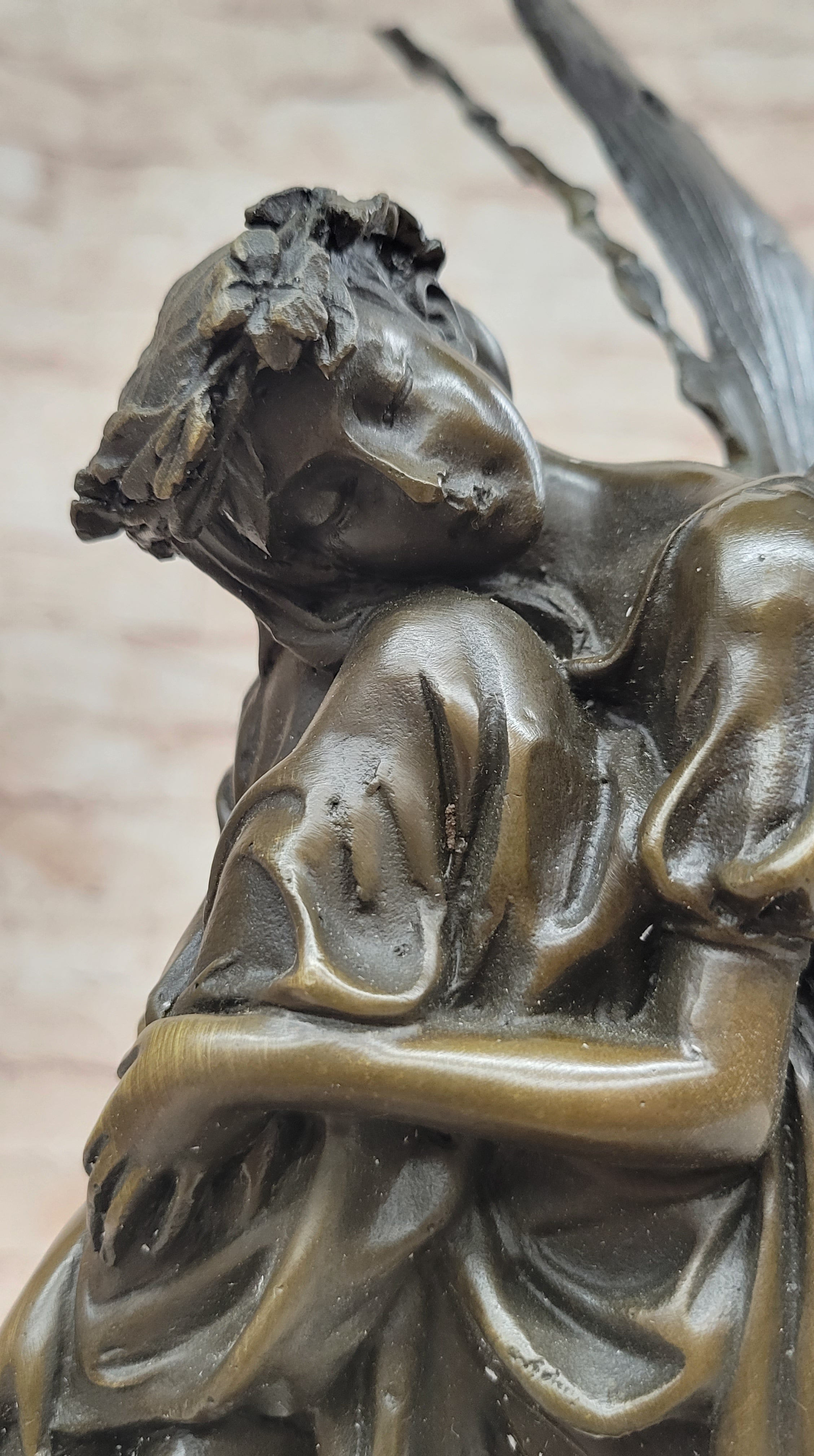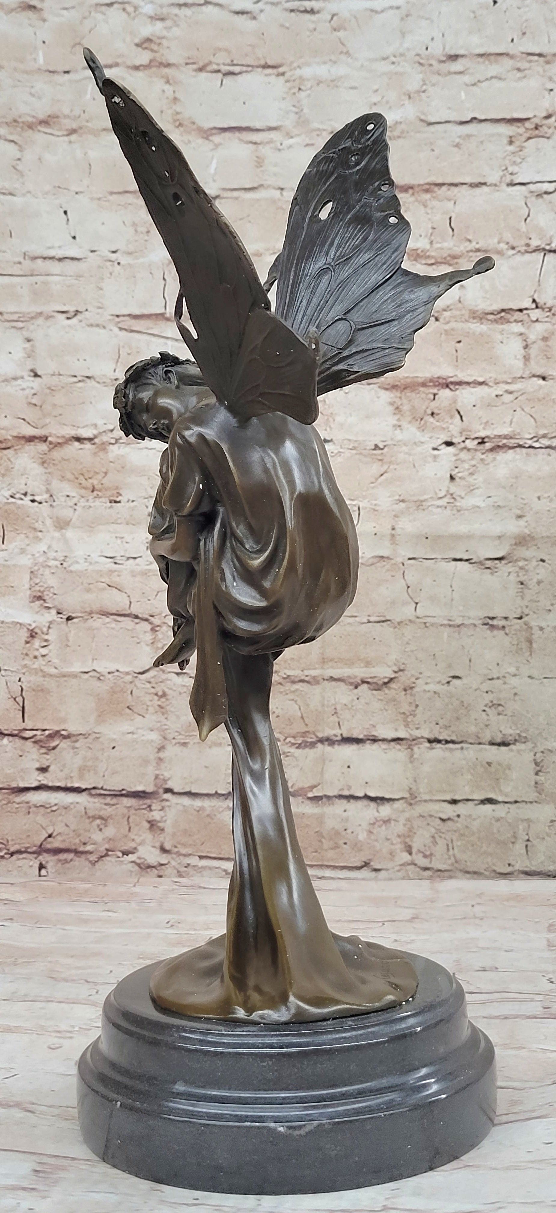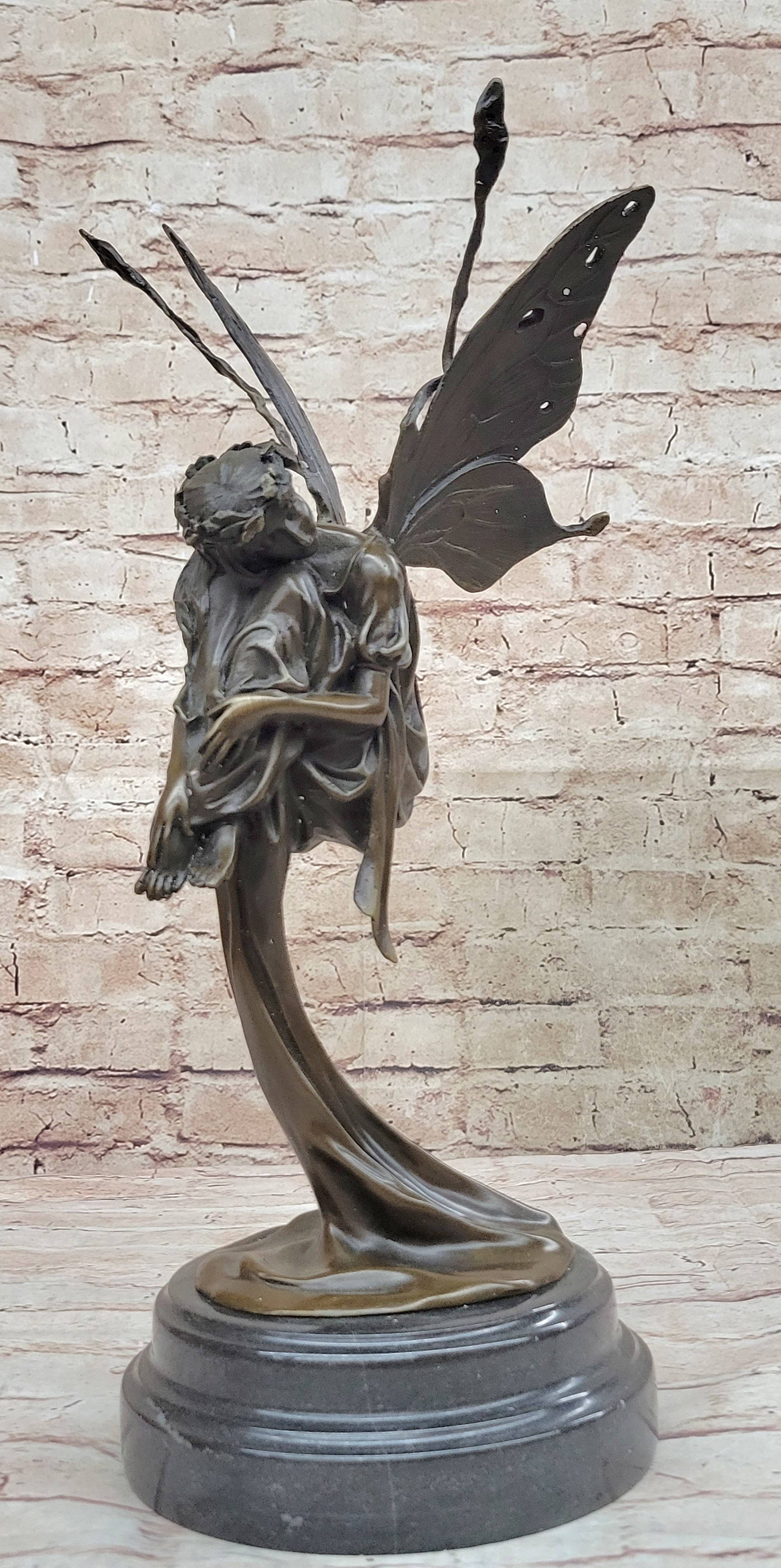 Cast with precision and care using the revered Lost Wax Method, this bronze sculpture captures the ethereal beauty and spiritual essence of the heavenly fairy. The intricate details of her wings, robes, and expression are brought to life with a rich brown patina finish, lending depth and dimension to her celestial form. Mounted on a sleek black marble base, she stands as a beacon of hope and guidance for all who behold her.