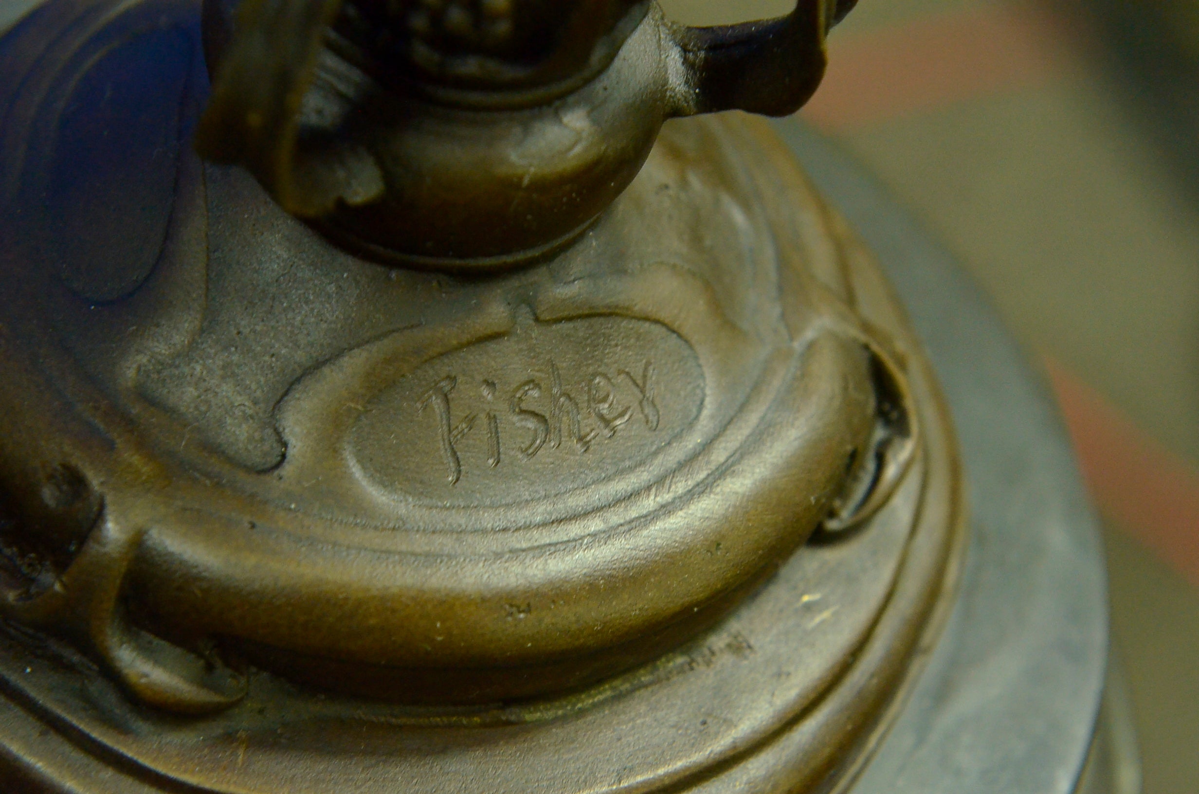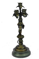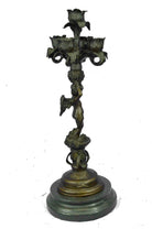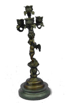 This adorable candelabra is of a cherub balancing the large stem of flowers on his head with his hands. The roots of the tree are exposed and filled bunches of berries. Five blossomed rosebuds that act as the holders. This is an adorable sculpture that will wonderfully accent your candles. It is handmade and fully detailed. The sculpture was cast using the "Lost Wax Method." It is mounted on a marble base and signed by the artist Fisher.Original or Reproduction: Original