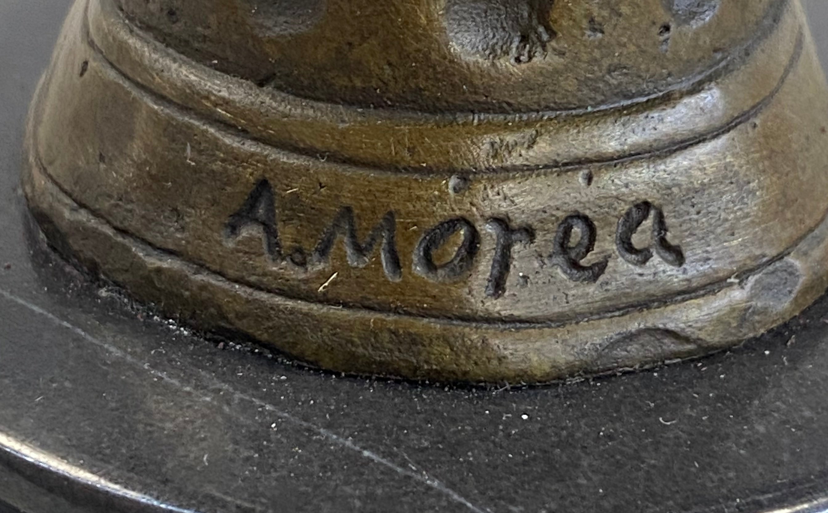 This enchanting bronze statue captures the innocence and joy of a cherub playing the trumpet, adding a delightful touch to any space. The adorable cherub, with a serene expression, is depicted in a moment of pure happiness as it engages with the trumpet. The figurine, part of a series of cherub musicians, is versatile enough to complement both interior and garden settings. Placed on a marble stand, it becomes an elegant and timeless piece of art. The cherub's blissful demeanor while playing the trumpet evokes a sense of celestial delight, making it a thoughtful and charming gift. This sculpture, crafted entirely by hand using the archaic method of lost-wax casting, ensures that each detail is meticulously preserved. The brown patina finish adds warmth and depth to the bronze, enhancing its overall aesthetic appeal. The artist's signature, A. Moreau, signifies the quality of this exquisite piece. Whether as a gift for someone who works with children, a celestial enthusiast, or anyone who appreciates the beauty of bronze sculptures, this charming cherub figurine is a wonderful addition to any collection. Its timeless elegance, combined with the artisanal craftsmanship, makes it a cherished and meaningful artwork that transcends both style and time.