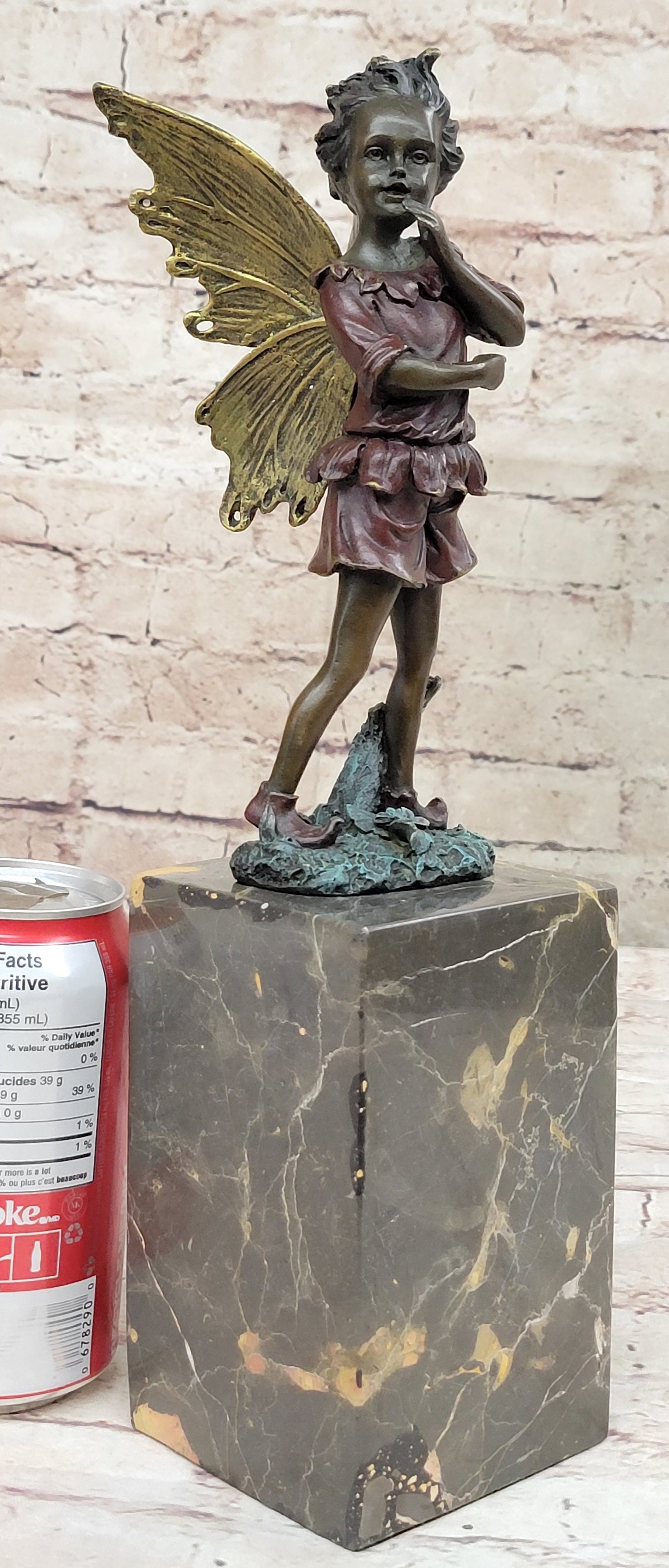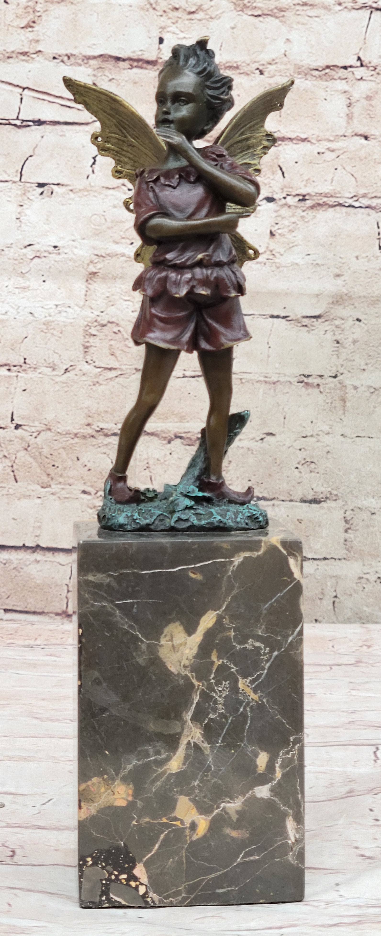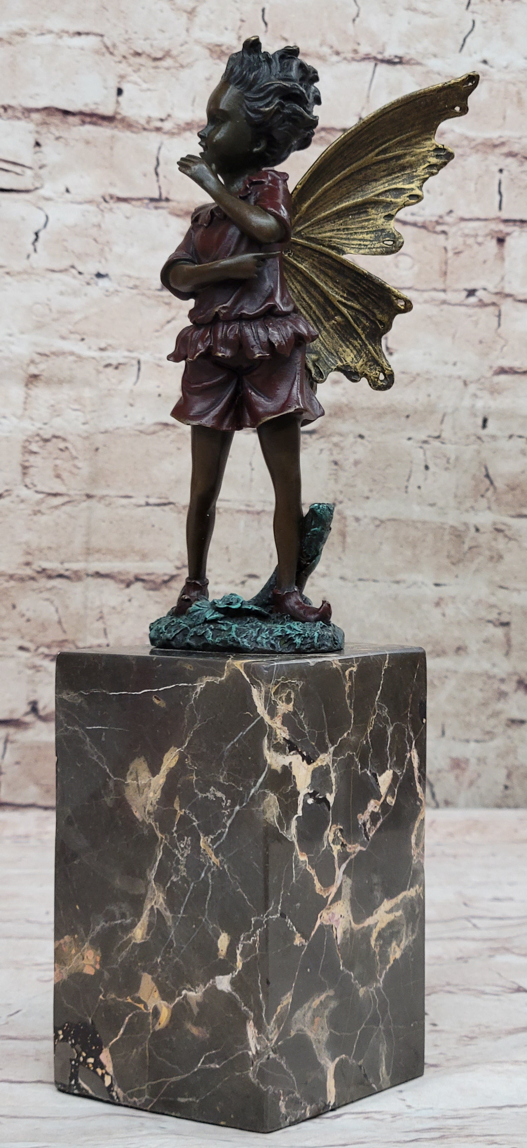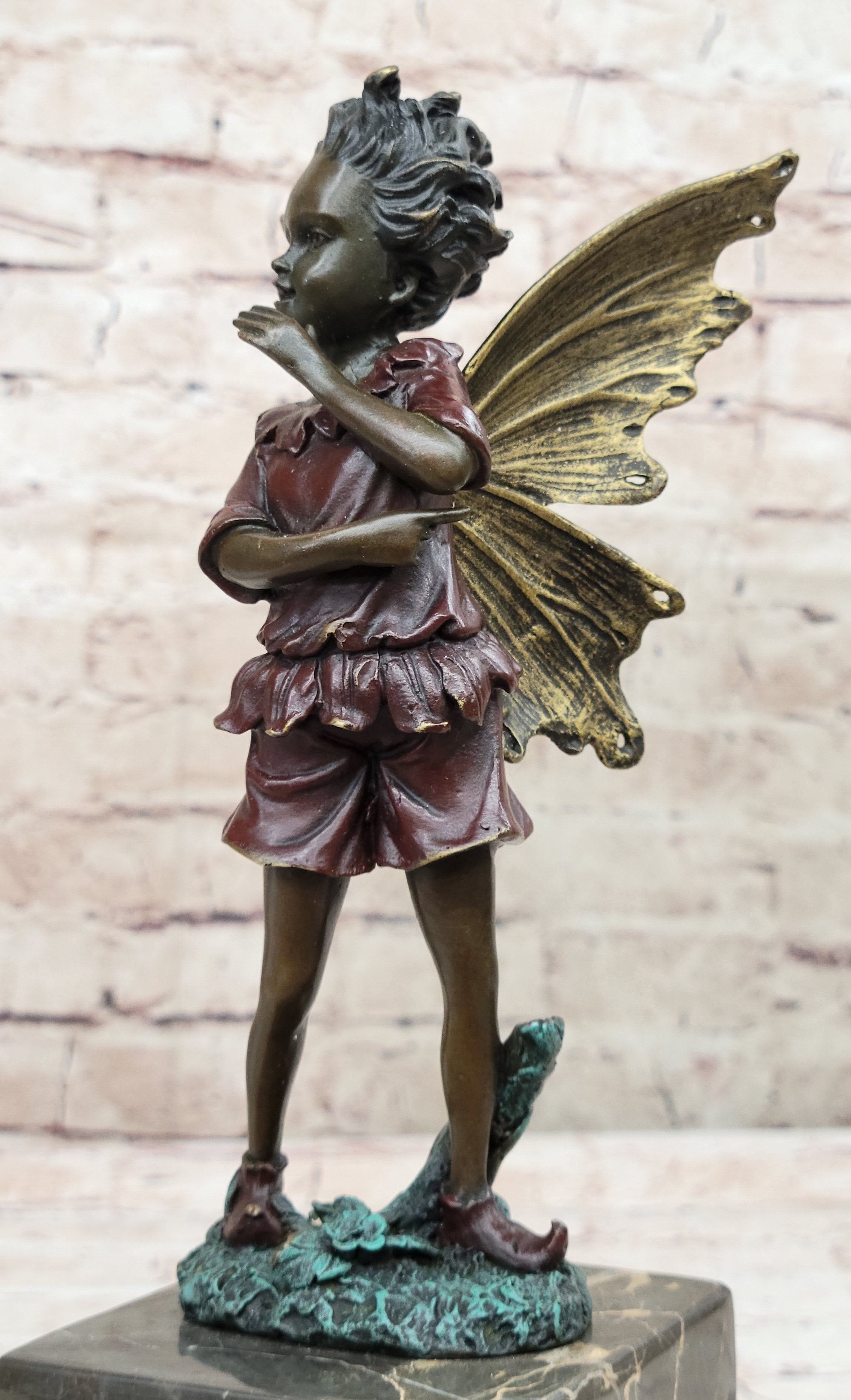 Daydreamers, especially those enchanted by mystical realms, will be captivated by this whimsical sculpture of a daydreaming fairy. In her wanderings through the enchanted forest, her eyes sparkle with wonder as she absorbs the magical essence that surrounds her. Her youthful innocence is evident in her joyful giggles, echoing the soft melodies of life and fantasy intertwining in her world. With delicate wings arching gracefully behind her and dressed in a captivating red patina gown, this fairy embodies the essence of imagination and innocence.