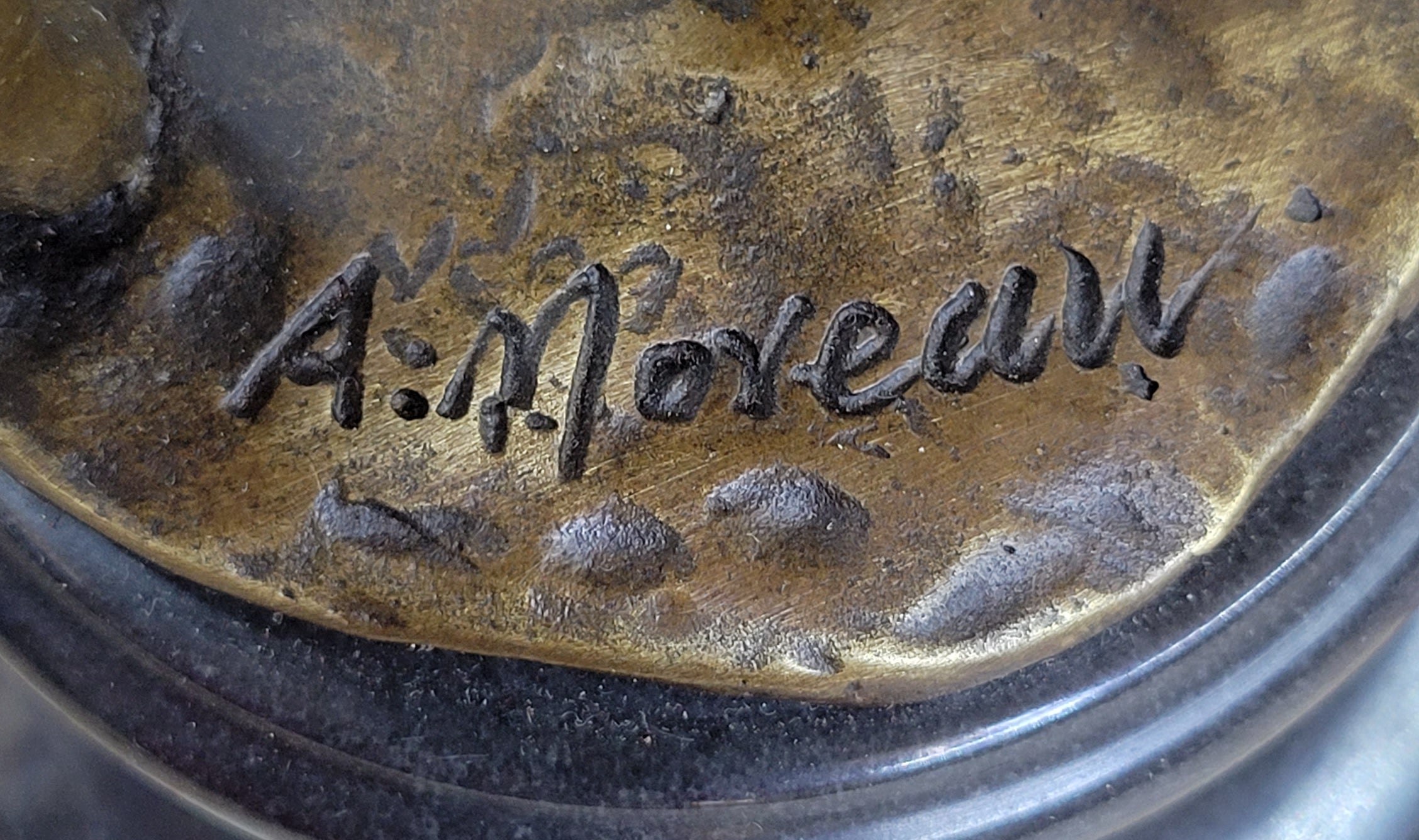 Mounted on a variegated black marble base and bearing the signature of the artist A. Moreau, this sculpture is not only a work of art but also a symbol of beauty and spirituality. It invites you to contemplate the mysteries of the divine and the enchantment of the world beyond. Whether displayed in your home, garden, or a place of meditation, this cherubic angel will bring a sense of wonder and tranquility to any space.Bronze Dimensions with Marble Base: Height 17" X Width 7"