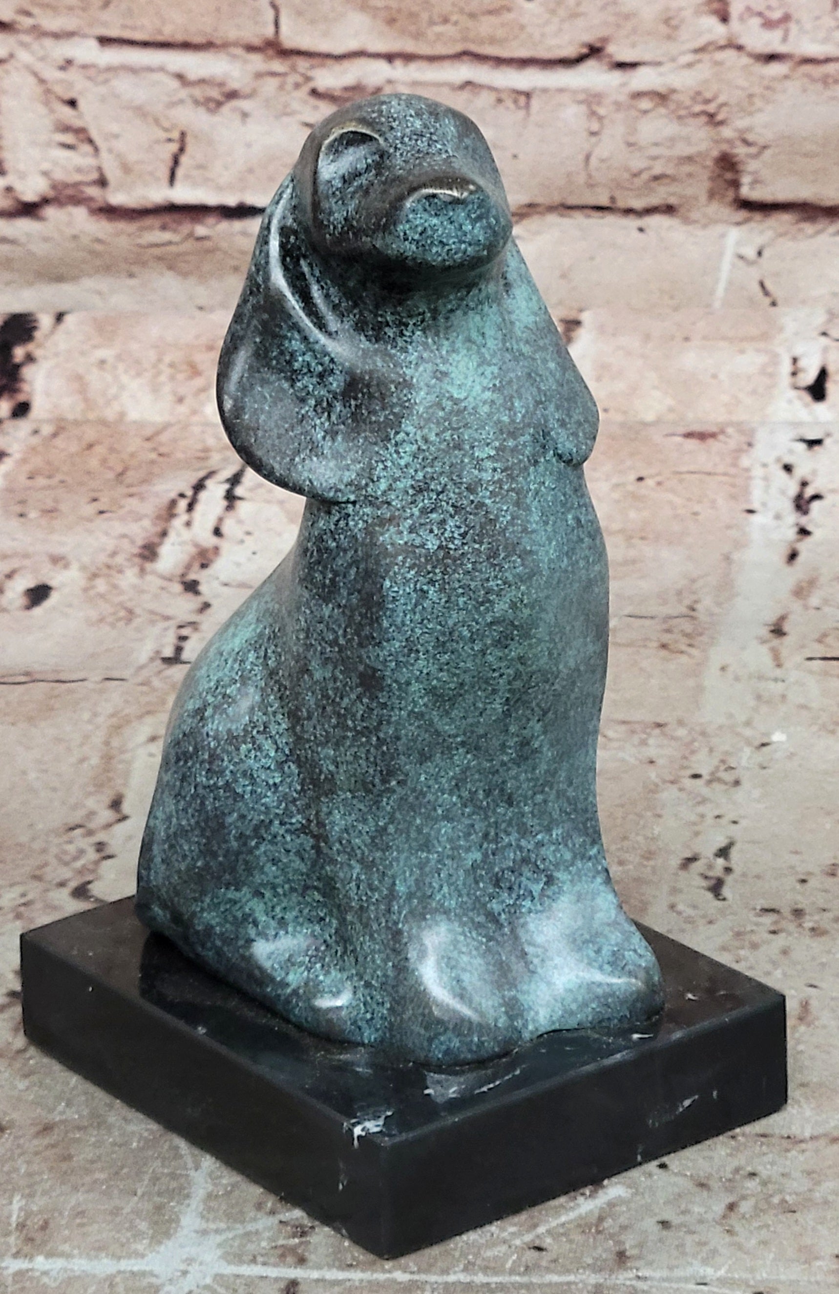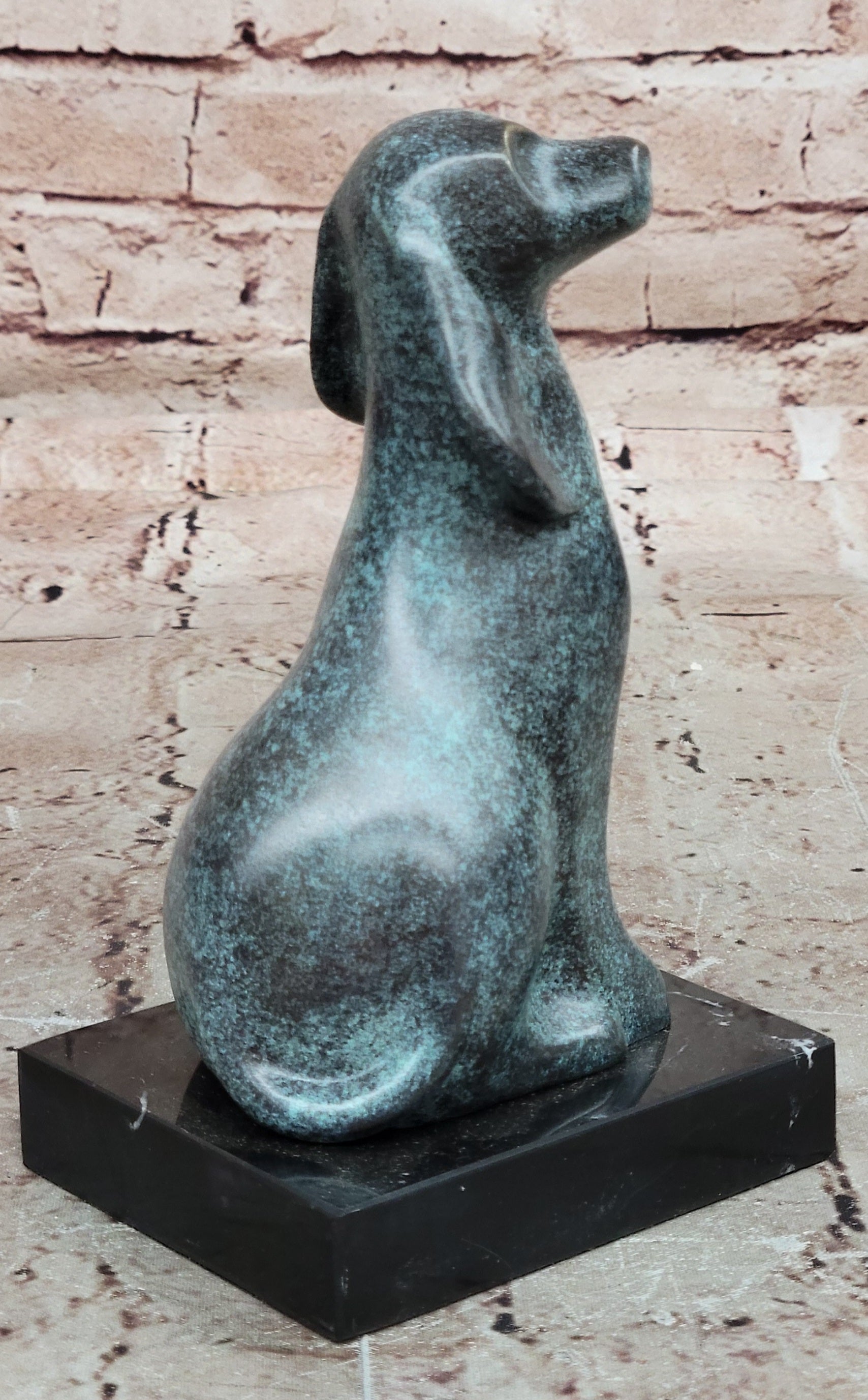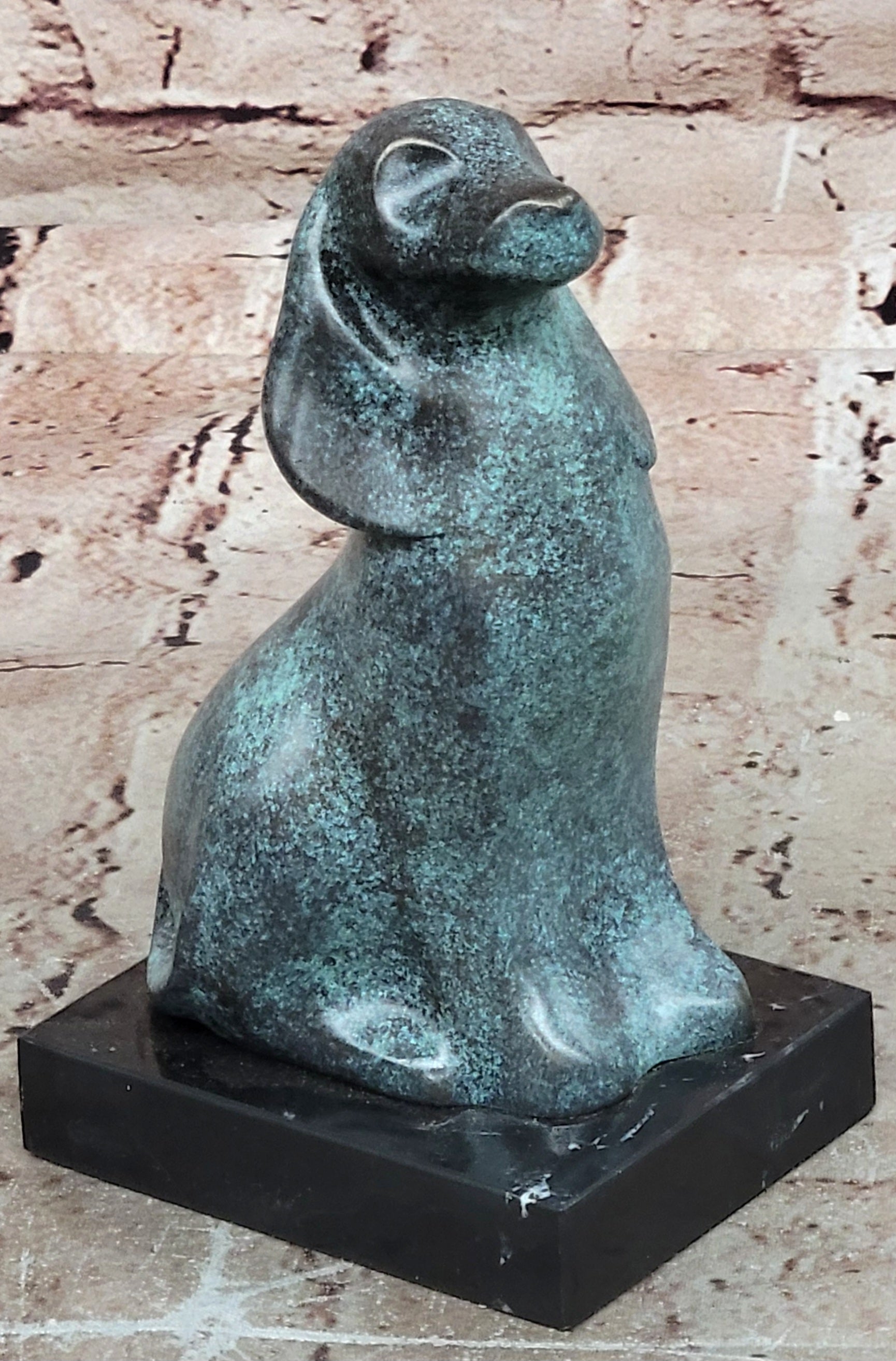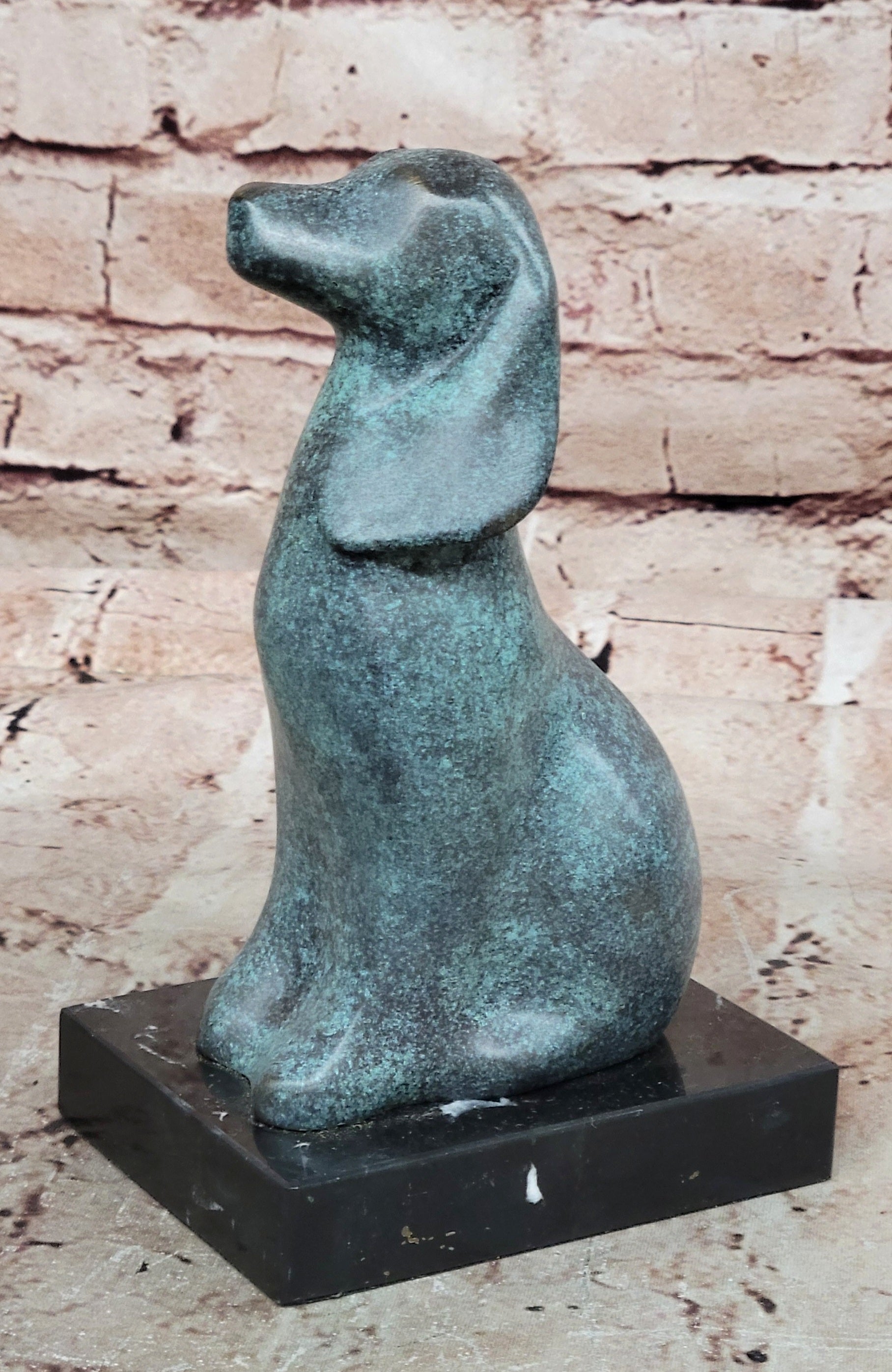 This genuine bronze dog sculpture presents a timeless and abstract interpretation of man’s best friend, blending vintage charm with artistic expression. The simplified, flowing form captures the loyalty and character of the dog while maintaining a modern, sculptural aesthetic. Its balanced design and expressive presence make it a distinctive accent for any home décor or art collection. Hand made using the traditional lost wax method, this sculpture reflects exceptional craftsmanship and careful attention to detail. The unique green patina gives the bronze a rich, aged character, enhancing its abstract form and adding visual depth. Each curve and surface reveals the artist’s hand, resulting in a one-of-a-kind piece with lasting beauty. Mounted on a polished black marble base, the sculpture gains stability and a refined presentation that contrasts beautifully with the green tones of the bronze. Signed by the renowned artist Milo, this original vintage-style animal sculpture is a collectible work of art. Ideal for dog lovers, modern art enthusiasts, or collectors of fine bronze décor, it offers enduring appeal and artistic significance.