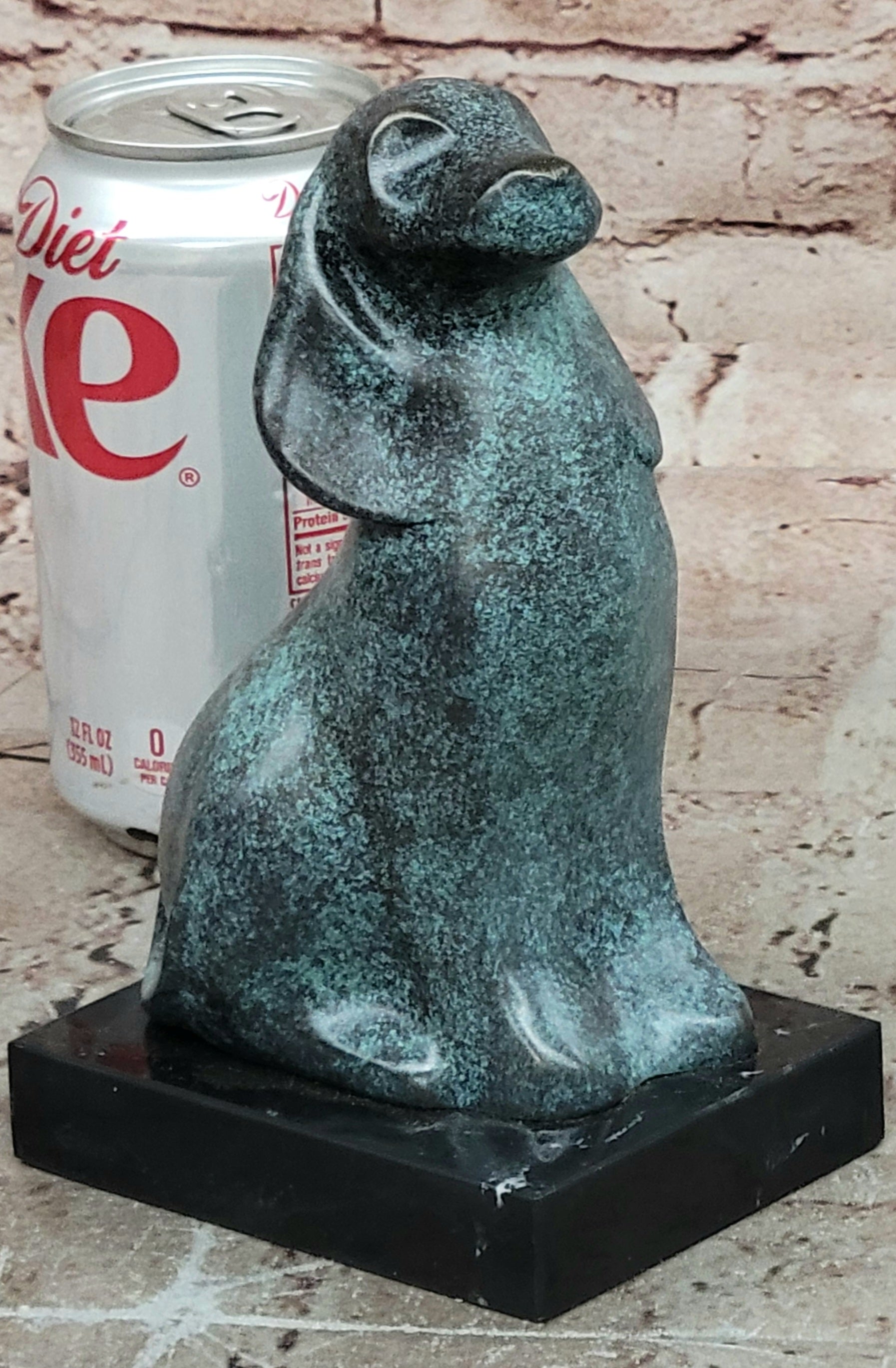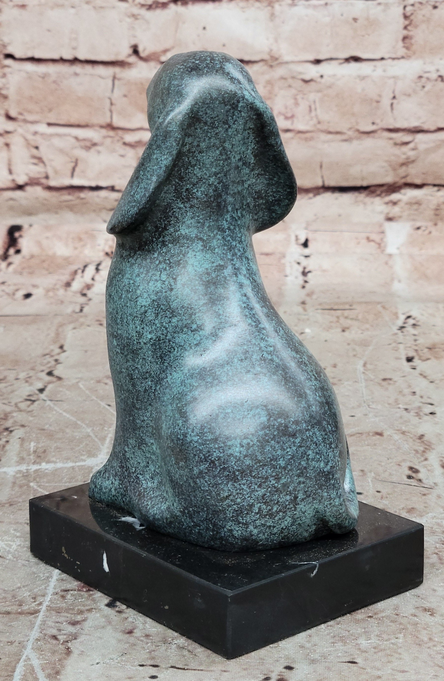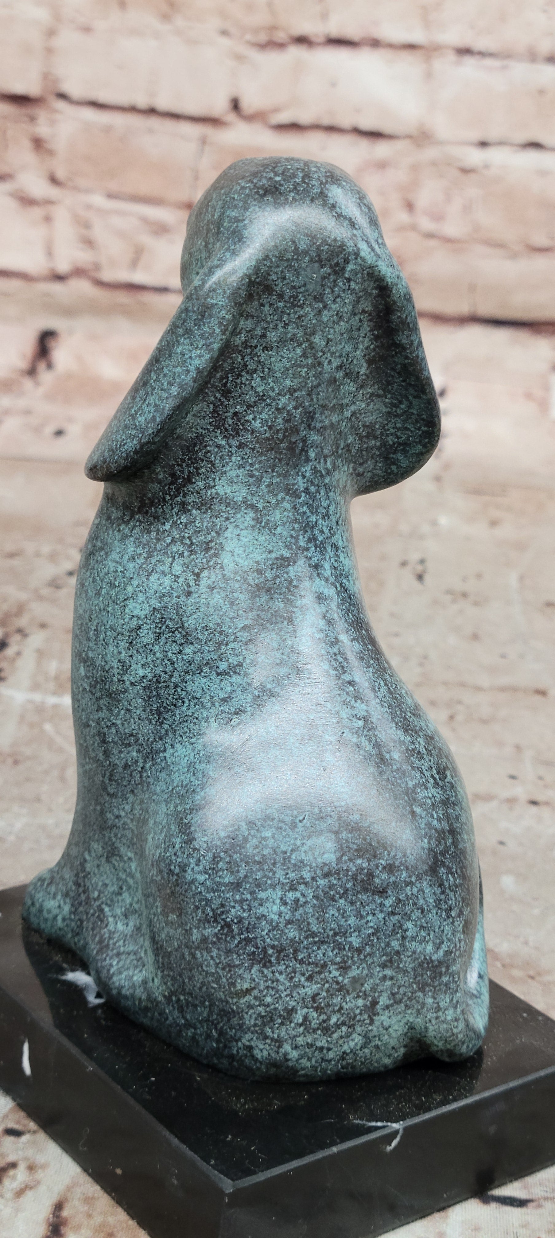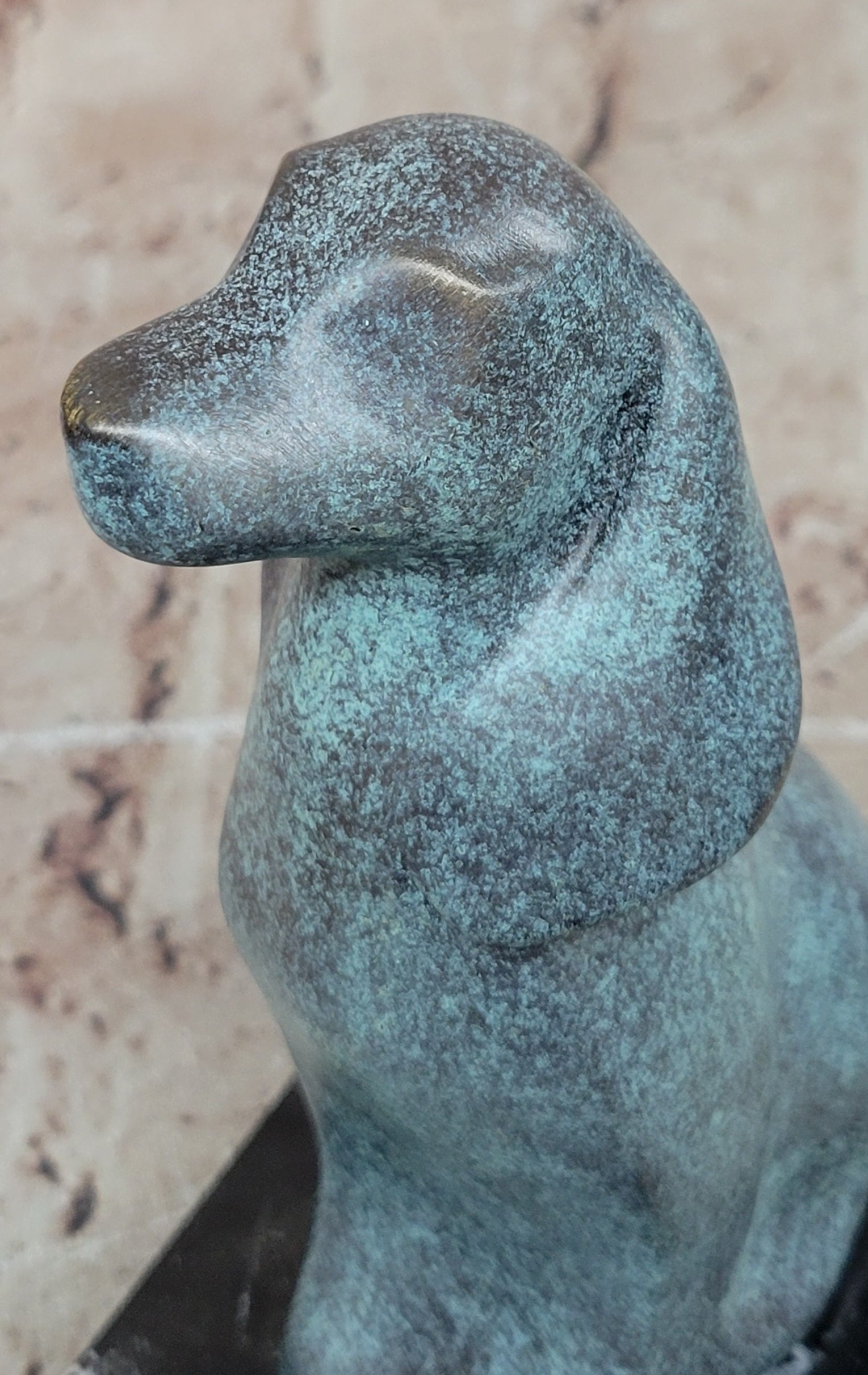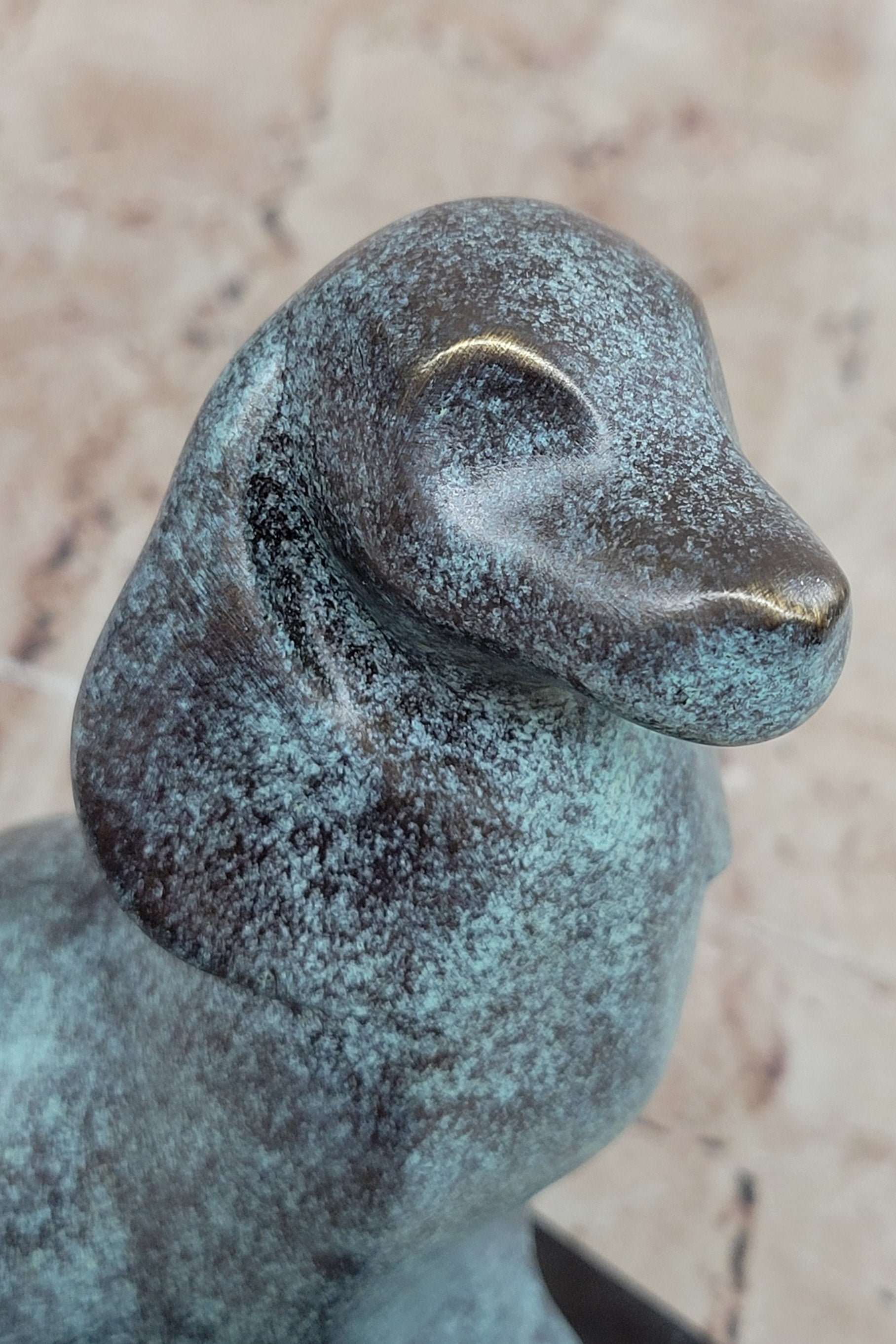 This genuine bronze dog sculpture presents a timeless and abstract interpretation of man’s best friend, blending vintage charm with artistic expression. The simplified, flowing form captures the loyalty and character of the dog while maintaining a modern, sculptural aesthetic. Its balanced design and expressive presence make it a distinctive accent for any home décor or art collection. Hand made using the traditional lost wax method, this sculpture reflects exceptional craftsmanship and careful attention to detail. The unique green patina gives the bronze a rich, aged character, enhancing its abstract form and adding visual depth. Each curve and surface reveals the artist’s hand, resulting in a one-of-a-kind piece with lasting beauty. Mounted on a polished black marble base, the sculpture gains stability and a refined presentation that contrasts beautifully with the green tones of the bronze. Signed by the renowned artist Milo, this original vintage-style animal sculpture is a collectible work of art. Ideal for dog lovers, modern art enthusiasts, or collectors of fine bronze décor, it offers enduring appeal and artistic significance.