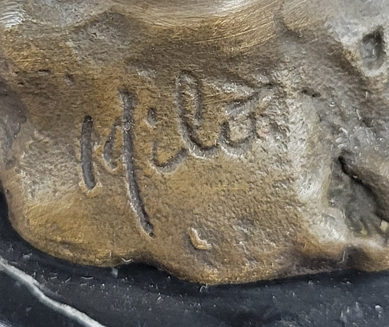 Mounted on a polished black round marble base, the sculpture achieves a refined and stable presentation. Signed by renowned Portuguese artist Miguel Lopez, also known as Milo, this piece represents authentic modern bronze artistry. It is an excellent addition to any fine art collection and a thoughtful gift for lovers of abstract design, wildlife symbolism, or museum-quality bronze sculptures.Bronze Dimensions with Marble Base: Height 5" X Width 4"