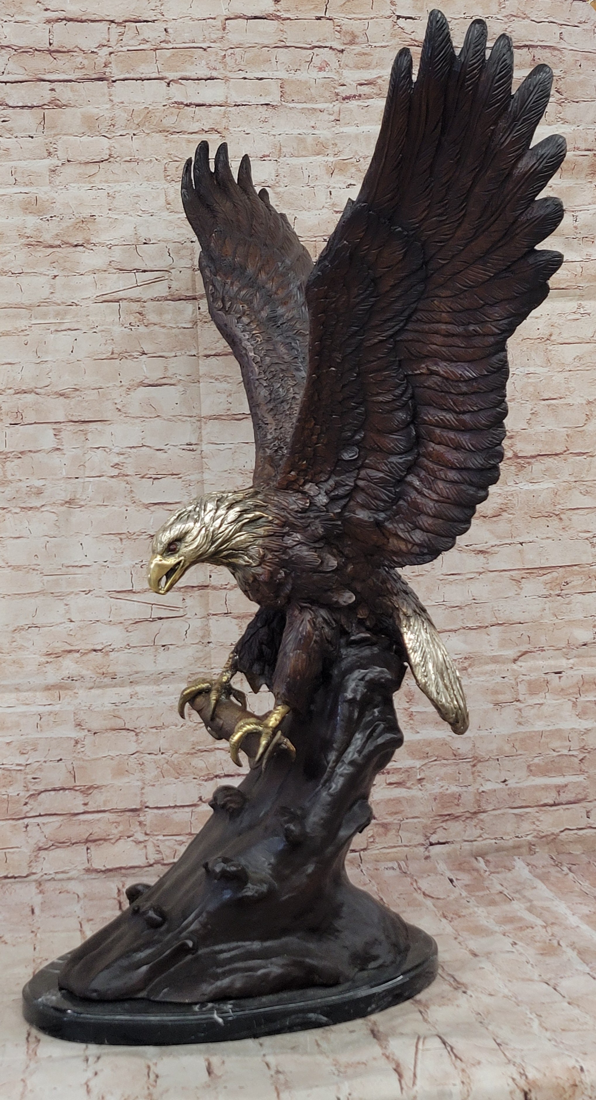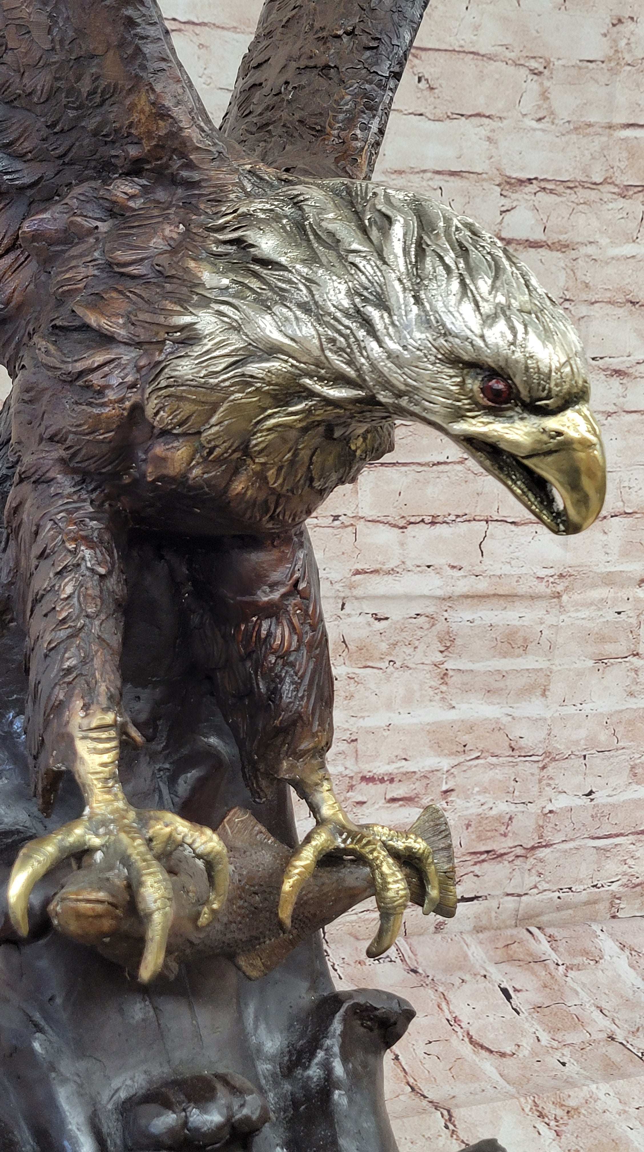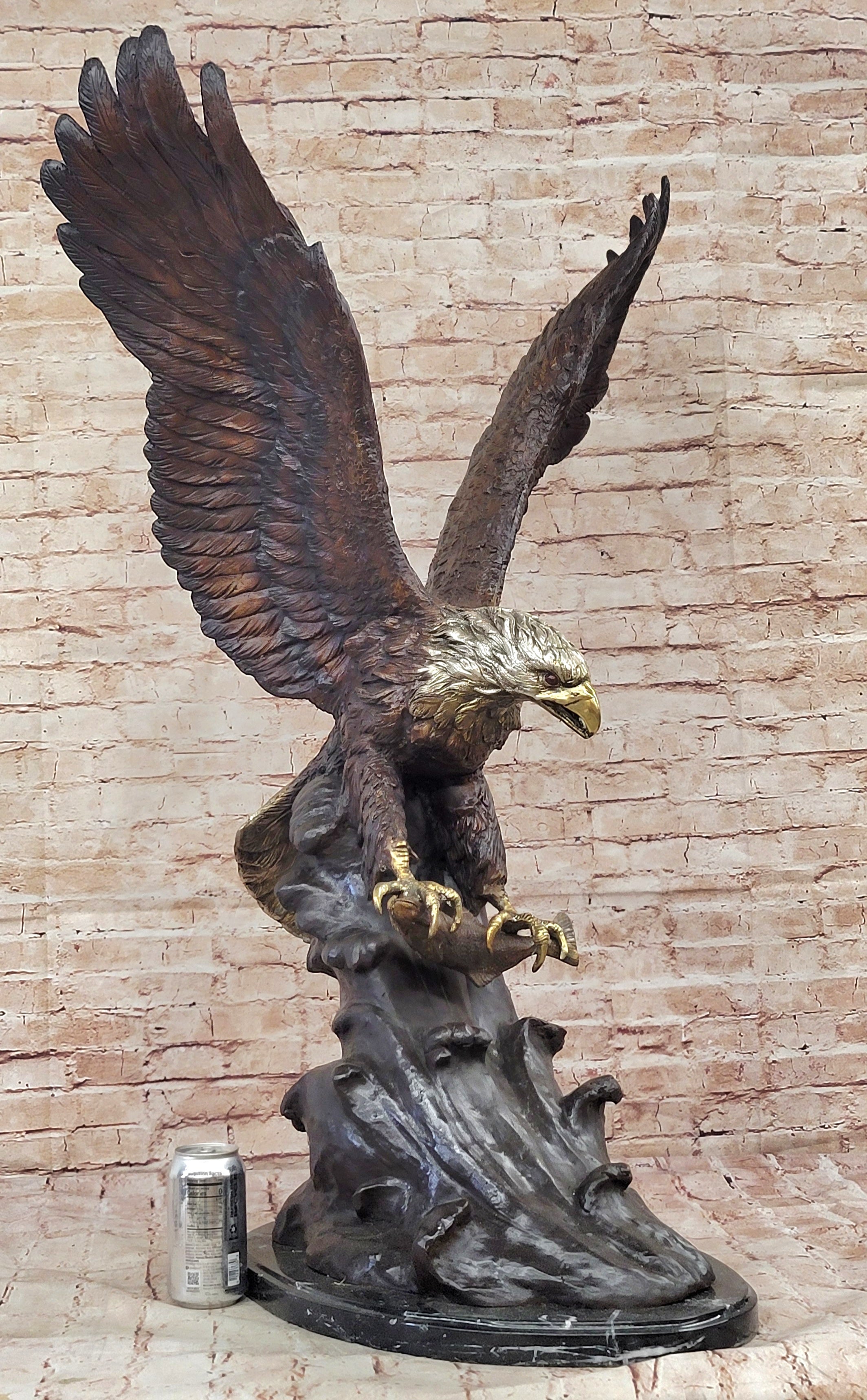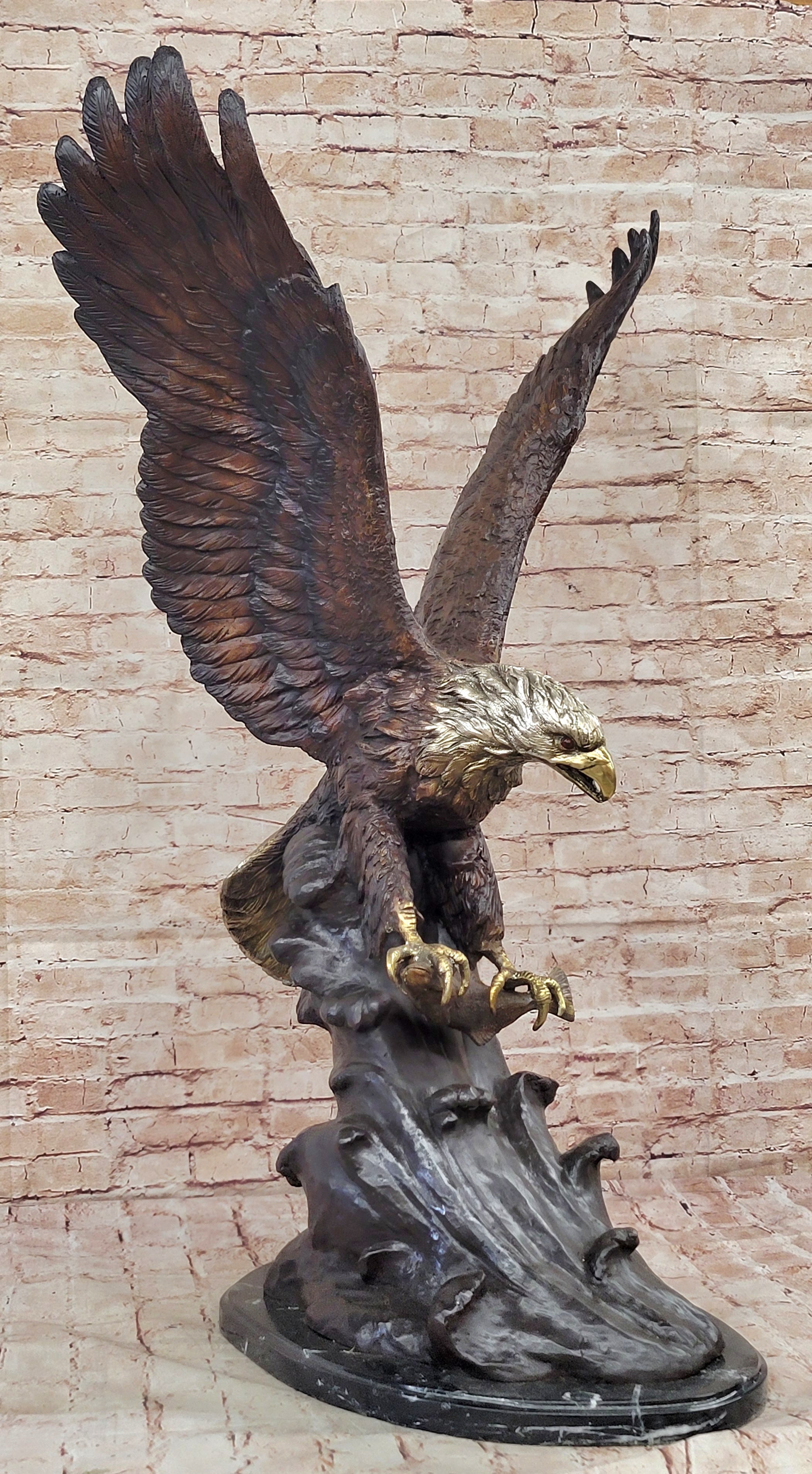 A large eagle swoops down towards earth and prepares to pluck its meal from the ocean. His talons are spread and his legs are extended just waiting to grapple its prey. Eagles are known for their extremely keen eyesight, which enables them to spot potential prey from a very long distance. This keen eyesight is primarily contributed by their extremely large pupils. This carefully detailed sculpture exhibits those eyes with a menacing glare. This is a sculpture that demands attention. 100% bronze and handmade,this multicolor brown, gold. white and black patina sculpture was cast using the "Lost Wax Method". sealed from the European Bronze Finery and is signed G.Mancini.Original or Reproduction: Original