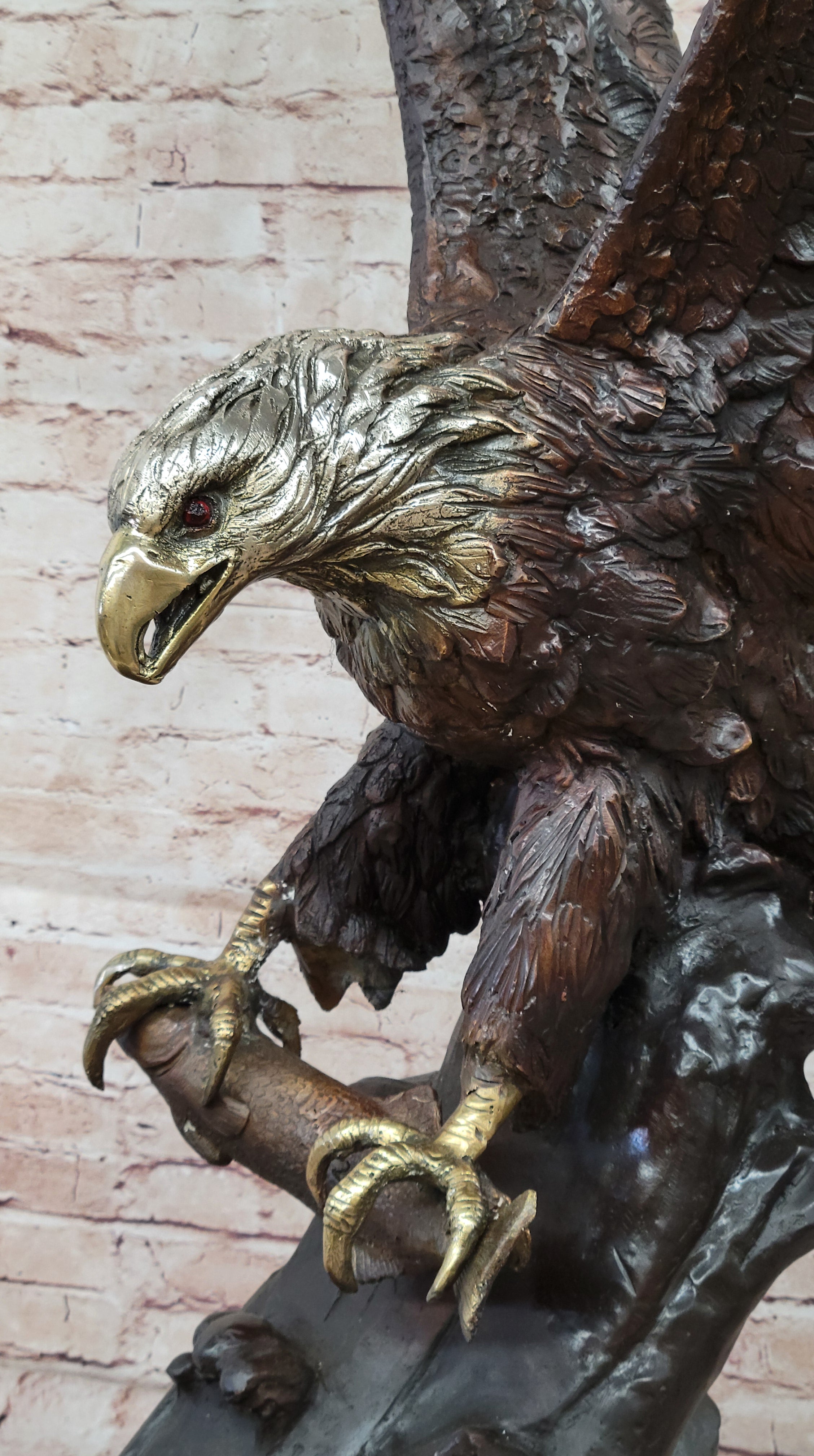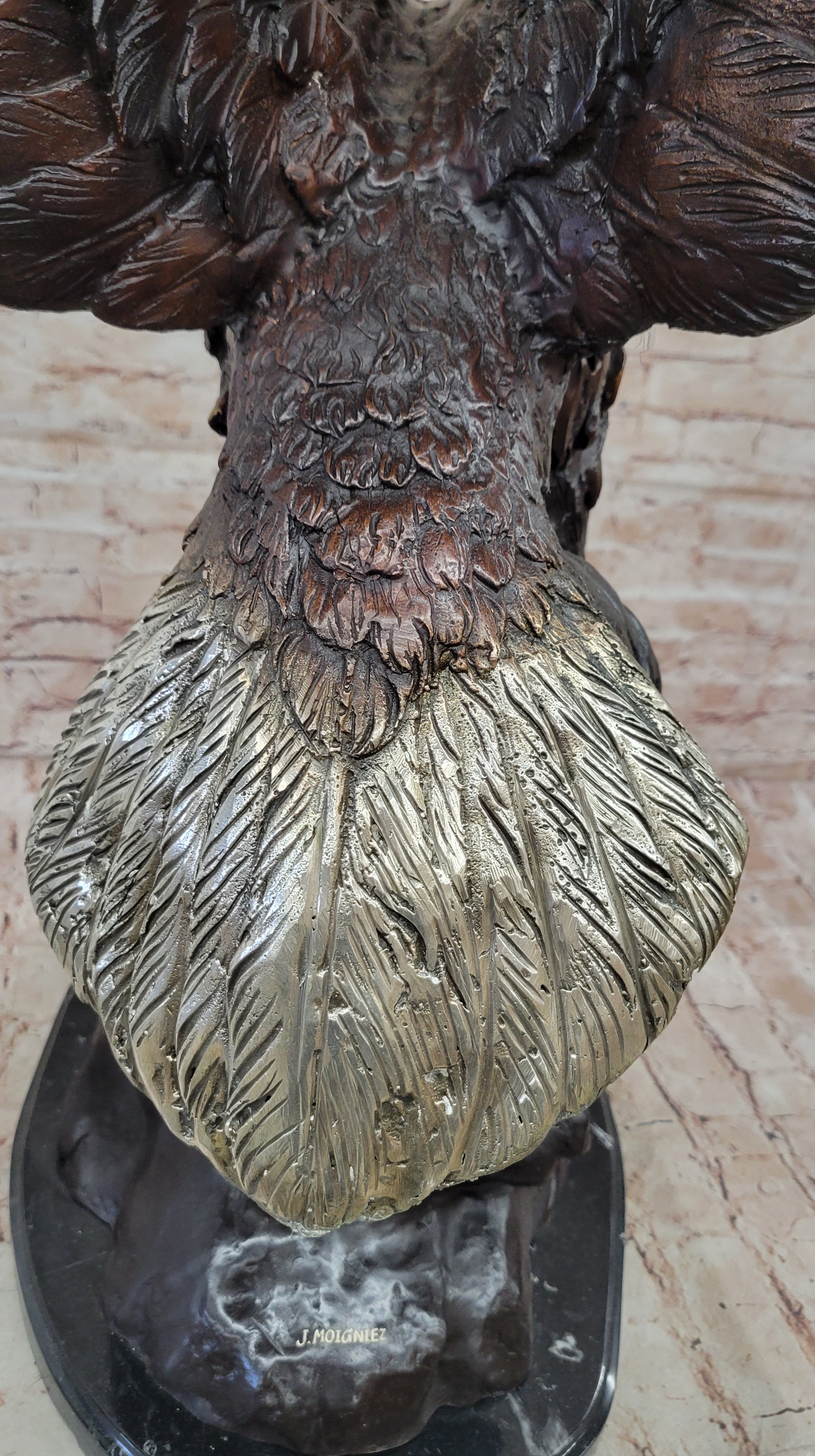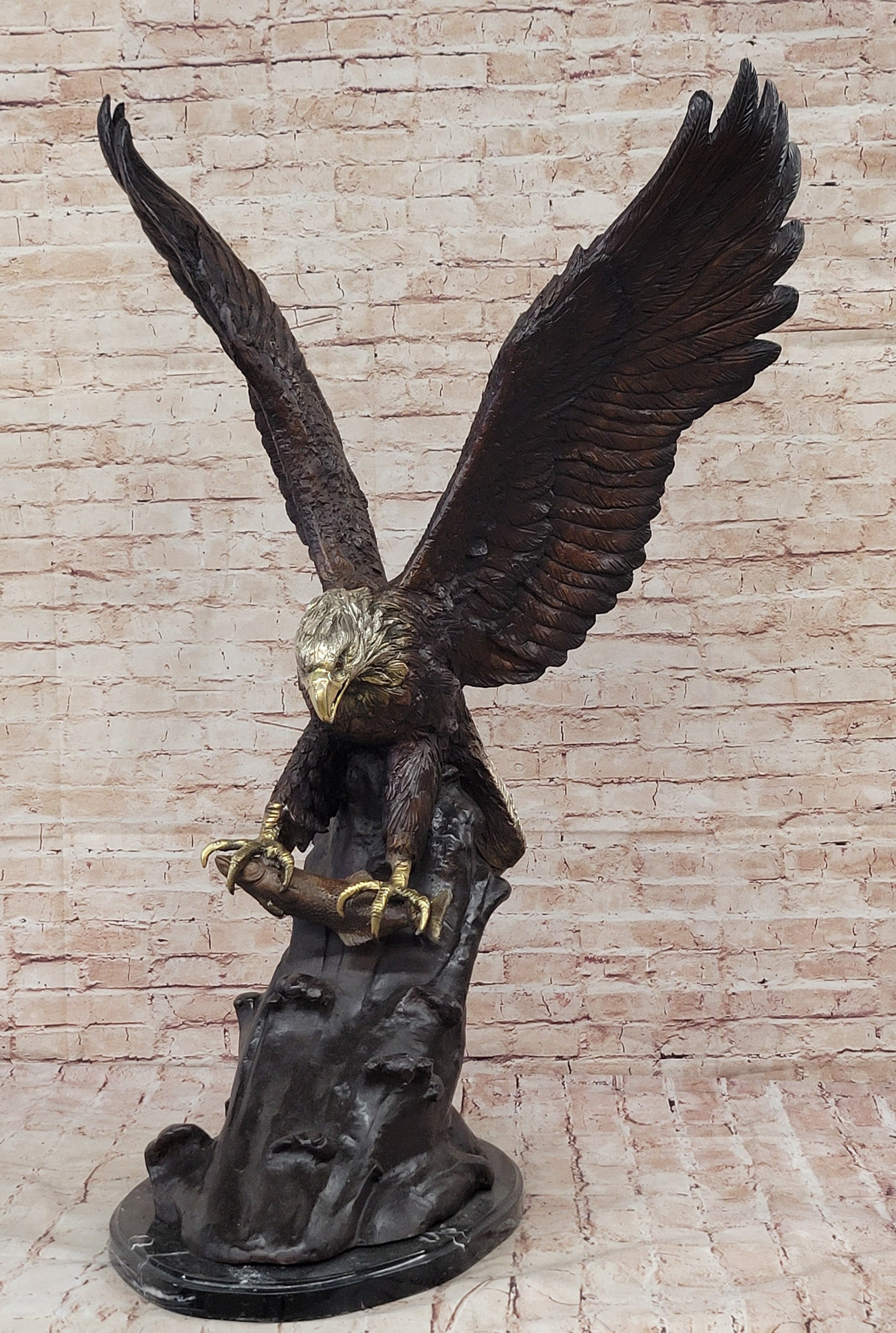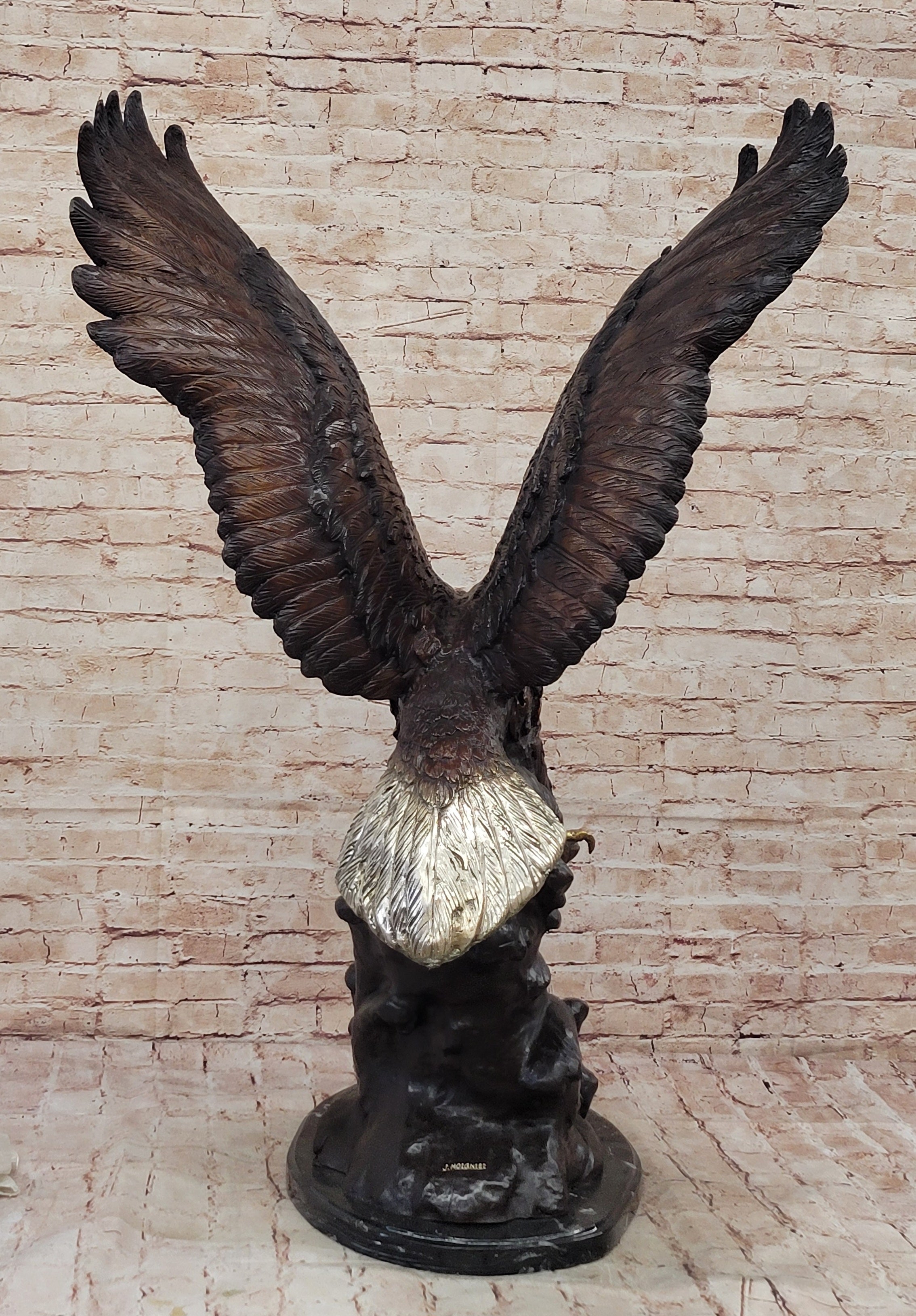 A large eagle swoops down towards earth and prepares to pluck its meal from the ocean. His talons are spread and his legs are extended just waiting to grapple its prey. Eagles are known for their extremely keen eyesight, which enables them to spot potential prey from a very long distance. This keen eyesight is primarily contributed by their extremely large pupils. This carefully detailed sculpture exhibits those eyes with a menacing glare. This is a sculpture that demands attention. 100% bronze and handmade,this multicolor brown, gold. white and black patina sculpture was cast using the "Lost Wax Method". sealed from the European Bronze Finery and is signed G.Mancini.Original or Reproduction: Original