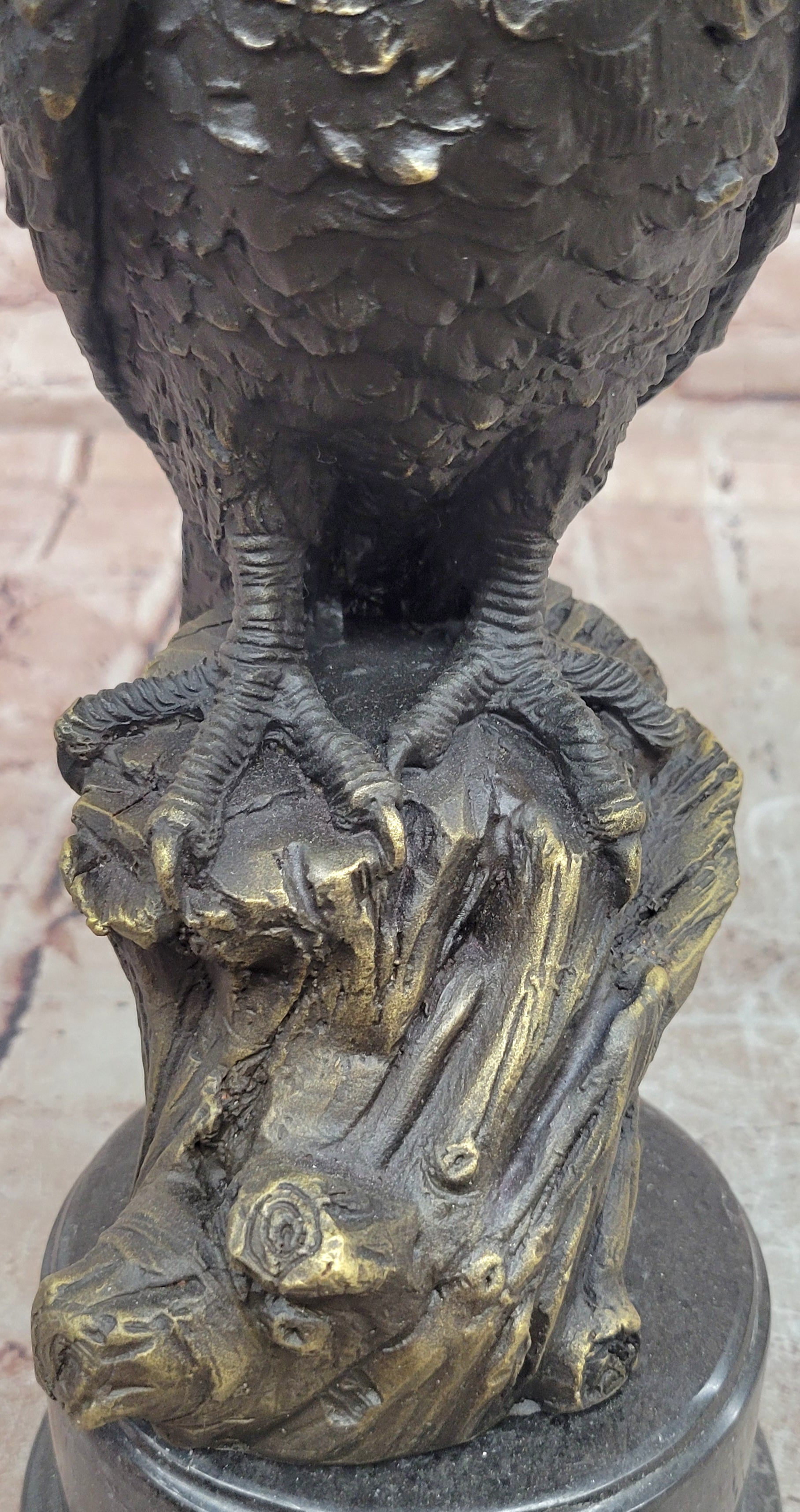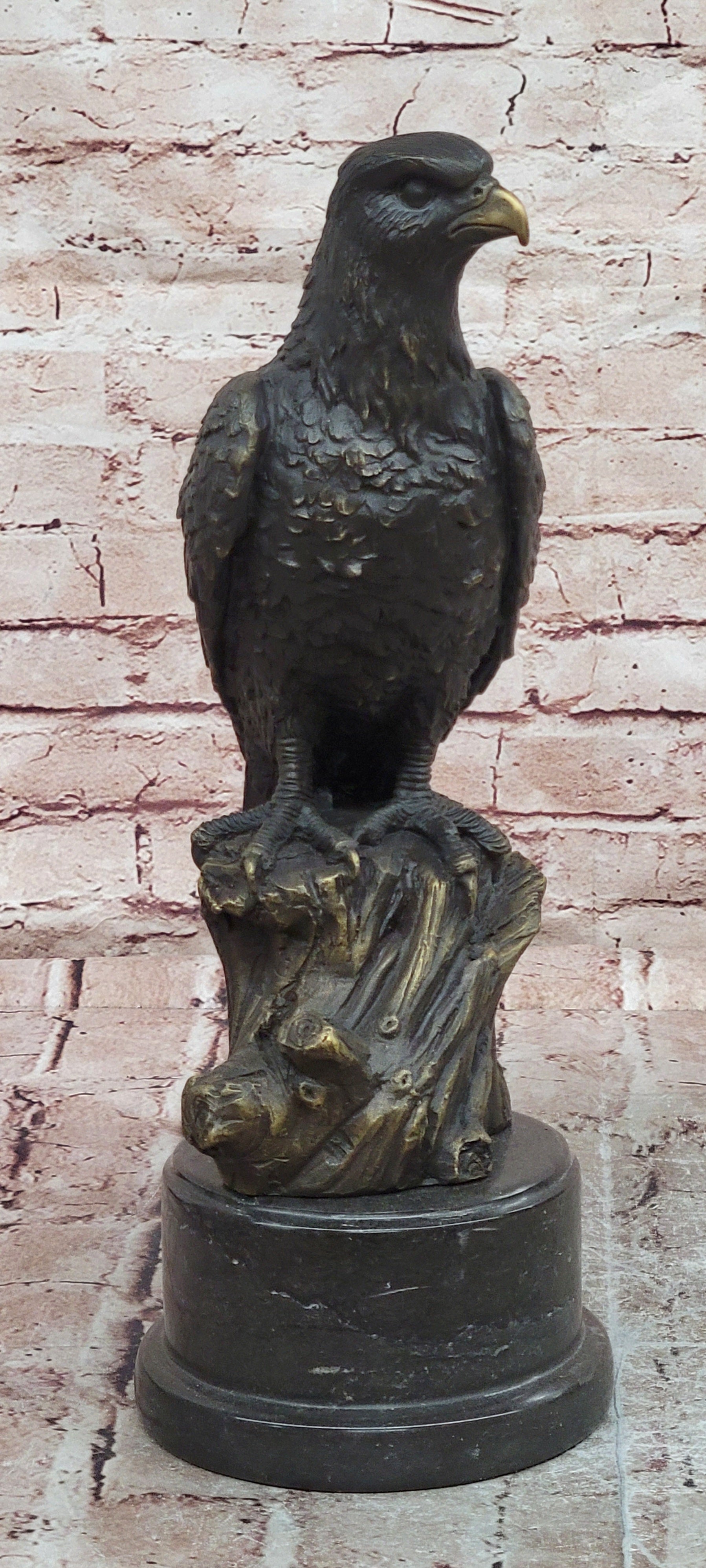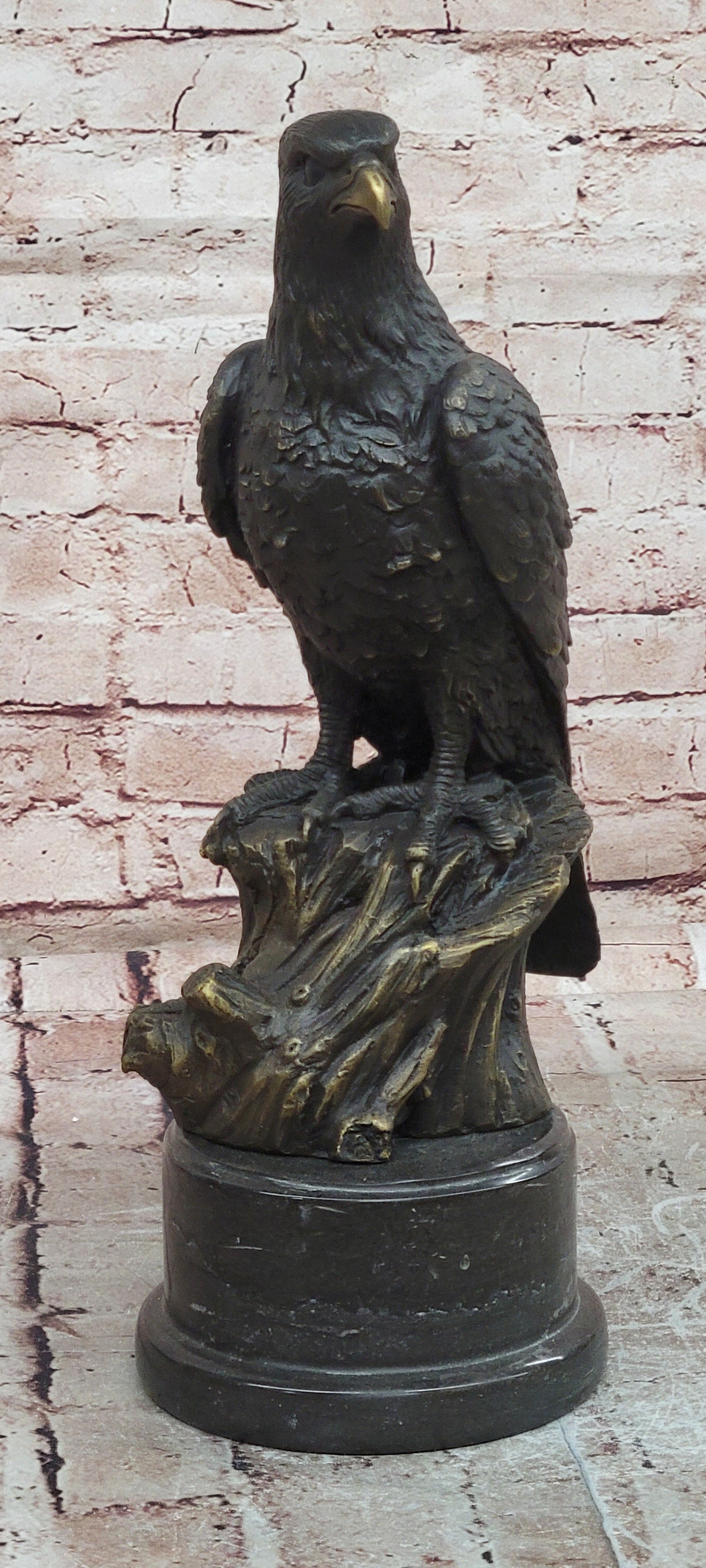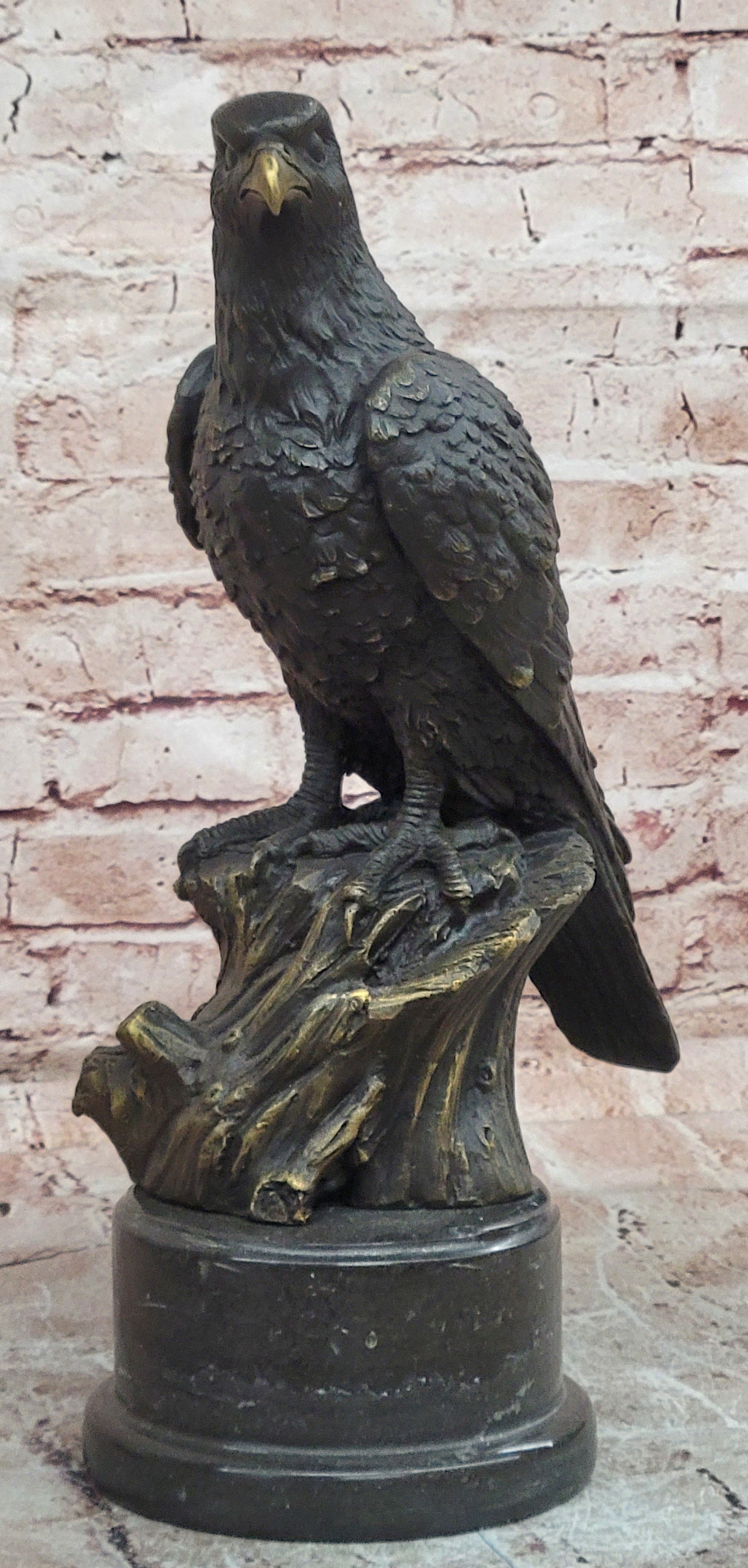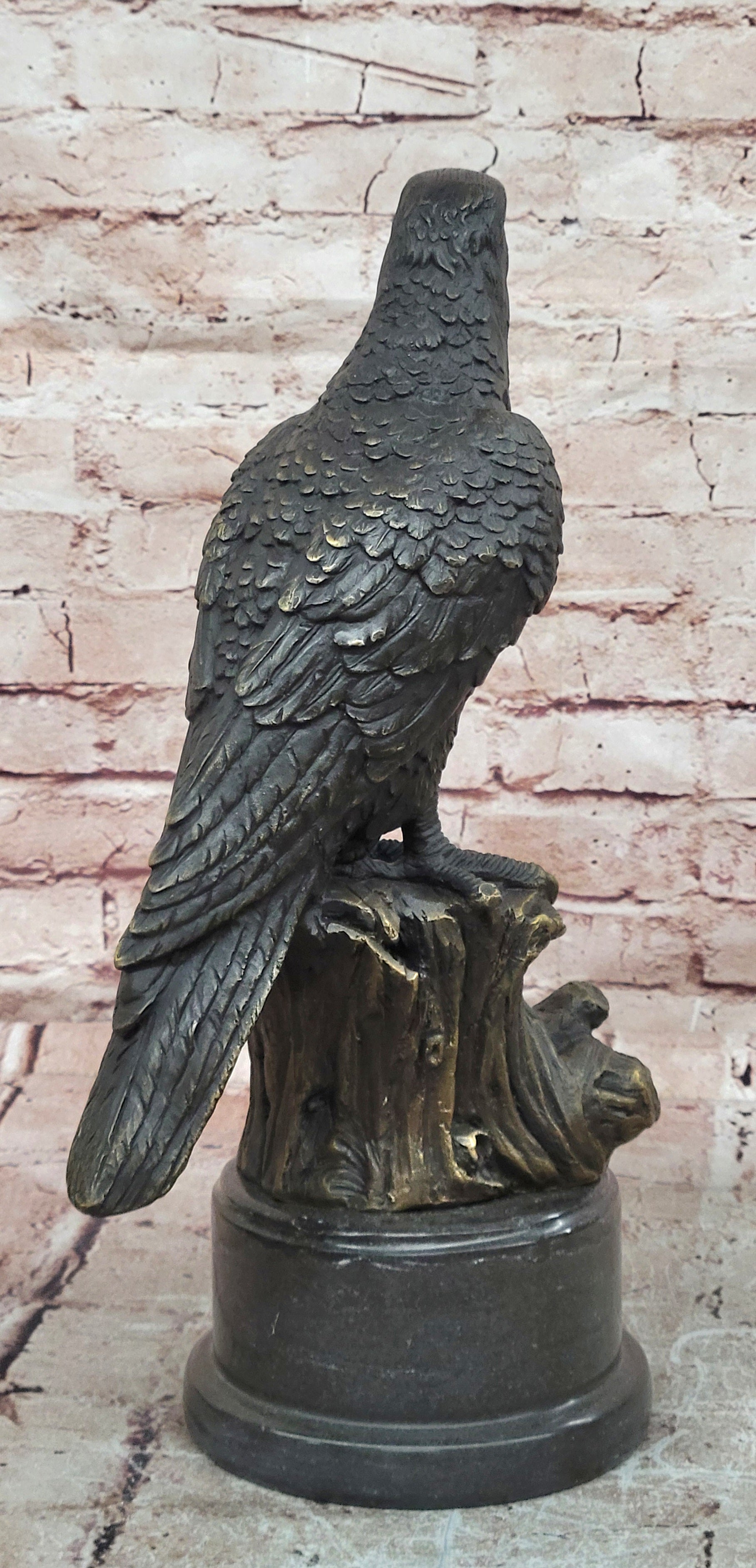 The figure is mounted on a round black marble base, providing a solid and elegant foundation that complements the rich tones of the bronze. Ideal for home, office, or cabin décor, this timeless animal sculpture is a bold statement piece and a meaningful gift for bird lovers, wildlife enthusiasts, and collectors of fine bronze art.Bronze Dimensions with Marble Base: Height 15" x Width 6"