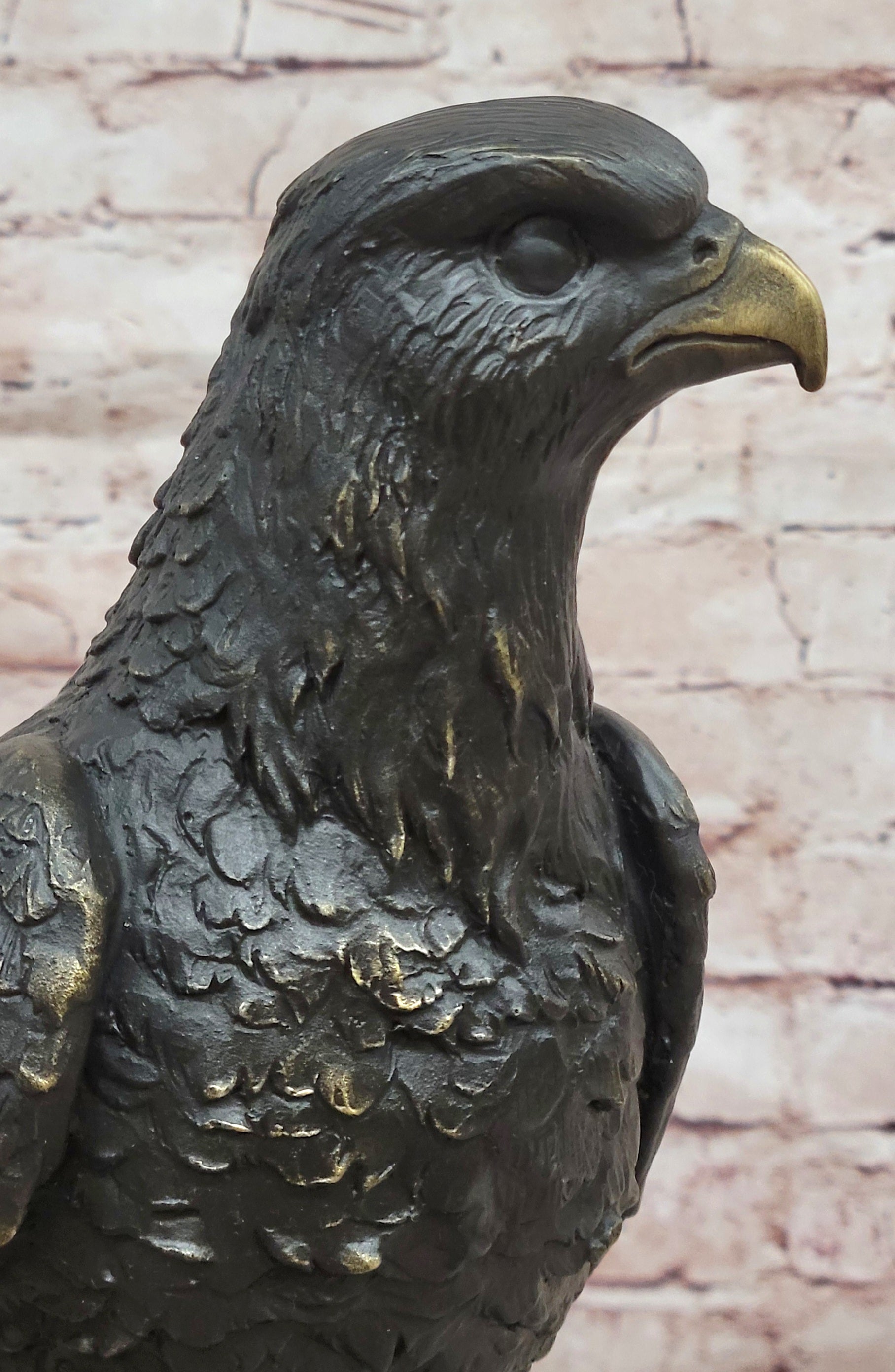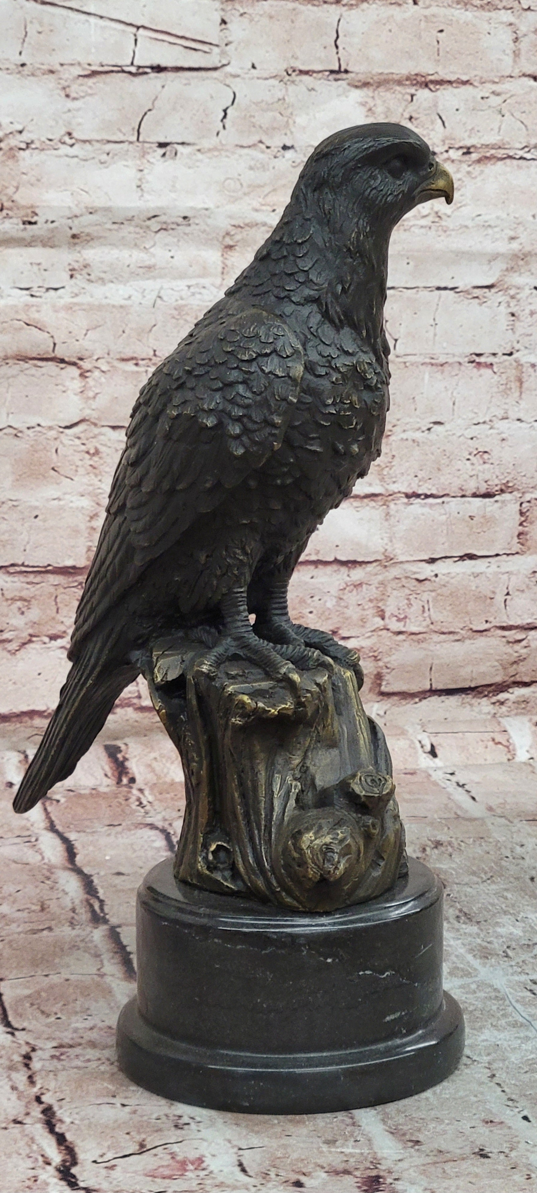 This powerful bronze sculpture captures the commanding presence of an eagle, often associated with hawks and falcons, portrayed in a moment of alert intensity. The bird’s sharp gaze, outstretched wings, and strong talons convey strength, freedom, and dominance, making this piece a striking representation of wildlife in motion. The dynamic posture and finely rendered feathers bring a sense of realism and energy that immediately draws the eye.