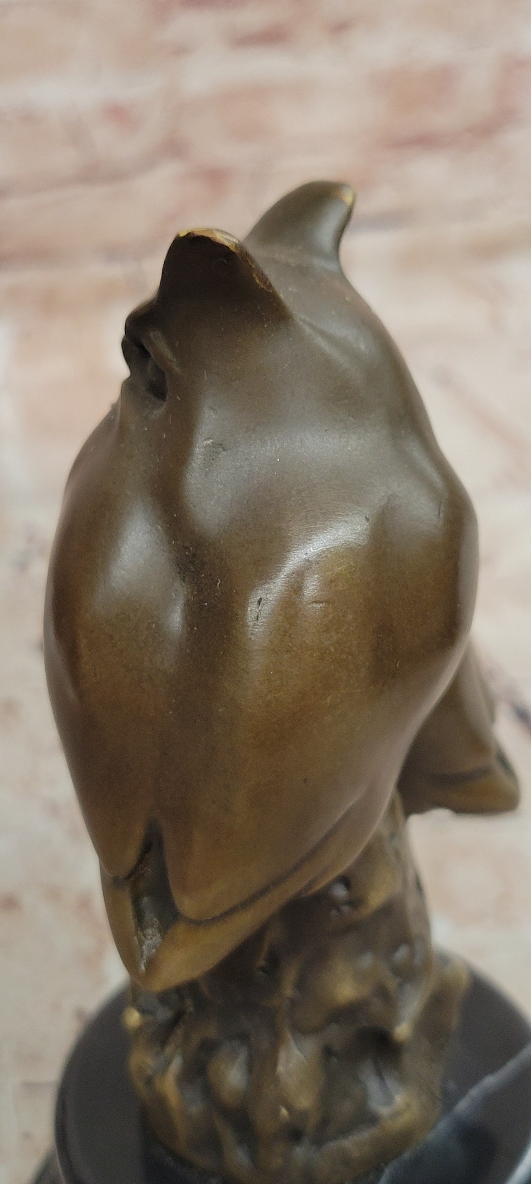 Hand made using the traditional lost wax method, this genuine bronze sculpture showcases fine craftsmanship and exceptional detail. The rich brown patina enhances the textures of the feathers and forms, giving the piece depth and warmth. It is securely mounted on a round black marble base, providing both stability and an elegant contrast to the bronze tones.