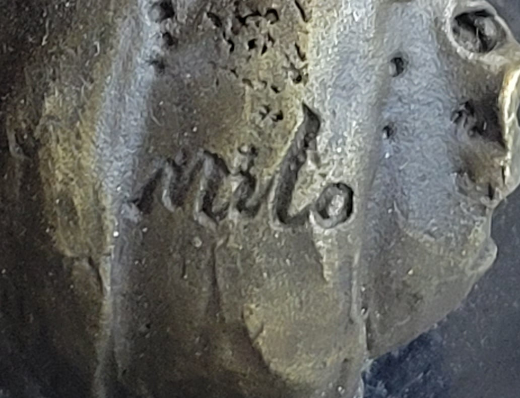 Majestic Struggle: Eagles in Combat This stunning bronze sculpture vividly captures the fierce and unrelenting nature of eagles as two magnificent birds engage in a battle for dominance. The sculpture presents a powerful scene where one eagle, poised to assert its superiority, is on the verge of driving its talons into its adversary. The intensity and drama of the struggle are brought to life with intricate detailing, showcasing the raw determination of these majestic creatures. A Testament to Nature's Power The sculpture also portrays the defiant resistance of the second eagle, using its mighty wings in a desperate attempt to fend off the impending attack. The force of their clash is palpable, with the adversary's body crashing into the surface in its effort to survive. This artwork offers a rare glimpse into the aggressive side of nature, celebrating the primal power and resilience of these birds of prey. Exquisite Craftsmanship and Enduring Beauty Crafted with meticulous attention to detail, this bronze masterpiece was created using the time-honored lost-wax casting method, ensuring every nuance is captured. The sculpture is mounted on a black marble base, which not only provides a stable foundation but also enhances its visual impact. Signed by the artist Milo, this piece is a testament to both the awe-inspiring power of nature and the exceptional artistry behind its creation. It's a captivating addition to any art collection, immortalizing the fierce beauty of the natural world.