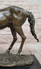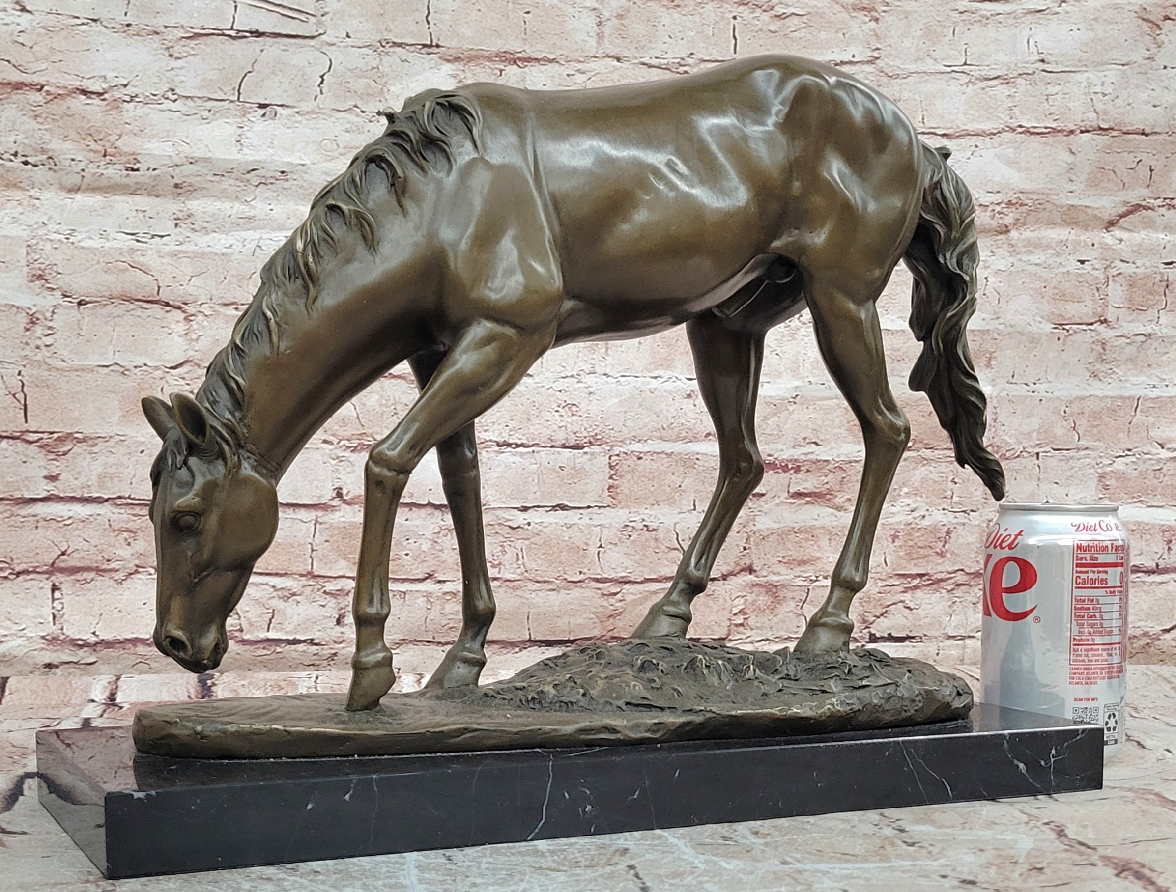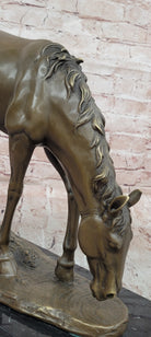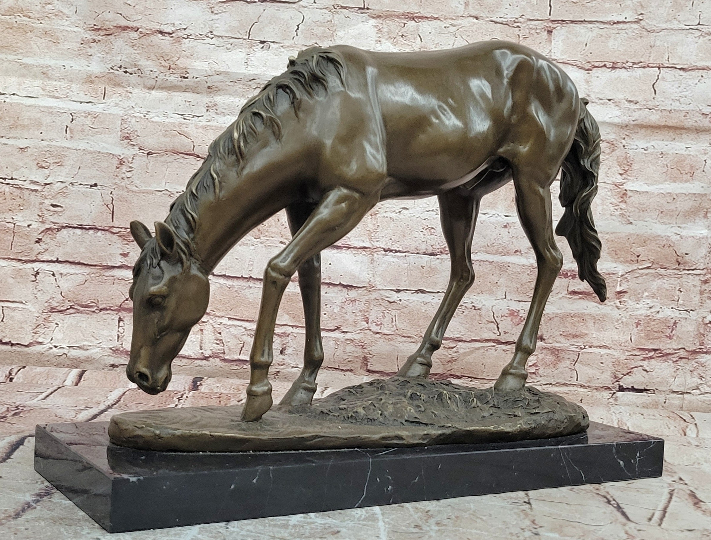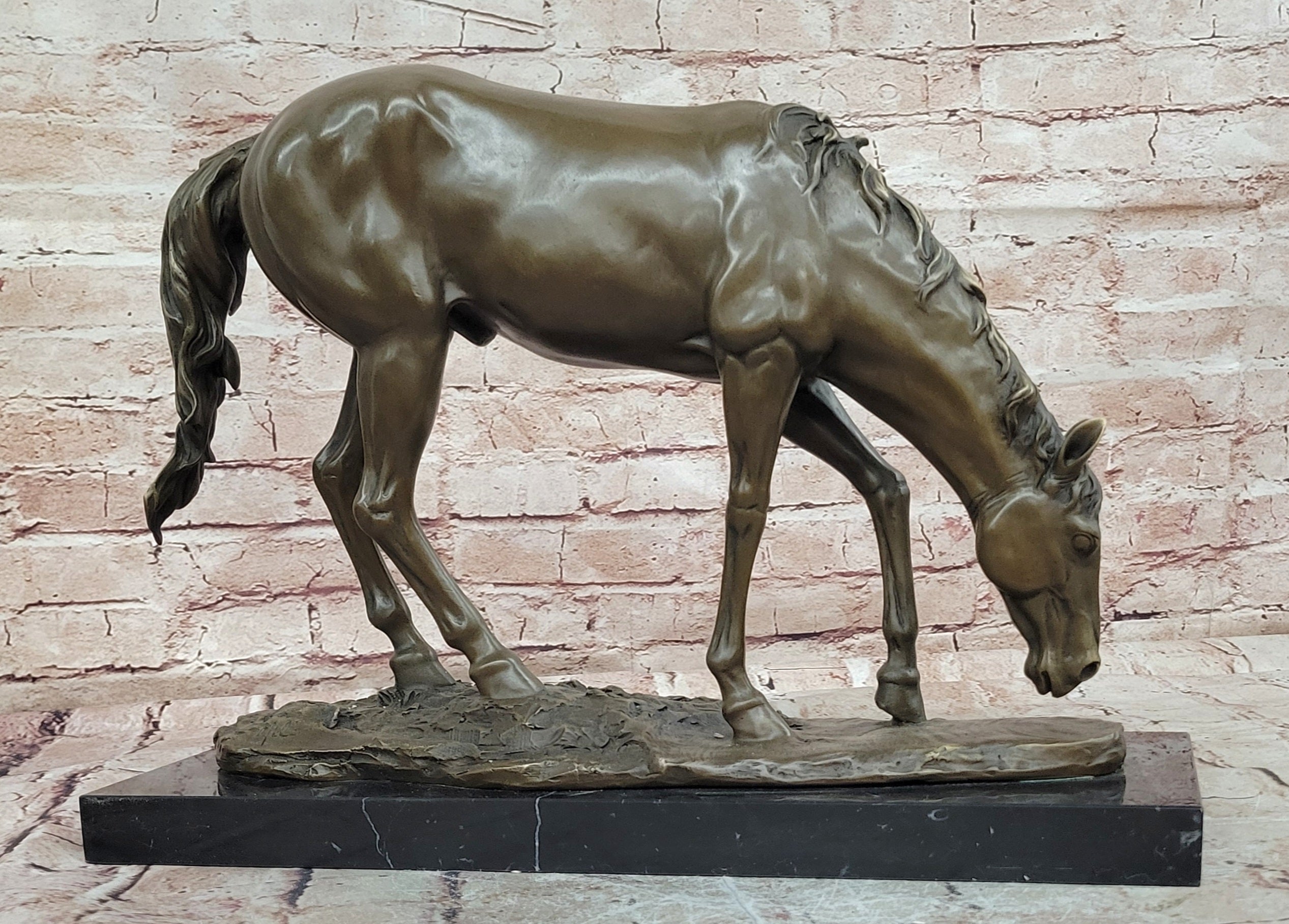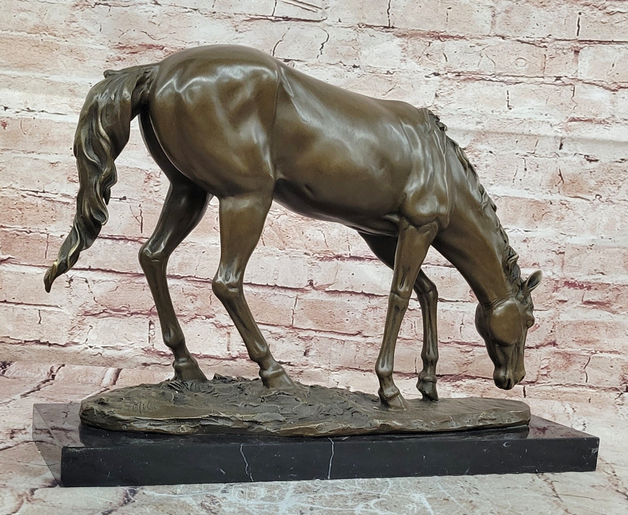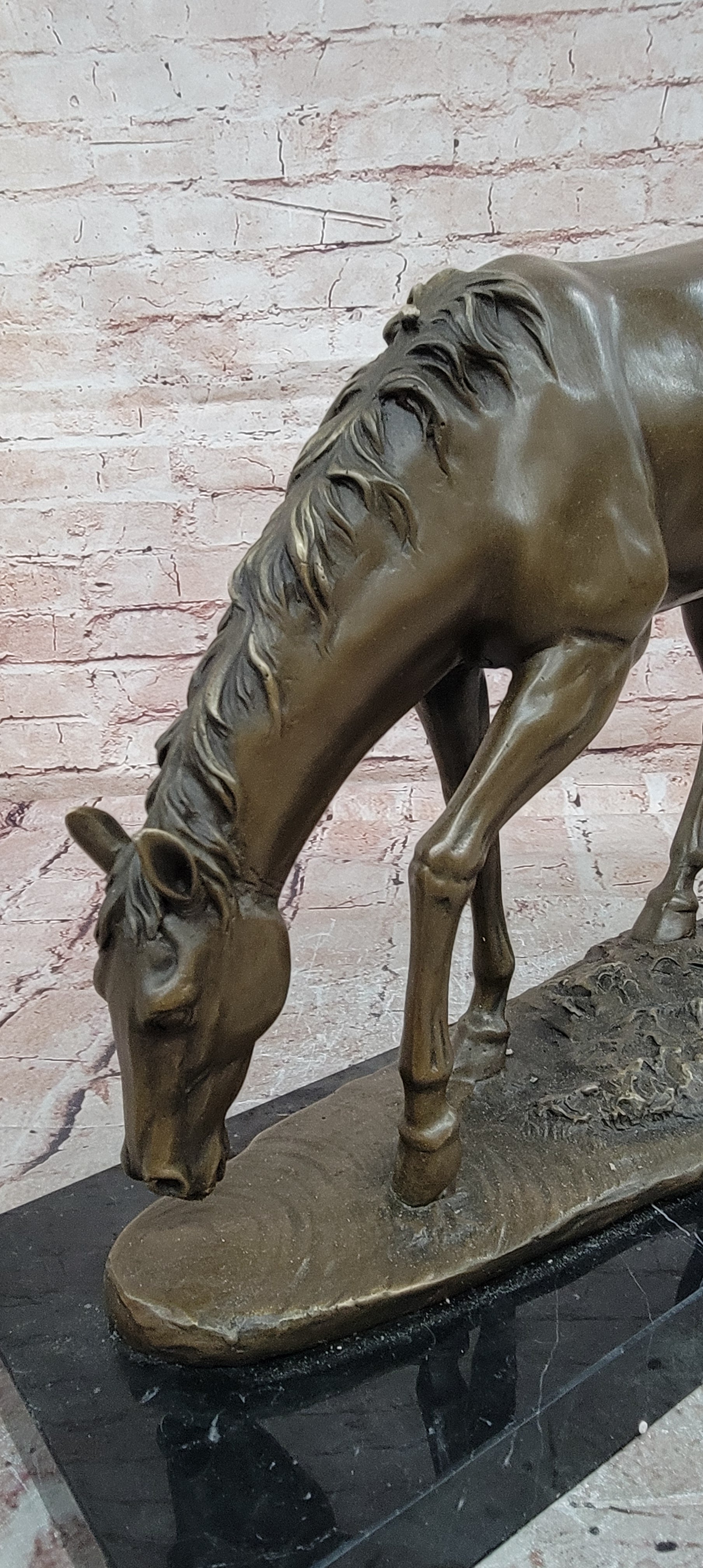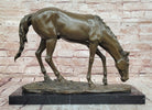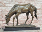Grazing Horse Bronze Sculpture with Naturalistic Detail on Black Marble Base