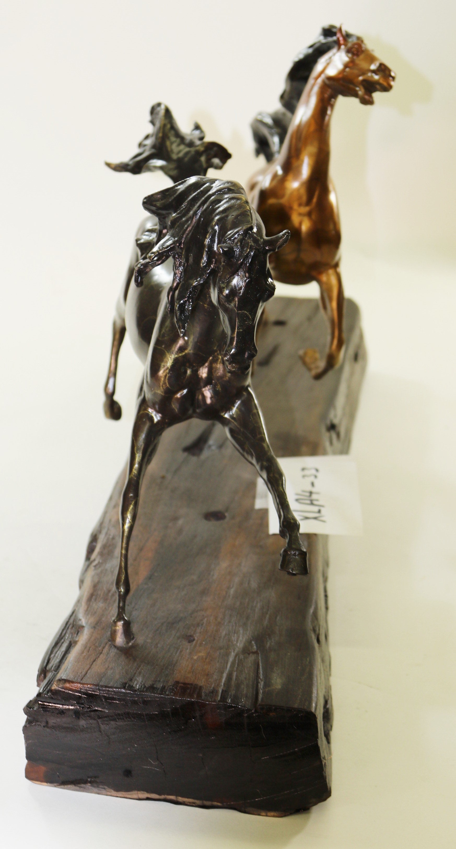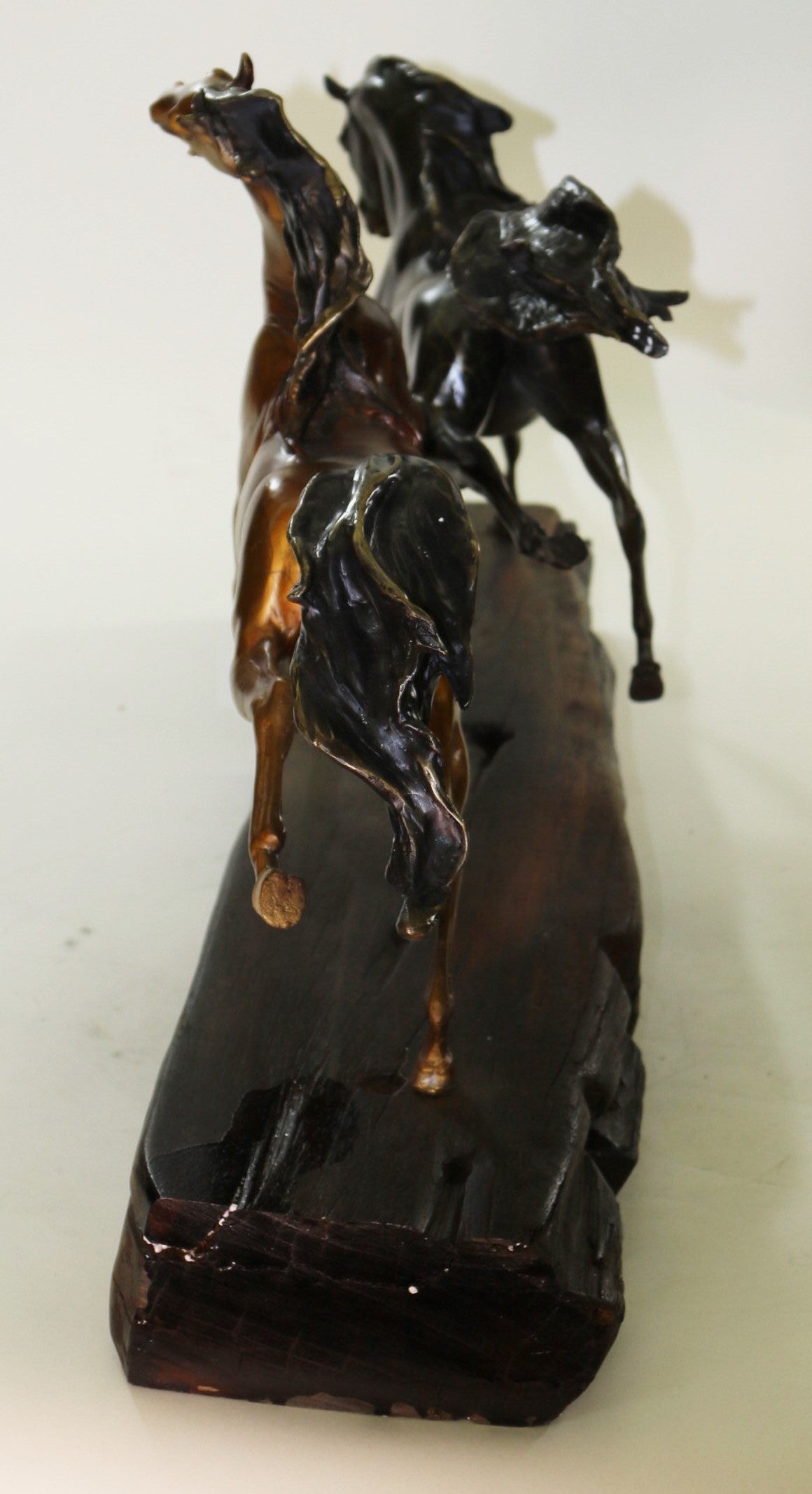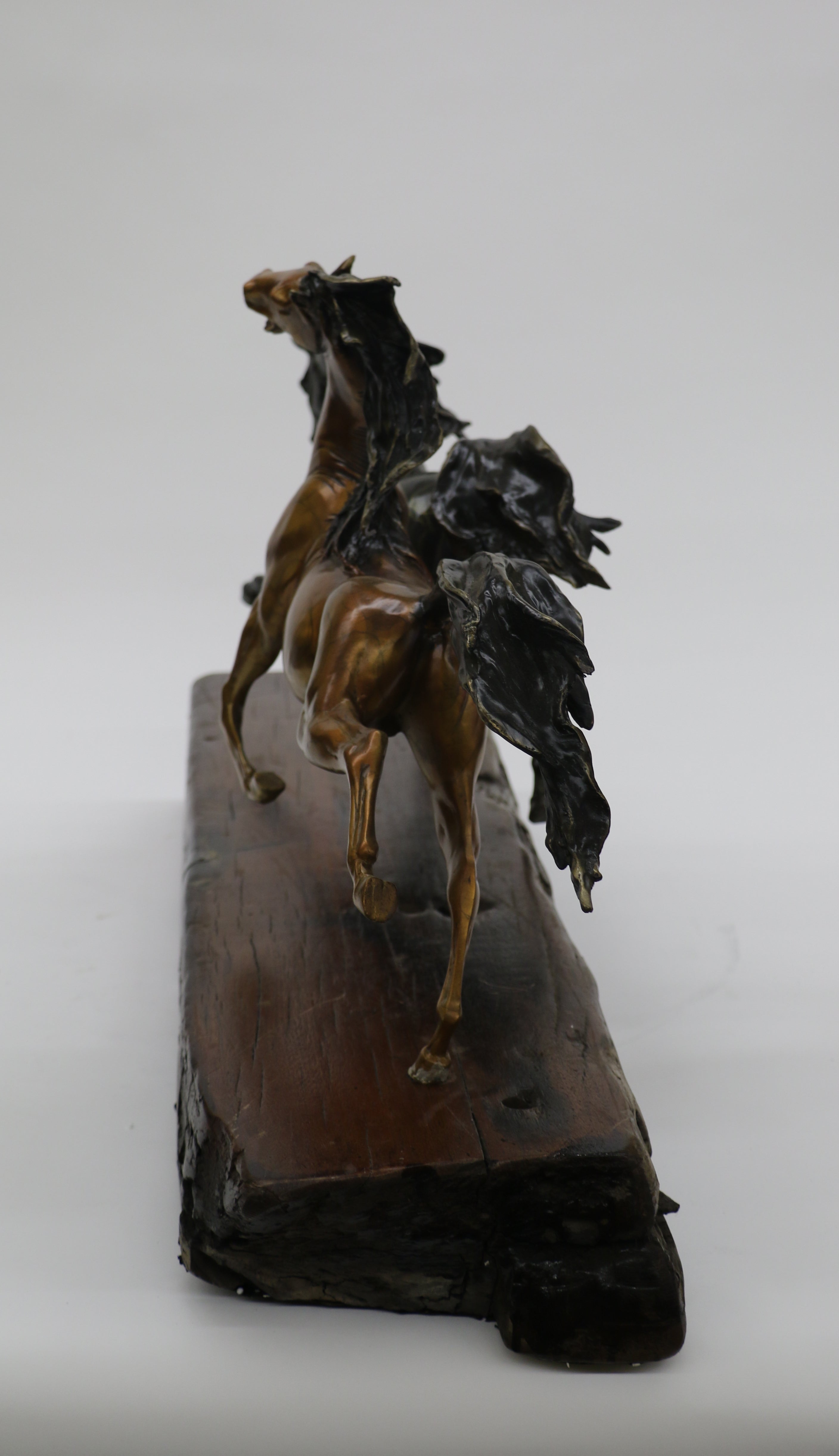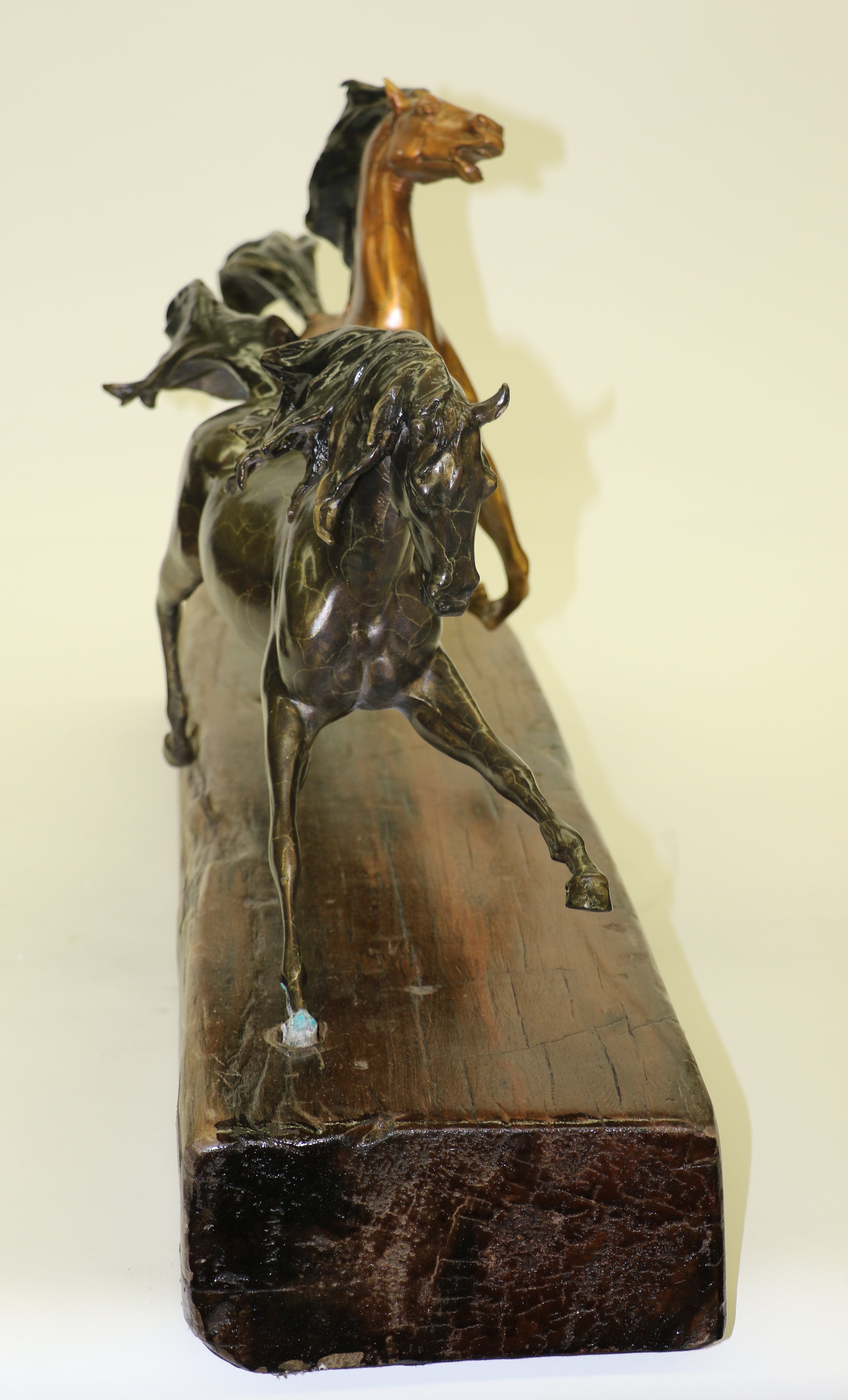 Horses are known and loved for their agility, graceful movement,strong bodies and sleek coat. They ignite a feeling of freedom and uncharted paths. This sculpture is perfect for any horse lover, collector or a free spirit refusing to be tamed. Three wild horses are free of all reins, saddles and demanding cowboys. They gallop freely in the open land, feeling the moist soil beneath their hooves. 100% bronze and handmade, this Multi Color patina sculpture was cast using the "Lost Wax Method" and mounted on natural Oak Wood base and is signed and numbered by Artist Milo.Bronze Dimensions with Wood Base:Height 18" x Width 37"