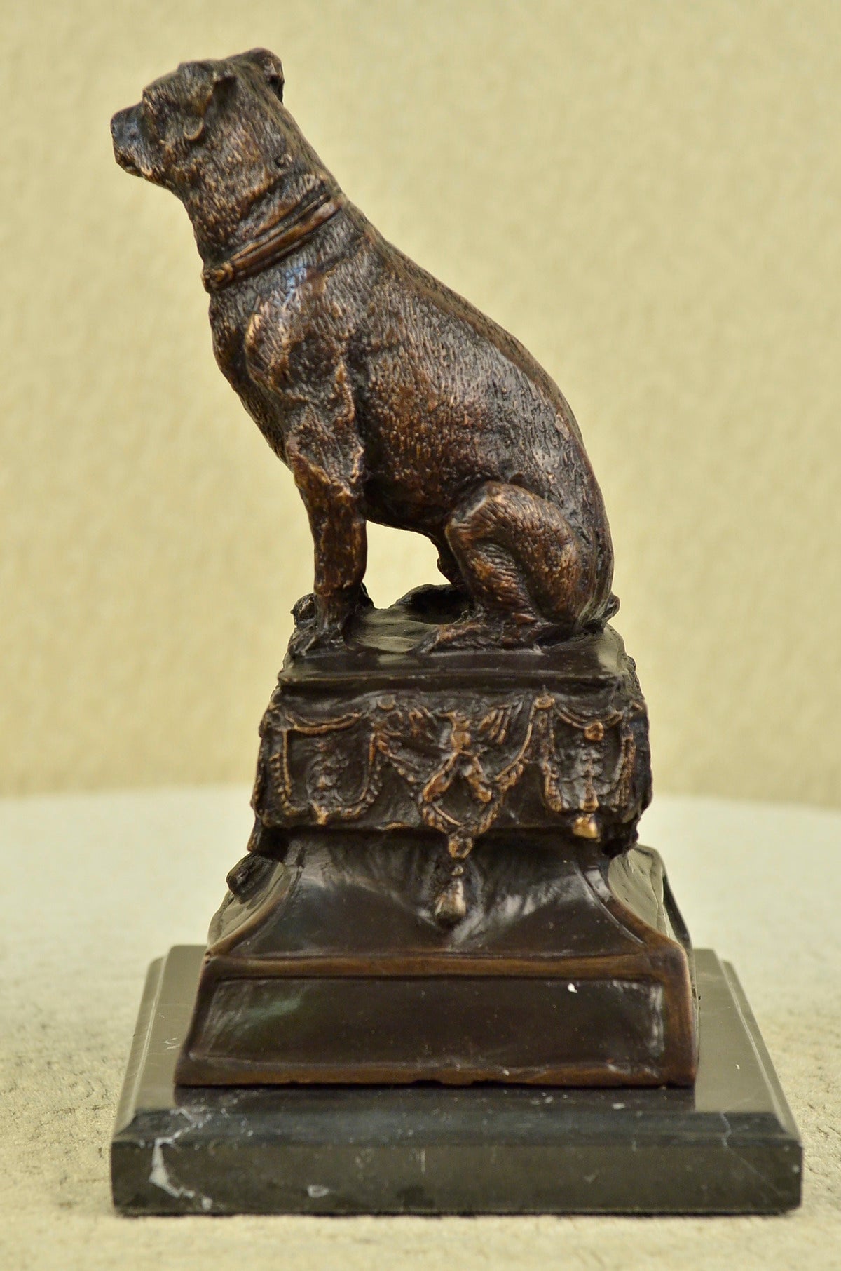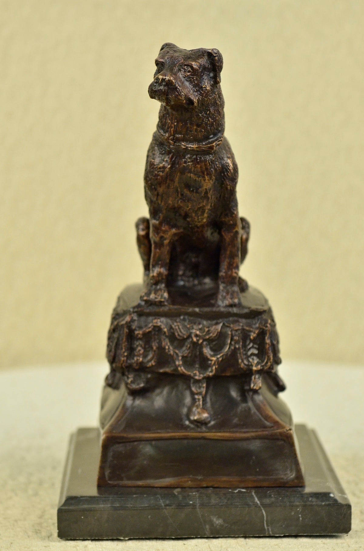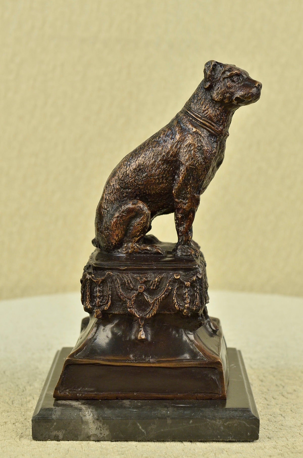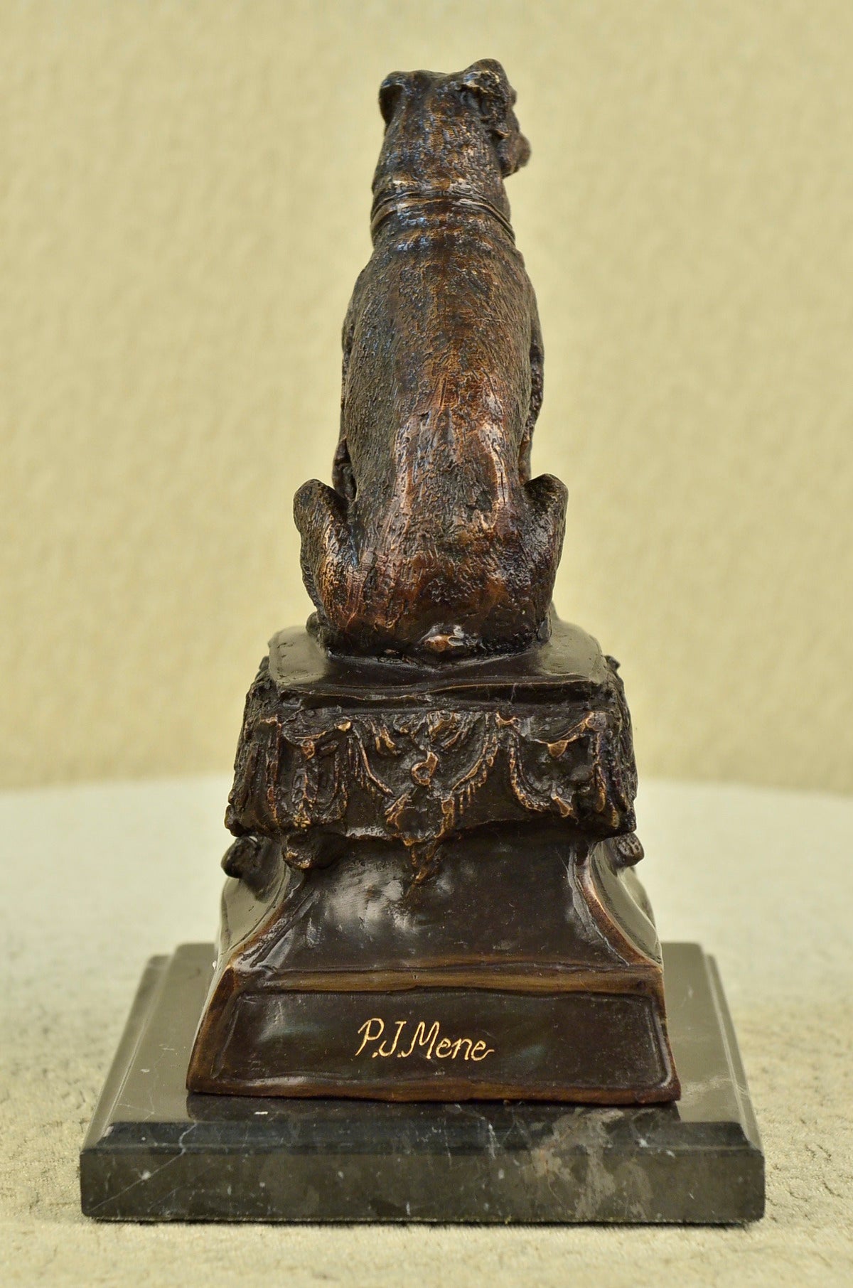 The Labrador is the most popular breed of dog in the world. The dogs of this breed are very loving, kind, and compassionate to their master. A breed characteristic is webbed paws for swimming, useful for the breeds original purpose of retrieving nets. This and their subsequent use as hunting companions, gave them the name retriever. This sculpture was certainly made to honor the breed, with the dog being placed on an ornately decorated base. They are a very loyal animal; truly a man`s best friend. The sculpture is made of 100% pure bronze with a brown patina and is set on a black marble base. It is signed P.J. Mene.Bronze Dimensions with Marble Base:Height 12" x Width 7"