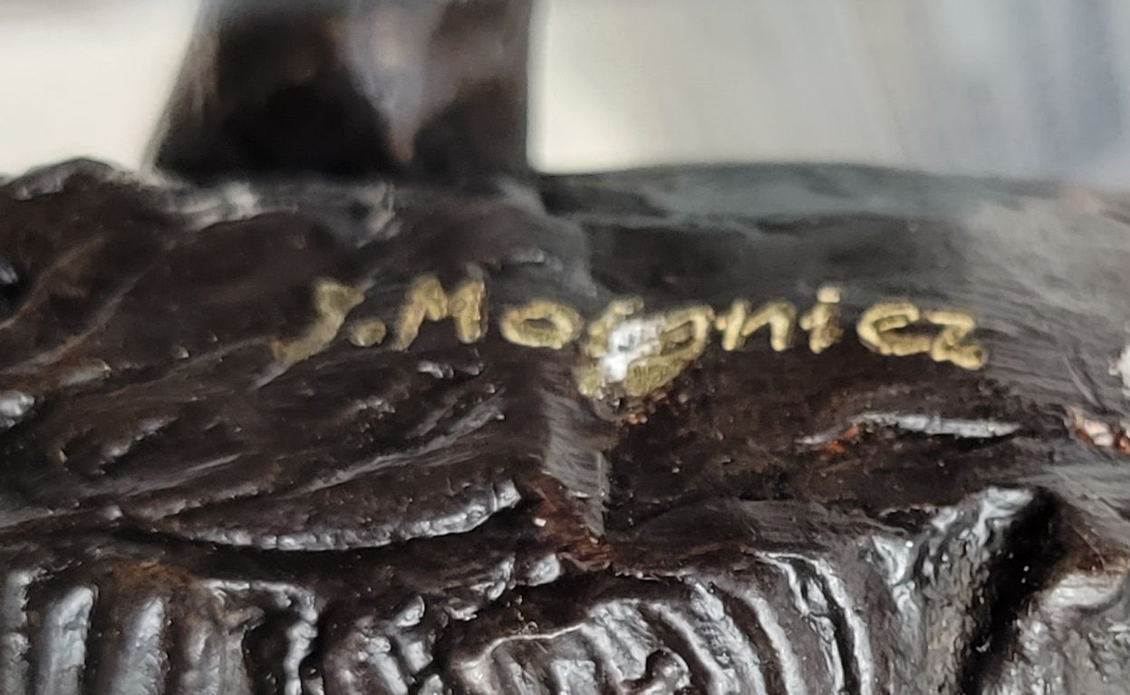 Mounted on a black marble base, this sculpture becomes a striking focal point, whether displayed in a home, office, or gallery. The artist Moigniez's signature further enhances its quality and artistic value. Invite the spirit of the wild boar into your space and embrace the symbolism of strength and determination that it embodies.Bronze Dimensions with Marble Base: Height 9 1/2" X Width 12"