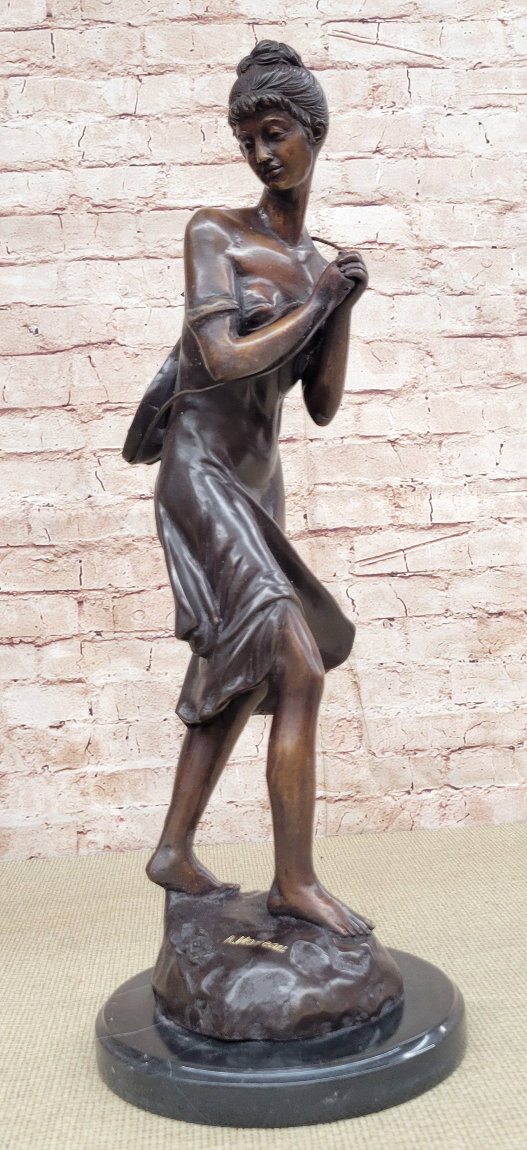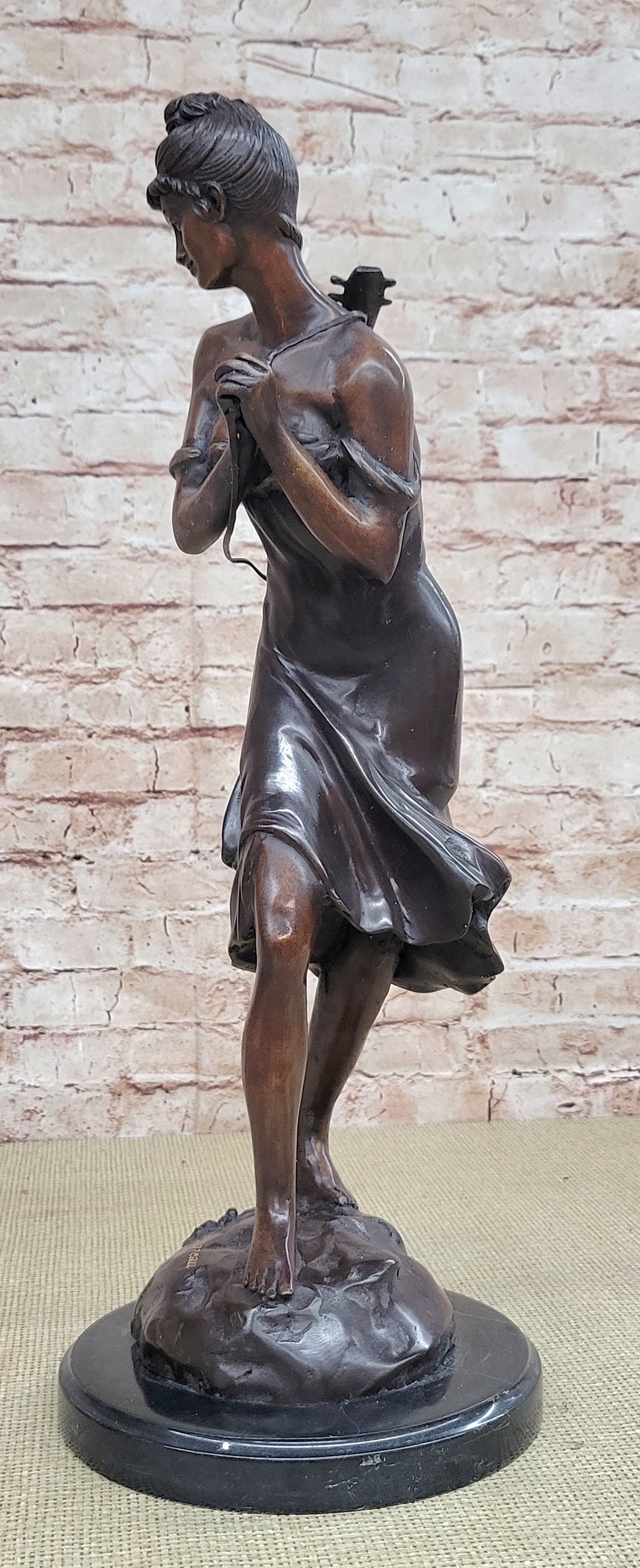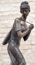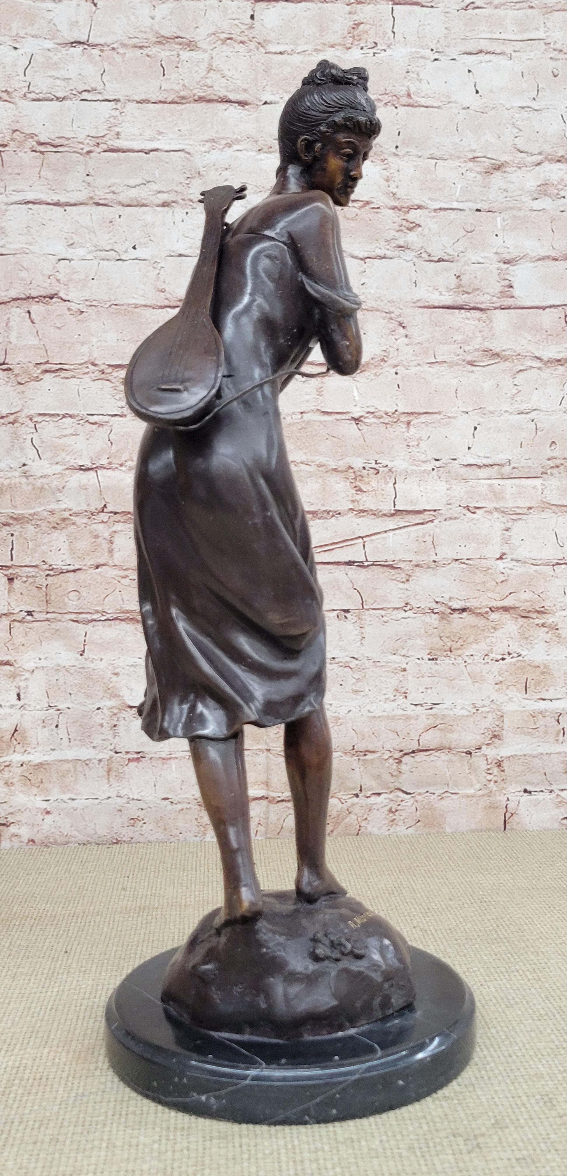 This stunning beauty takes a walk through the forest, as she is going to her favorite little getaway. She looks to her right and with a graceful smiles thinks about all the time she will have to herself. She passes time by playing her old fashion guitar, which she is holding by a string that is wrapped around her upper body. The gorgeous lady wears this amazing dress that flows in the bottom, while the top caress her torso, it falls off her shoulders for a more sexy wear. Her hair is up in this absolute adorable and neatly made bun, with little bangs left up front. While she walks down the pathway to escape the world, her dress moves from one side to the other. The work of art is casted using the ancient old "Lost Wax Method" stained in brown patina for preservation. 100% handmade and 100% bronze, mounted atop a black marble base and its signed by the artist A. Moreau.Bronze Dimensions with Marble Base:Height 20 1/2" x Width 7" Marble Dimensions: diameter 7".