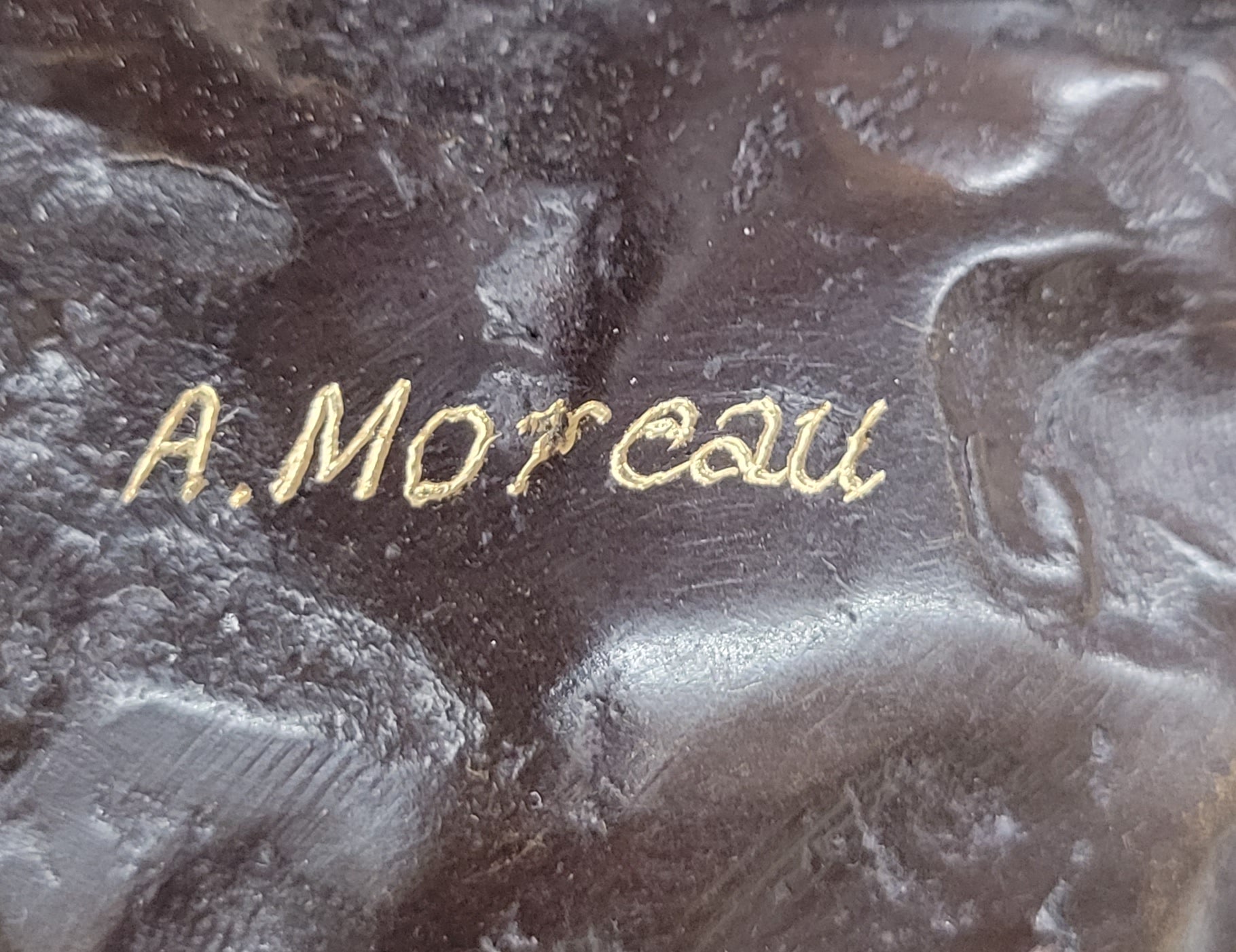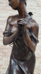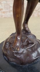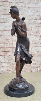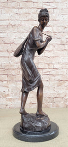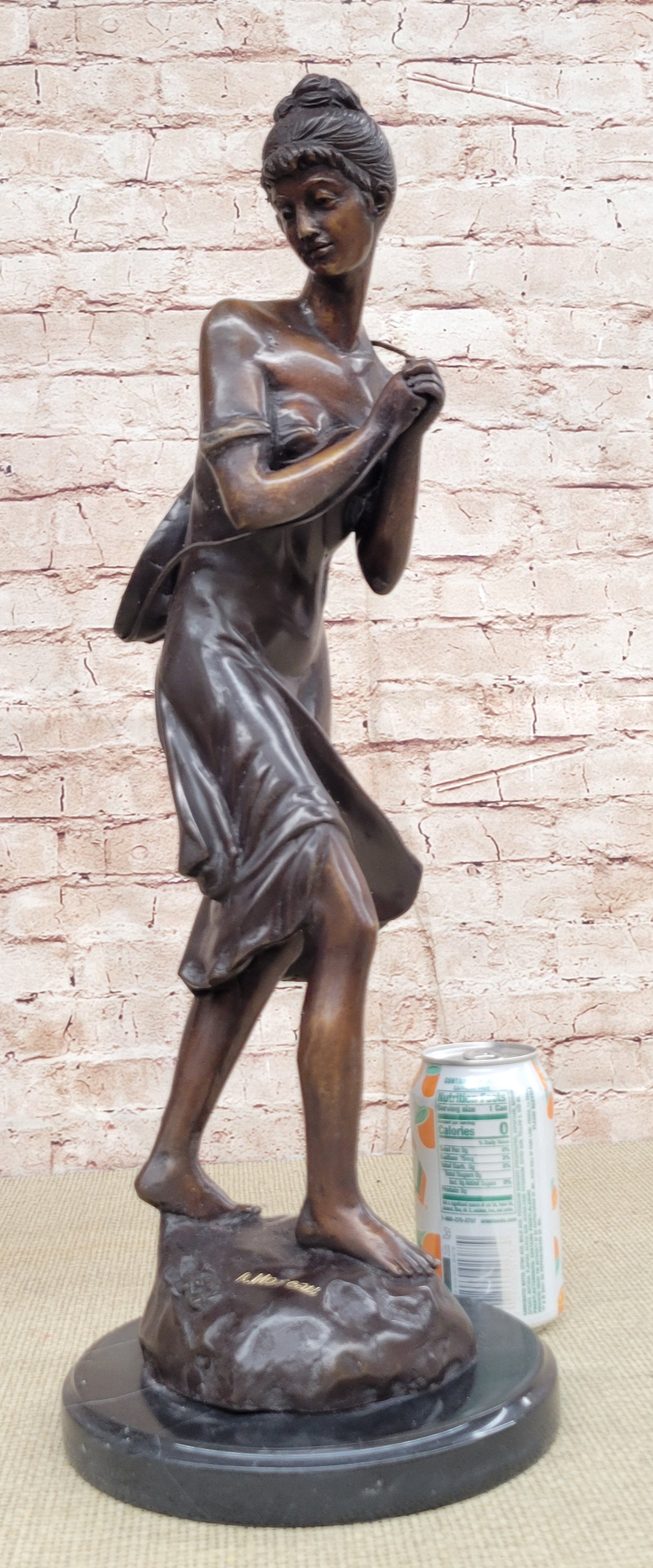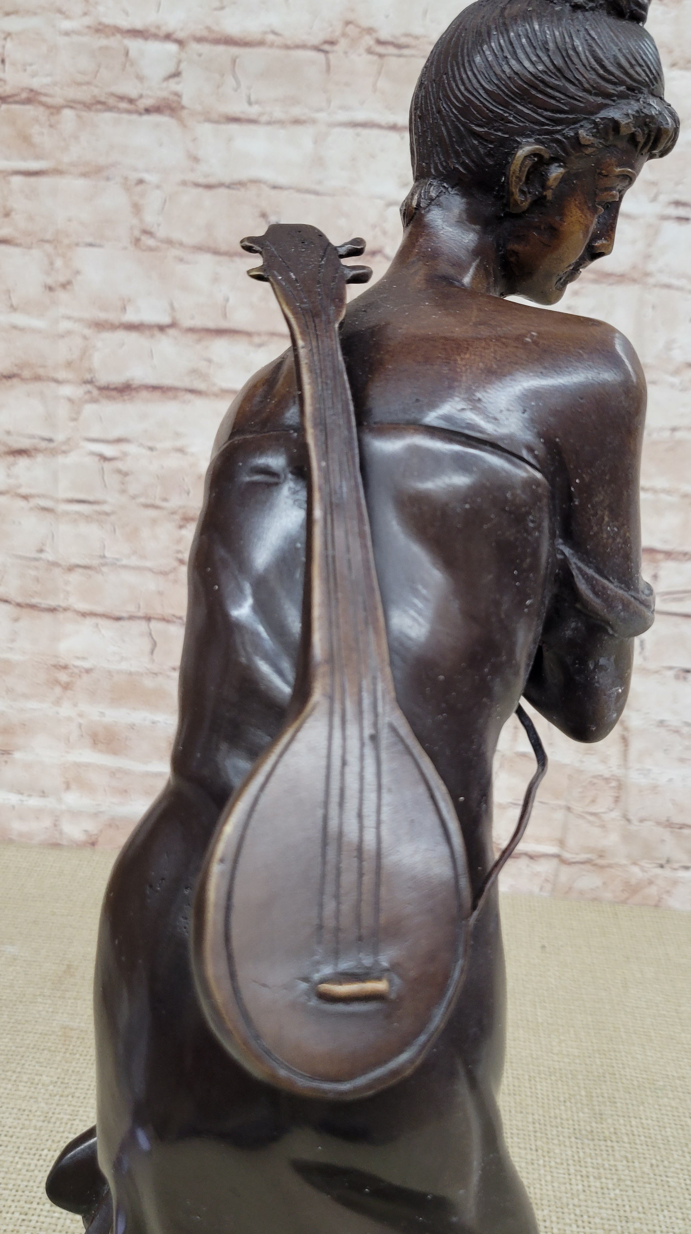 This stunning beauty takes a walk through the forest, as she is going to her favorite little getaway. She looks to her right and with a graceful smiles thinks about all the time she will have to herself. She passes time by playing her old fashion guitar, which she is holding by a string that is wrapped around her upper body. The gorgeous lady wears this amazing dress that flows in the bottom, while the top caress her torso, it falls off her shoulders for a more sexy wear. Her hair is up in this absolute adorable and neatly made bun, with little bangs left up front. While she walks down the pathway to escape the world, her dress moves from one side to the other. The work of art is casted using the ancient old "Lost Wax Method" stained in brown patina for preservation. 100% handmade and 100% bronze, mounted atop a black marble base and its signed by the artist A. Moreau.Bronze Dimensions with Marble Base:Height 20 1/2" x Width 7" Marble Dimensions: diameter 7".