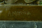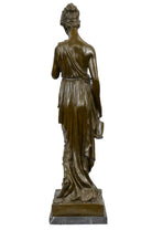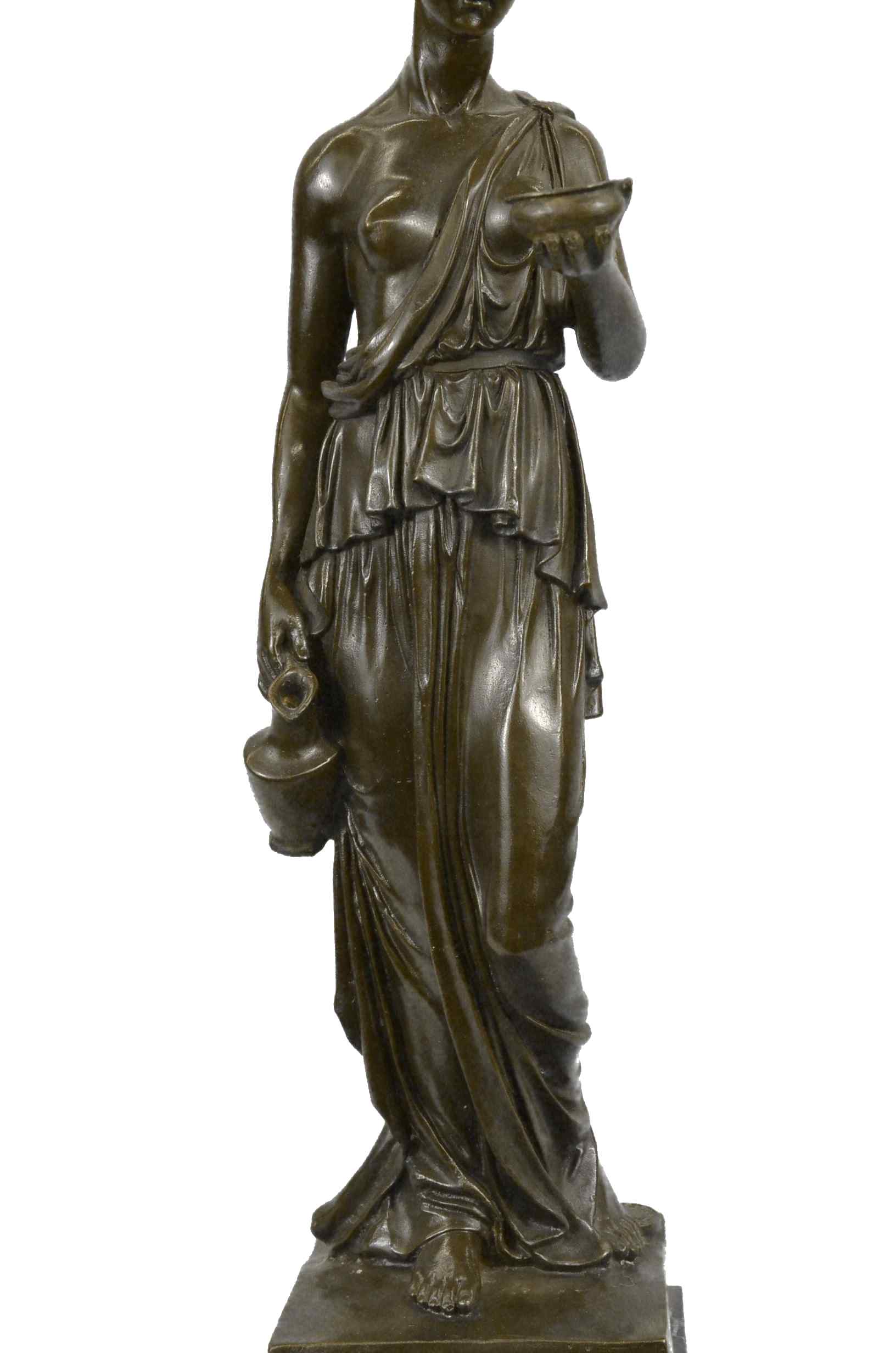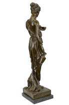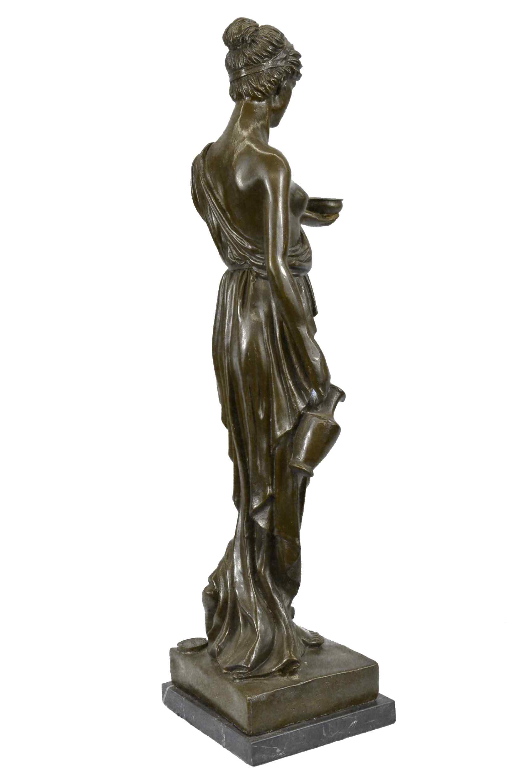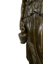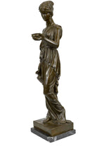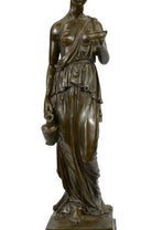 The timeless beauty standing in a classic contrapposto pose, can be envisioned in an ancient garden overshadowed by tall columns of a temple. Her remarkably detailed gown falls off her shoulders revealing her breasts. Her right arms hangs, holding a jug, as she holds a mixing bowl up close to her gentle face, for further inspection. The handmade bronze sculpture was captured using the early method of lost-wax casting and stained with a brown patina finish for perpetuation. It is mounted upon a black marble base with the European Bronze Finery stamp of quality and the artist A. Moreau's signature.Bronze Dimensions with Marble Base: Height 20" x Width 5"