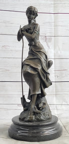 This beautiful woman stand in the mist of a gorgeous flower garden and picked a bunch of different once for her home. She has this amazing long yet sexy dress, that has a slit on her left side of her leg and is completely off shoulders. The beauty stands looking down to her right side to see if she spots anything else she might want to pick. Her hair is gently placed down with a bow right on the top of her head. She is standing above a rock as she slowly tries not to fall. She is casted using the ancient old "Lost Wax Method" and is stained in brown patina finish for preservation. 100% handmade and 100% bronze, place atop a black marble base and is signed MoreauBronze Dimensions with Marble Base: Height 14" x Width 6"