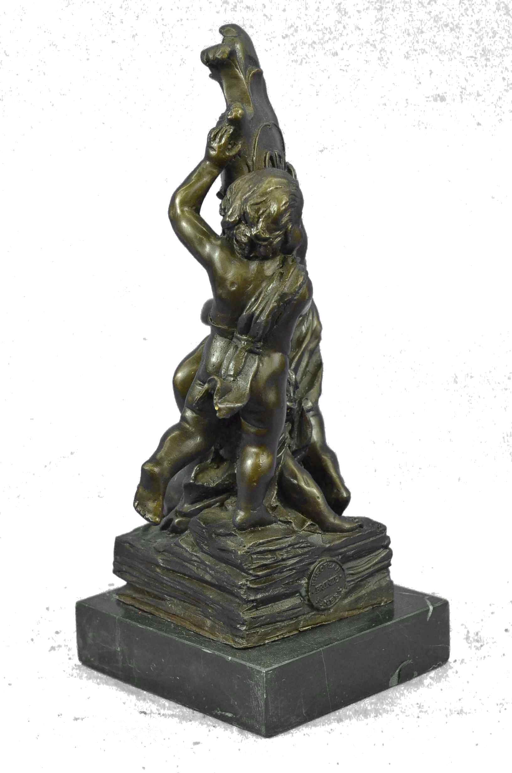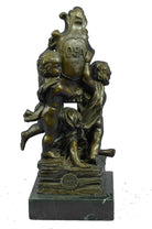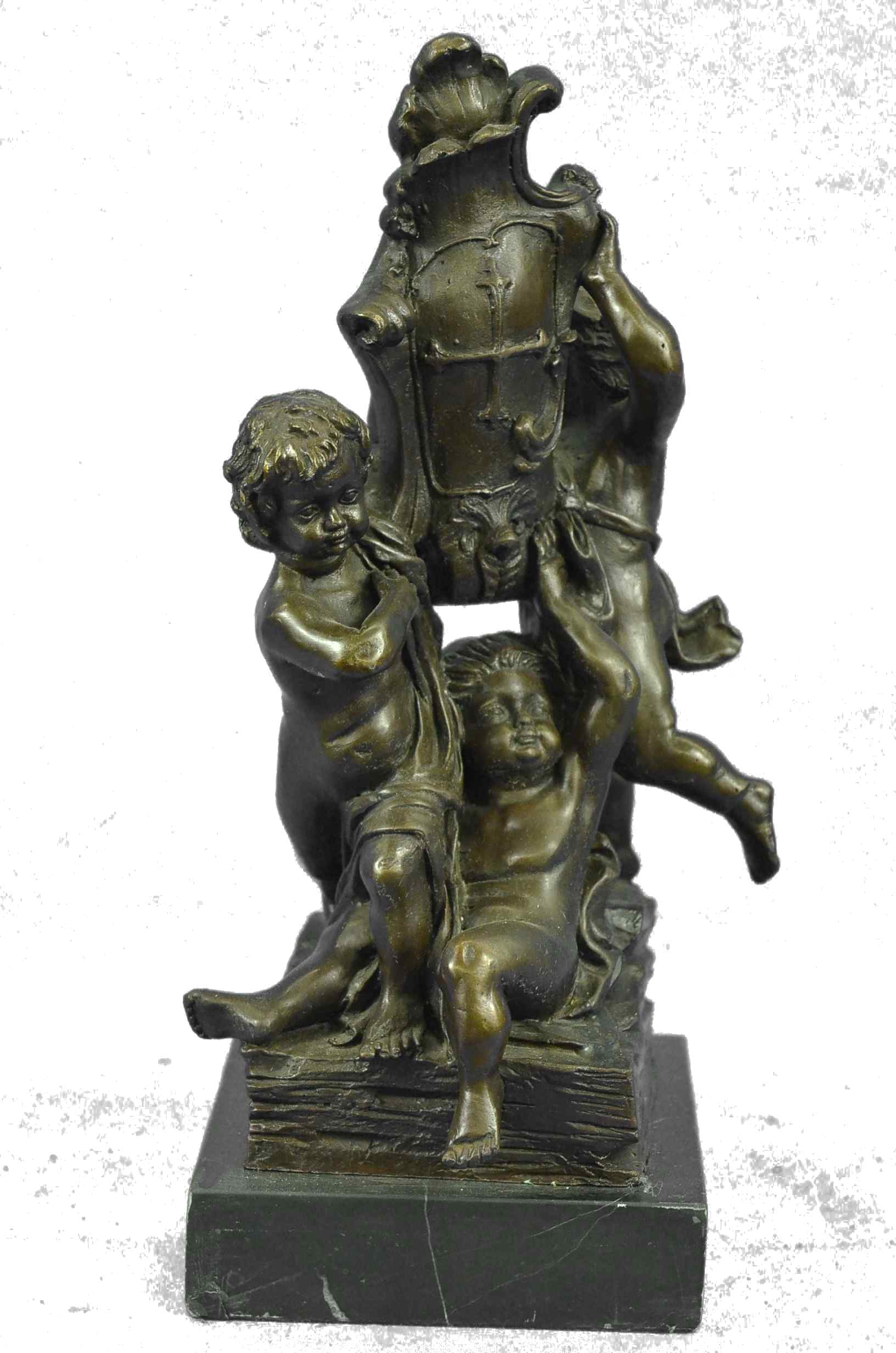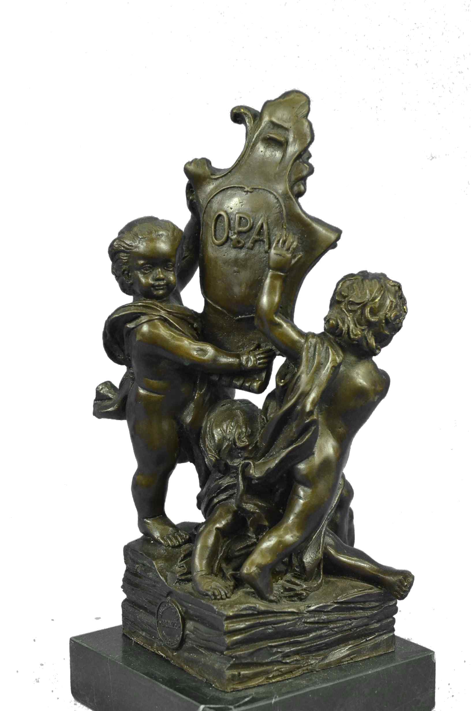 Three precious little children tug and hold onto an archaic religious relic. The three unclothed toddlers, at their young age, understand the importance and value to the religious piece that makes the center of the sculpture. They surround the center each holding onto a different part. This sweet piece stands on a black marble base. It was crafted using the lost method. It is signed A. Moreau.Original or Reproduction: Reproduction