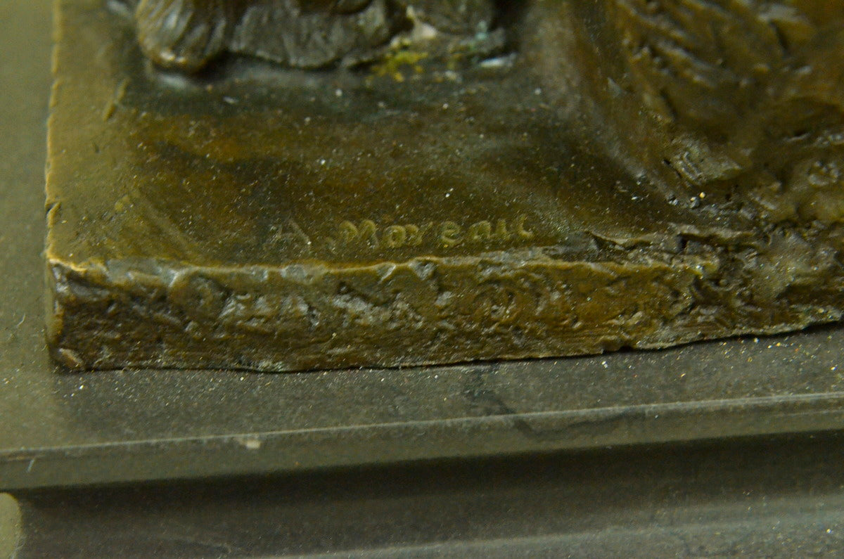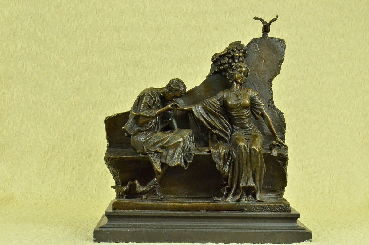 Scorned by his love this young woman is trying to resist is sweet apology. Reluctantly she gives him her hand, he kisses it, uttering one more time how much he loves her. Her head tilts as she debates accepting this apology. They take up an entire bench consumed entirely by this moment. This statue is a representation of the tests the true love must endure. It is a 100% bronze and set on a square black marble base. It is signed Moreau.Bronze Dimensions with Marble Base:Height 13" x Width 12"