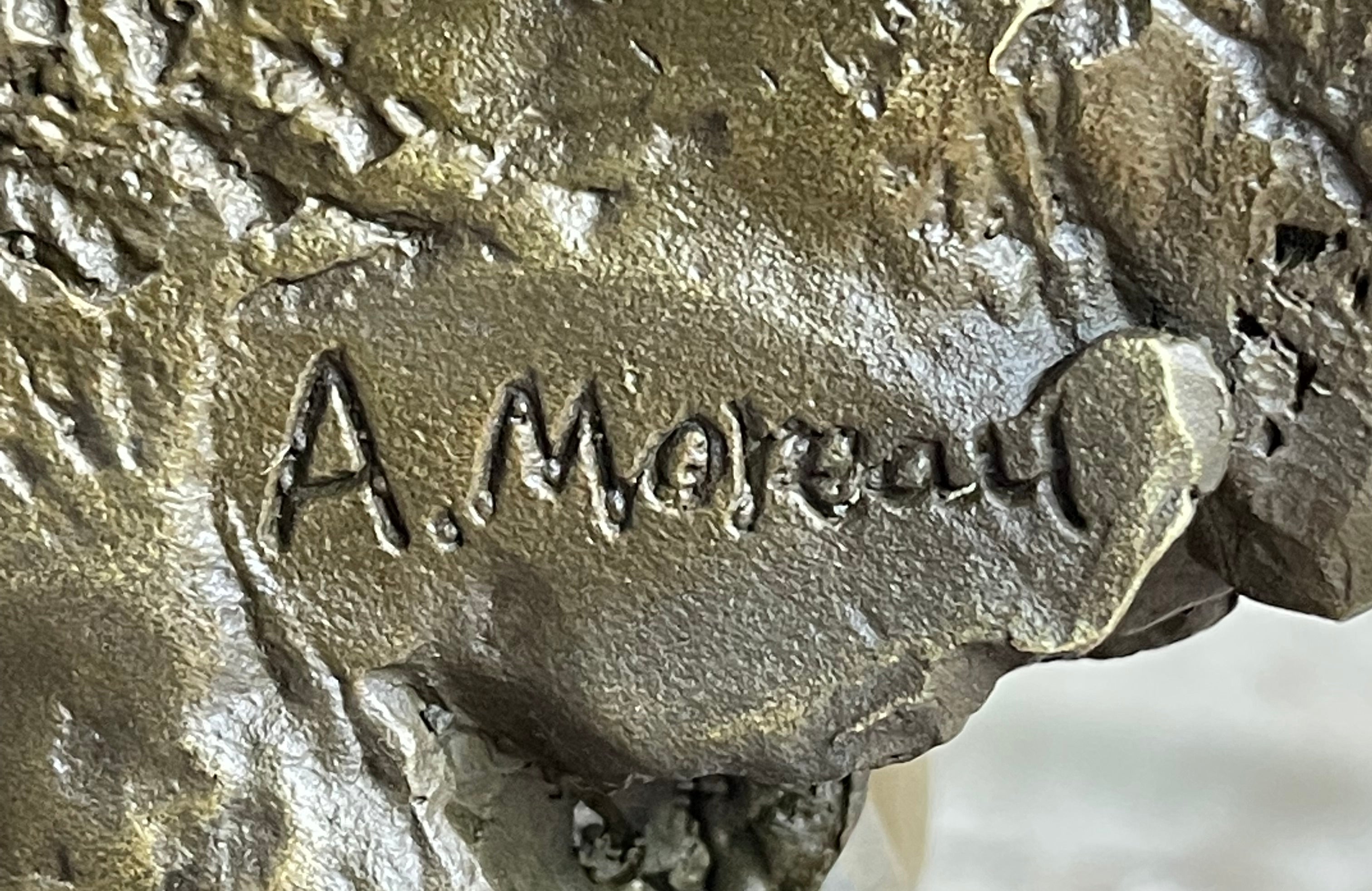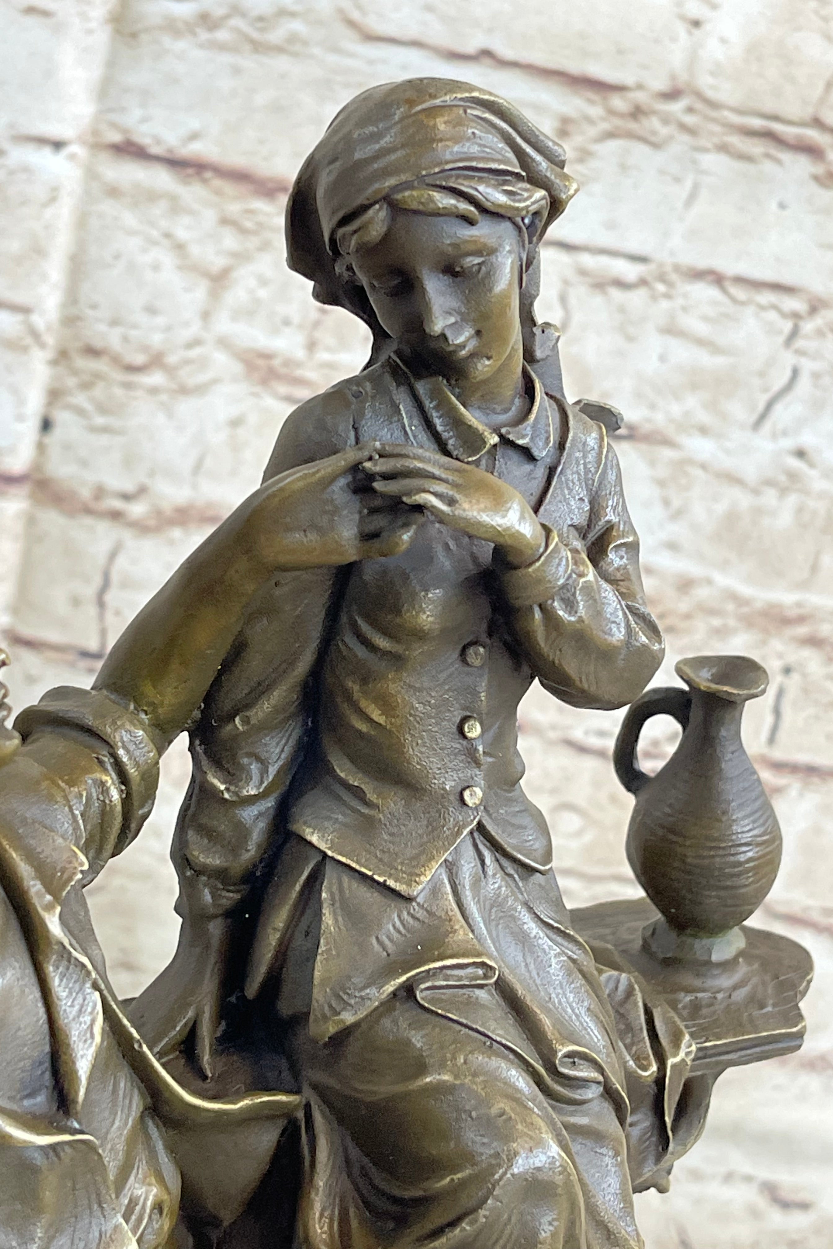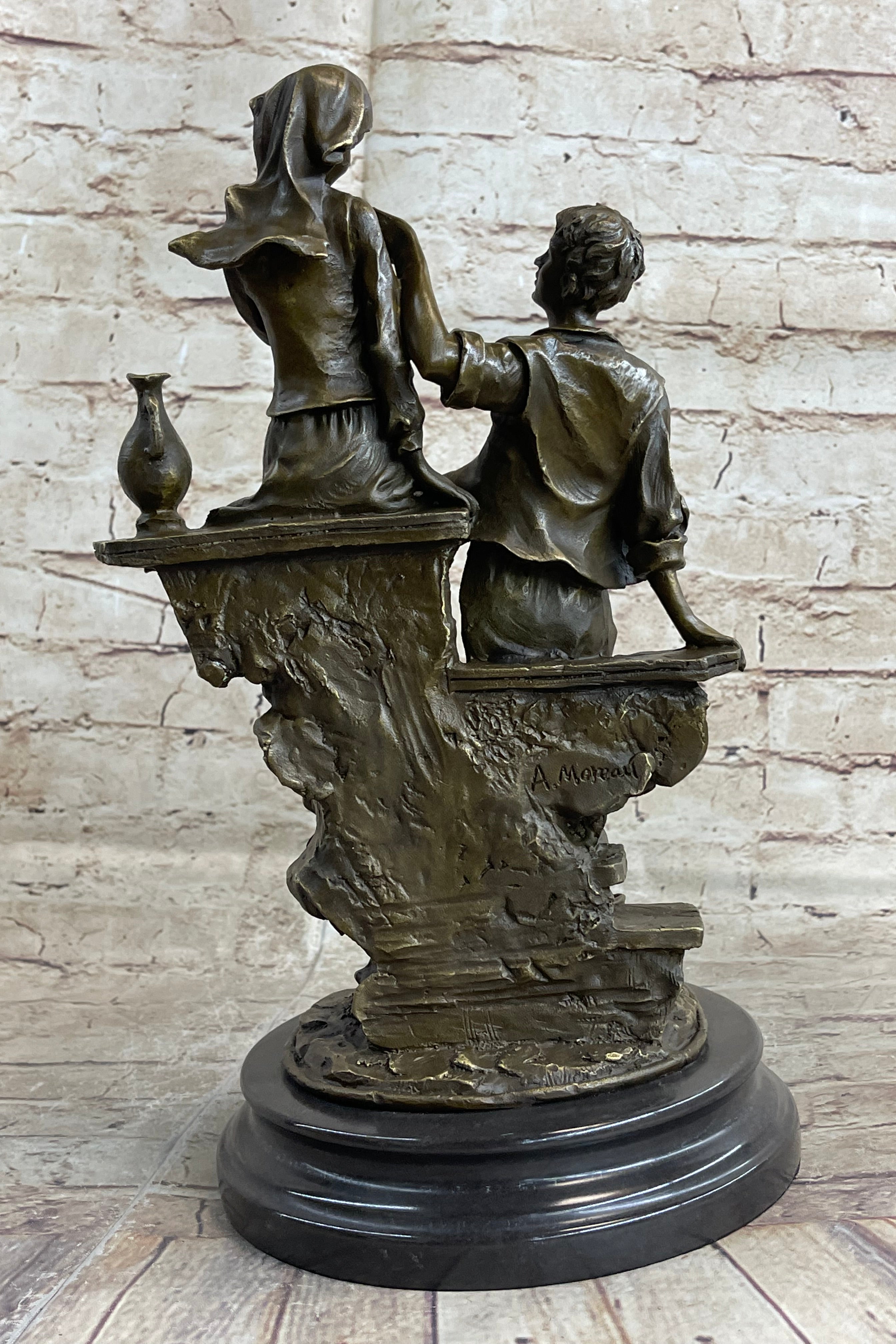 This evocative bronze sculpture captures a poignant moment of love and reconciliation. A young maiden, initially scorned by her beloved, stands as a testament to the complexity of human emotions. Her hesitation and reluctance are palpable as she contemplates the sweet apology offered by her suitor. Reluctantly, she extends her hand, and he, in turn, gently kisses it while declaring his enduring love. The scene unfolds on an entire bench, engulfing them in a moment that embodies the trials and tribulations that true love must endure. This sculpture serves as a profound representation of the multifaceted nature of love, where emotions of doubt and forgiveness coexist. Crafted from 100% bronze, it stands as a tangible symbol of this enduring human experience. Resting upon a round black marble base, it exudes a sense of elegance and permanence, enhancing its visual impact and stability. The inclusion of the artist Moreau's signature is a mark of quality, reaffirming its place within the realm of fine art. As a work of art, this bronze sculpture invites viewers to reflect on the complexities of love, forgiveness, and human connection. It captures a moment of vulnerability and reconciliation, resonating with anyone who has experienced the ups and downs of a passionate relationship. Whether displayed in a personal collection or a public setting, it serves as a reminder of the enduring power of love and the artistry of capturing profound moments in bronze.