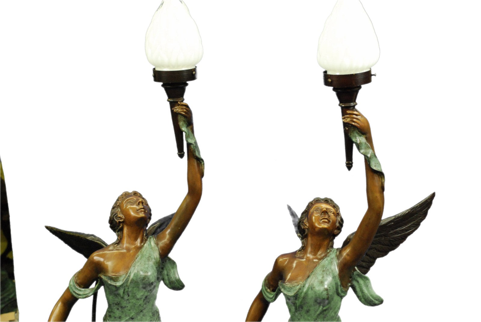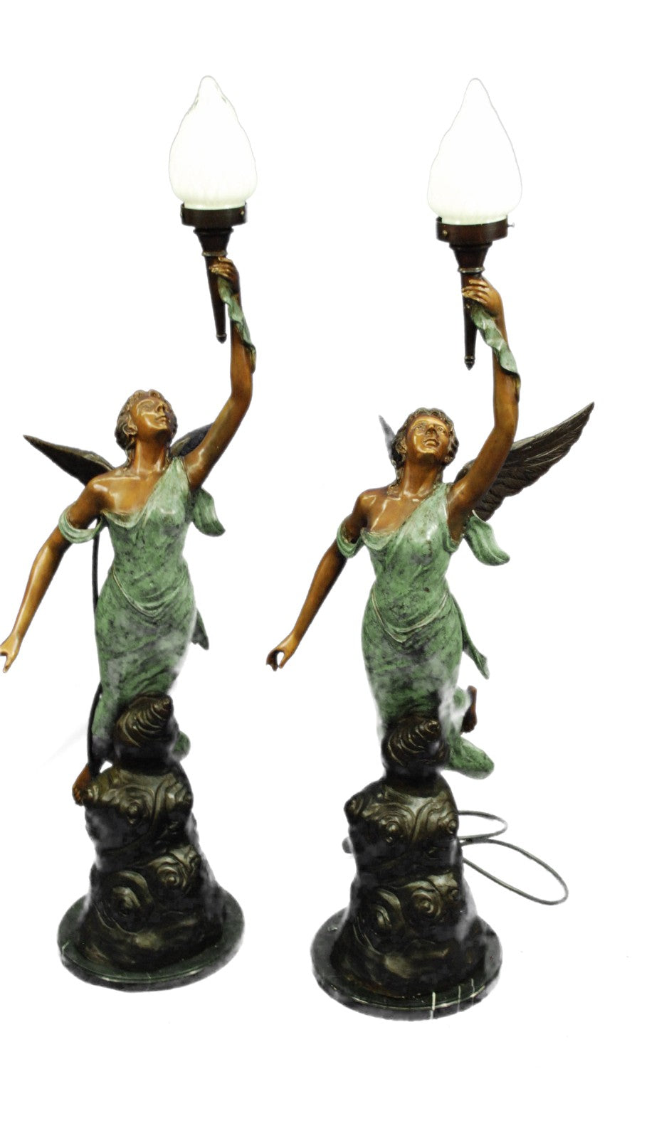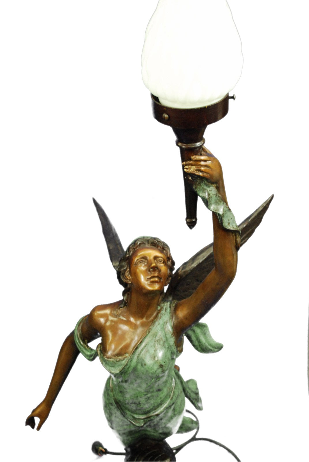 Dressed in gorgeously clad robe this gorgeous Guardian Angel holds up a torch in order for her to see her way through the night. Off of her shoulder her sleeve falls giving her a sultry look. Not only is this bronze sculpture gorgeous but she is also a lamp. She wears gladiator shows and a thin band in her hair. Her curly hair is ties up in neat braids and tucked under the band. She comes from royalty and wears gorgeous jewelry. This lamp is lifted off the ground and sits on black marble base. It is an absolutely wonderful way to shed a little light in your life and makes great for décor, giving you a classy look. This bronze sculpture was cast suing the "Lost Wax Method" and has a special hand painted patina.Each Bronze Dimensions with Marble Base:Height 53" x Width 22"