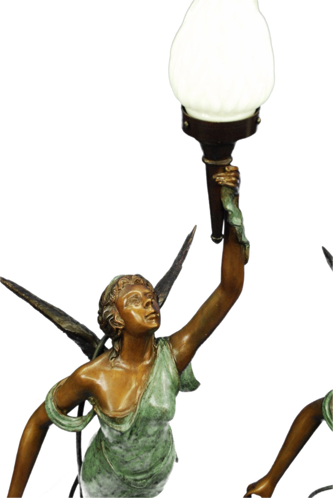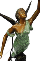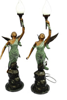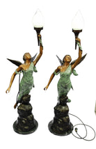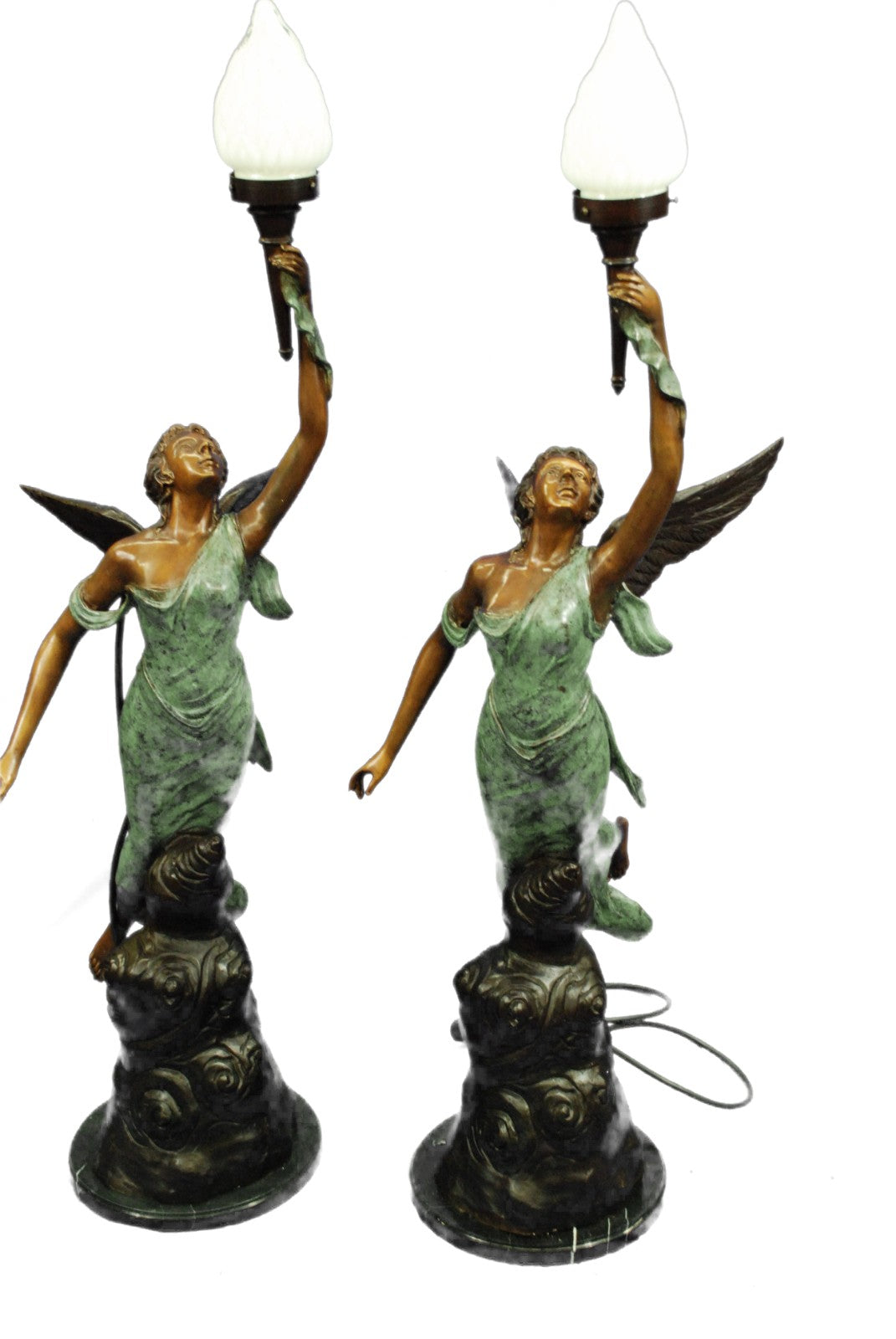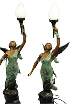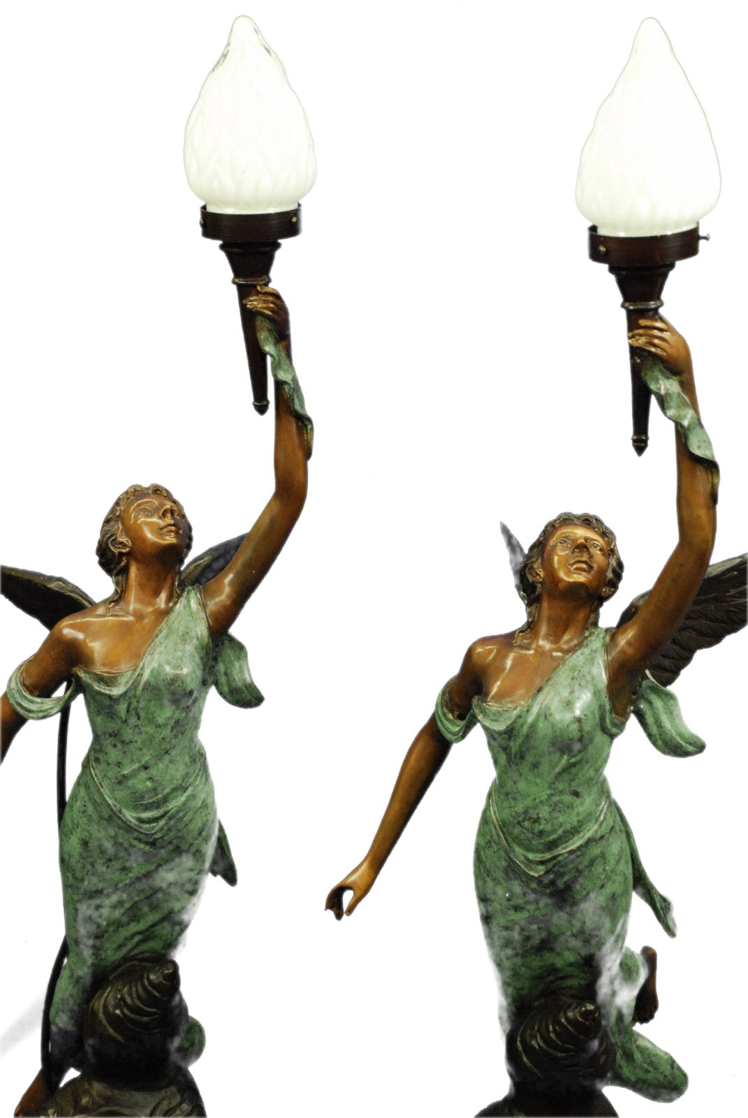 Dressed in gorgeously clad robe this gorgeous Guardian Angel holds up a torch in order for her to see her way through the night. Off of her shoulder her sleeve falls giving her a sultry look. Not only is this bronze sculpture gorgeous but she is also a lamp. She wears gladiator shows and a thin band in her hair. Her curly hair is ties up in neat braids and tucked under the band. She comes from royalty and wears gorgeous jewelry. This lamp is lifted off the ground and sits on black marble base. It is an absolutely wonderful way to shed a little light in your life and makes great for décor, giving you a classy look. This bronze sculpture was cast suing the "Lost Wax Method" and has a special hand painted patina.Each Bronze Dimensions with Marble Base:Height 53" x Width 22"