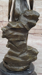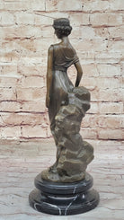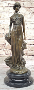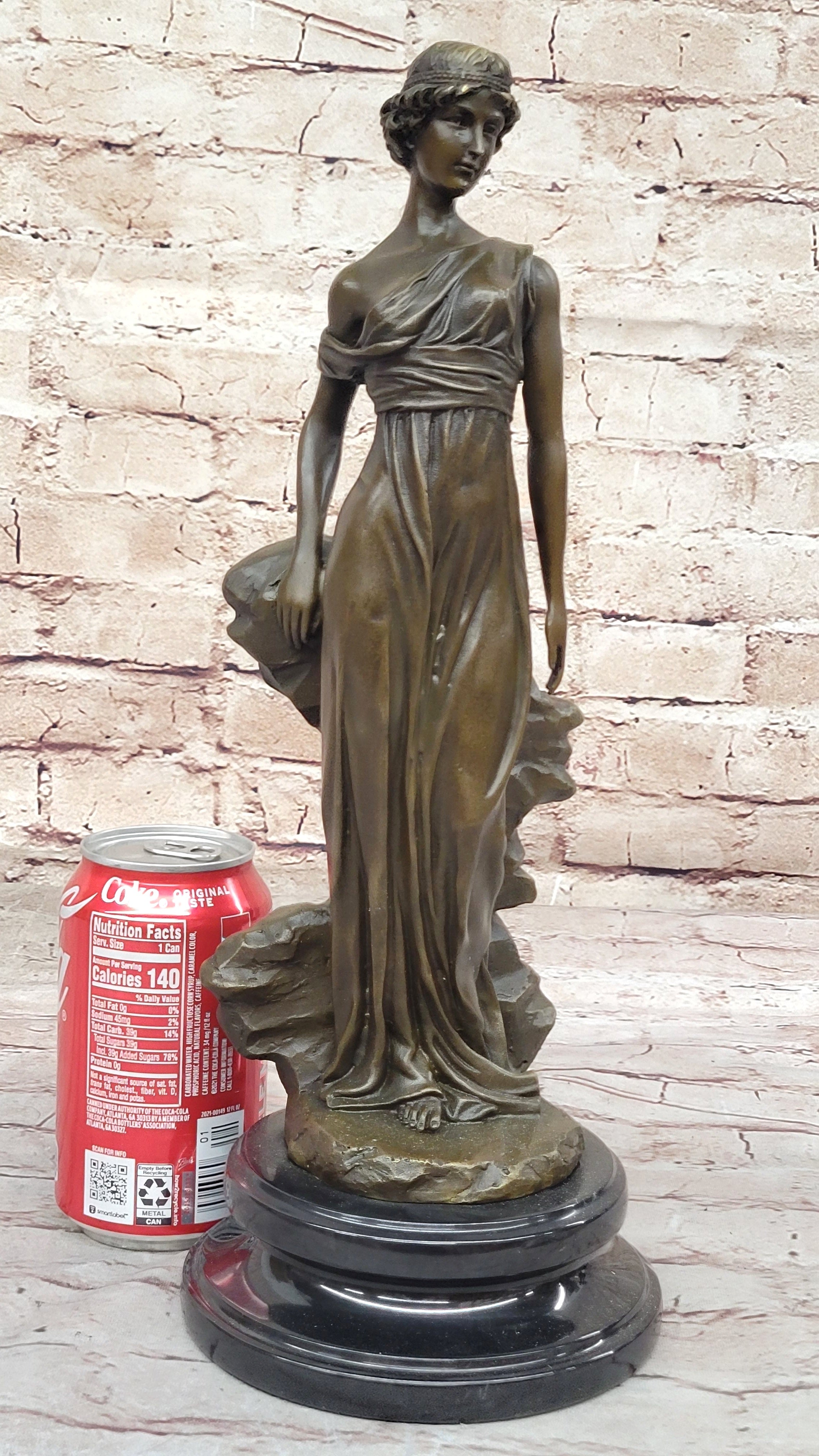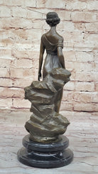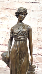 In a moment of tranquil repose, this bronze sculpture captures the grace and serenity of a young maiden stealing a leisurely pause in her day. The maiden leans gracefully against a rock, her gaze focused into the distance. Cloaked in a goddess-like dress that elegantly slouches off her shoulder and cascades over her slim figure, she embodies an aura of timeless beauty and contemplation.