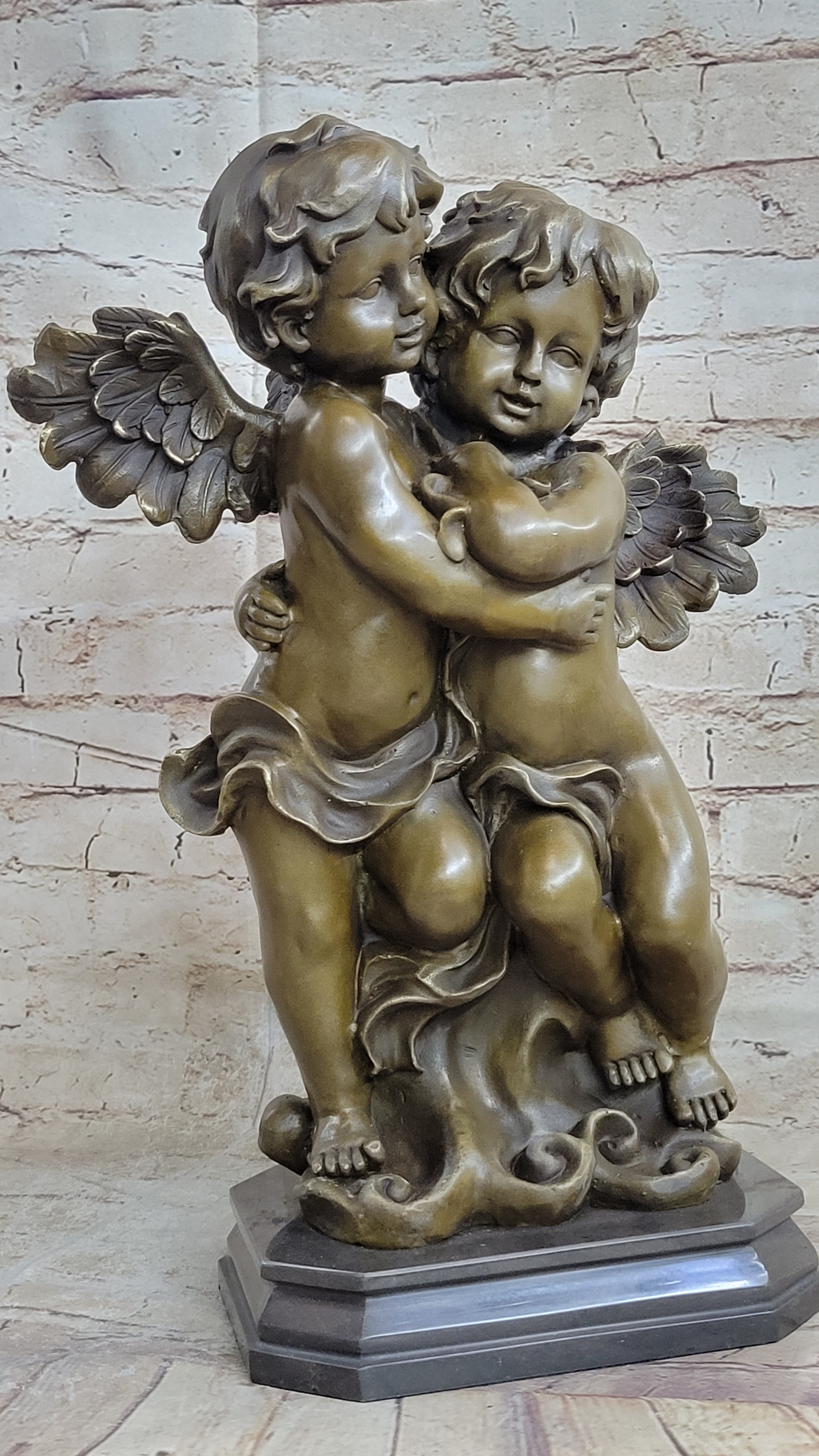 With its timeless appeal and exquisite craftsmanship, this genuine bronze sculpture is a coveted addition to any art collection or decor. It is a testament to the beauty of brotherly love and the enduring power of art to evoke emotions and tell stories. Display this remarkable piece in your home or office, and let the Hand Made Twin Brothers Puti sculpture by Moreau enchant and inspire all who behold it.Bronze Dimensions with Marble Base: Height 15.5" X Width 10"