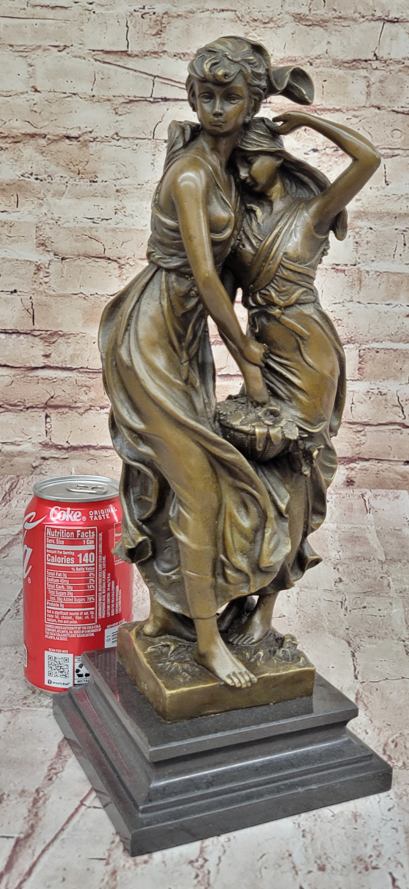 This bronze figural group titled "Consolation" is a heartwarming representation of two young girls. One girl tenderly holds the arm of the other, while the second girl carries a basket of flowers with a ribbon tied to it. The sculpture exudes a sense of companionship and comfort, capturing a moment of solace and connection between the two figures.