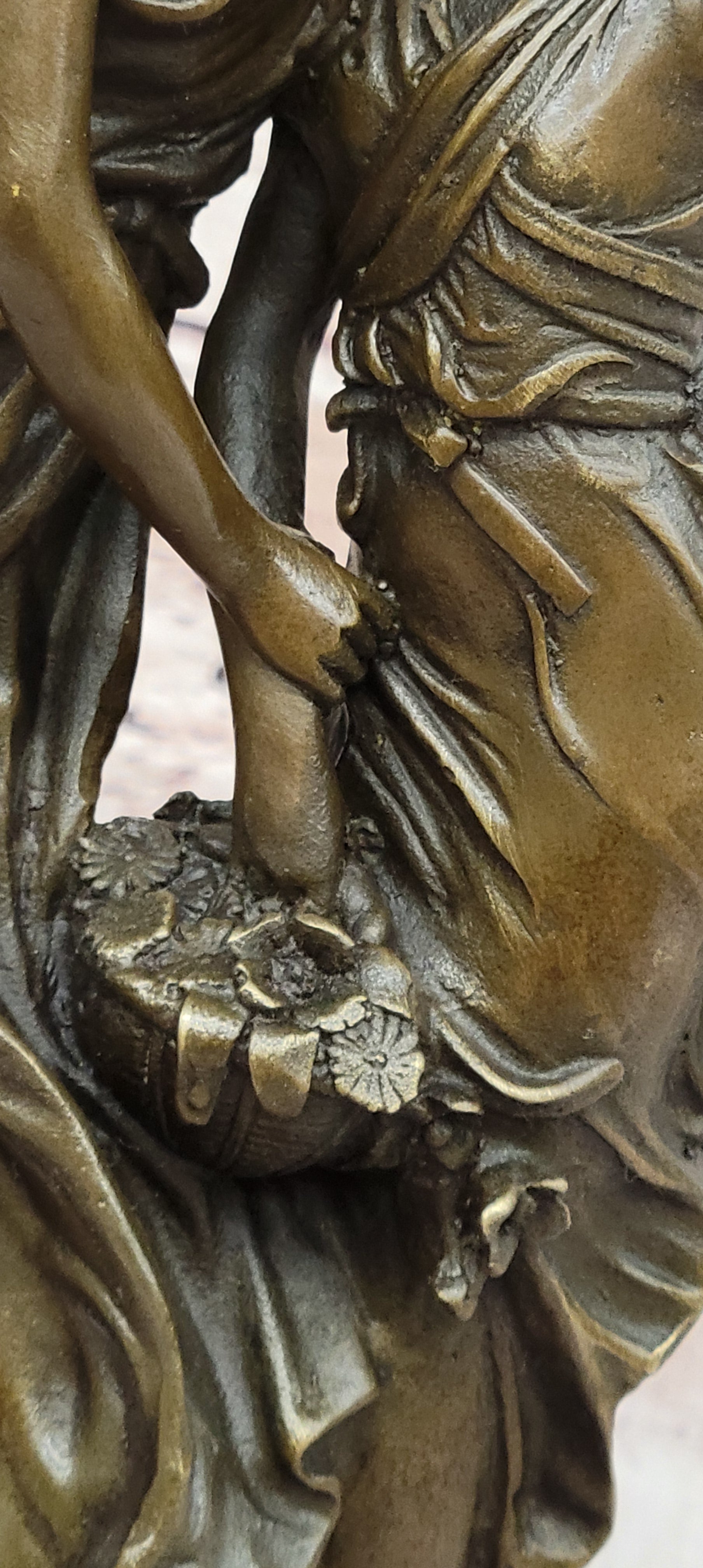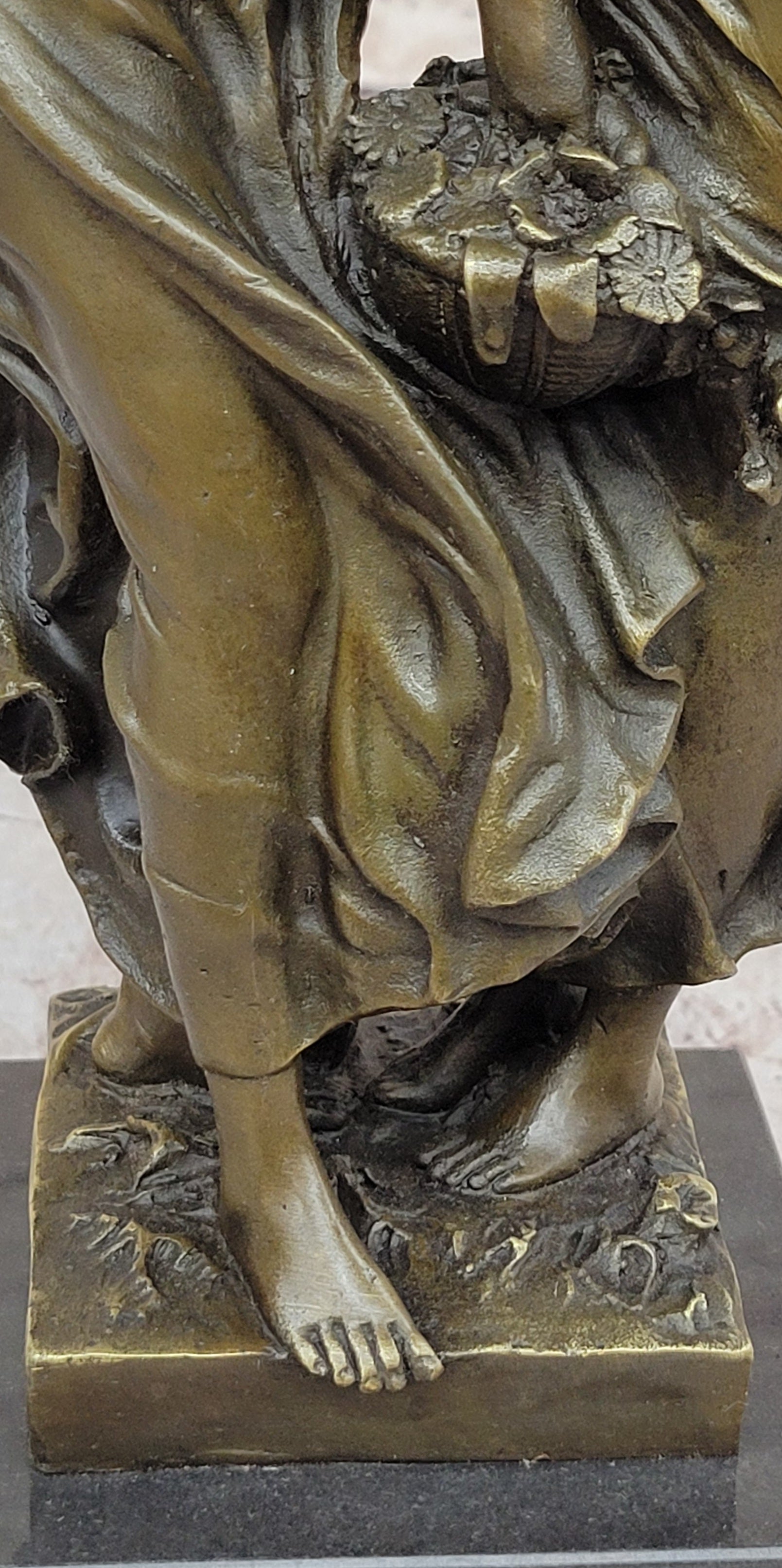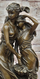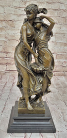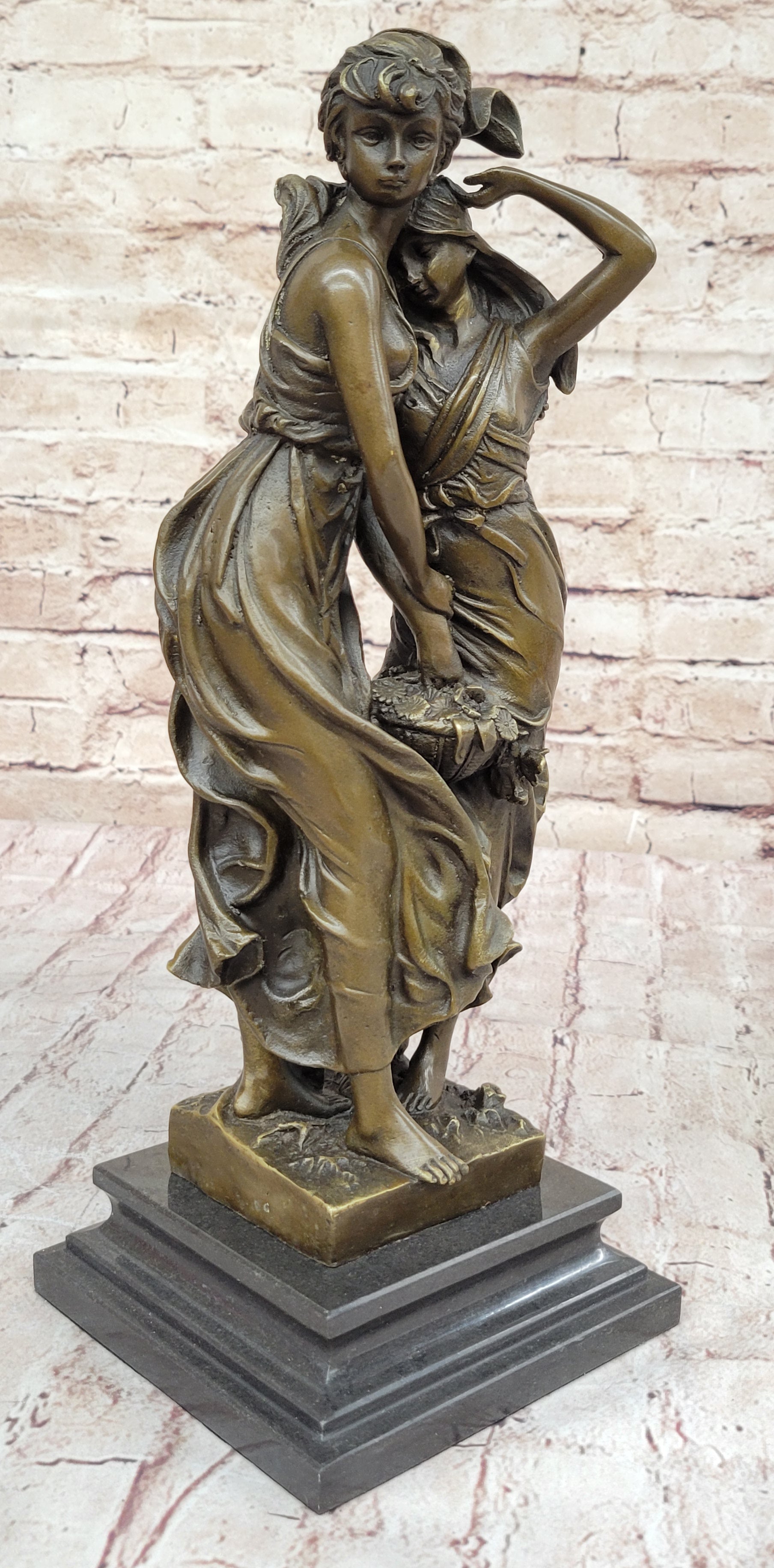 Crafted with meticulous attention to detail, this sculpture showcases the artist's skill in portraying the delicate features of the young girls, the graceful flow of their dresses, and the intricacies of the floral basket. The use of the "Lost Wax Method" in its casting ensures that every nuance is beautifully preserved in solid bronze, giving the piece a timeless quality.