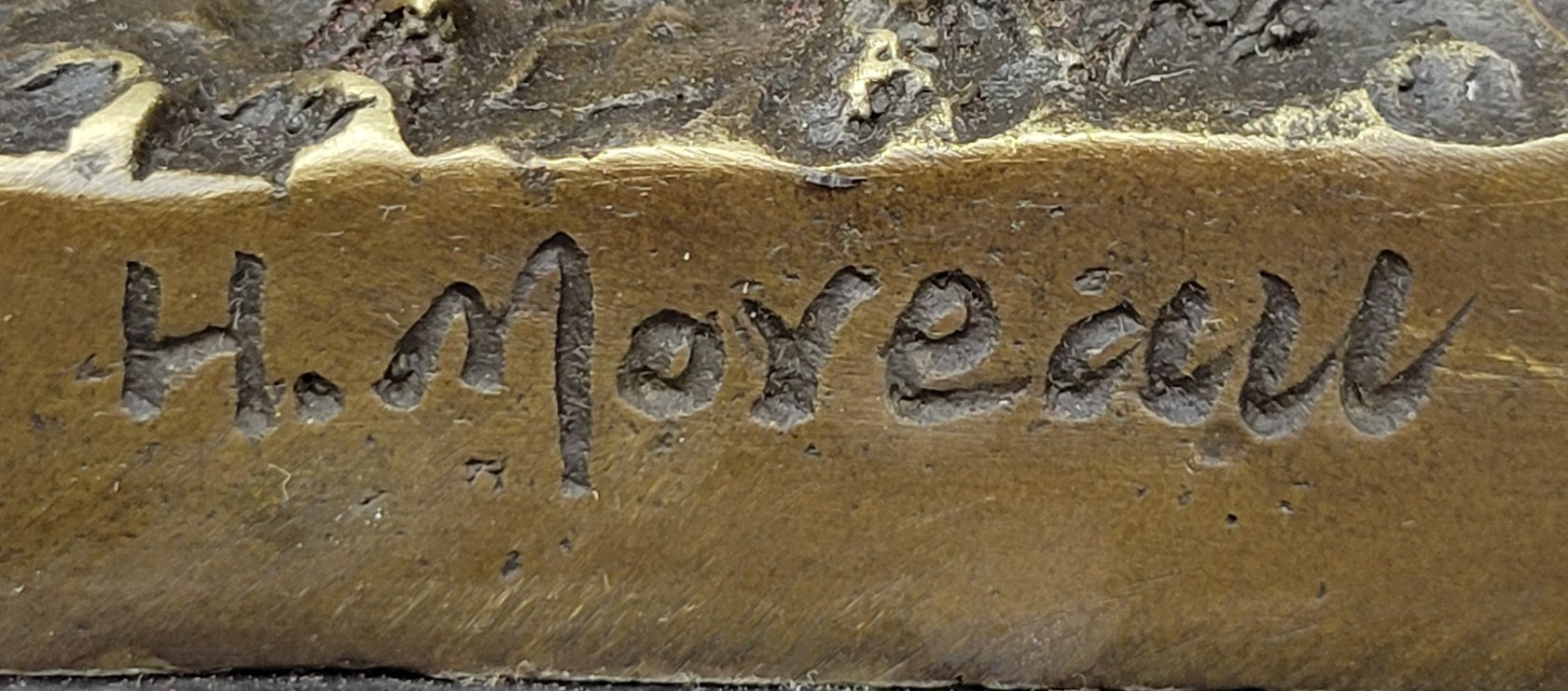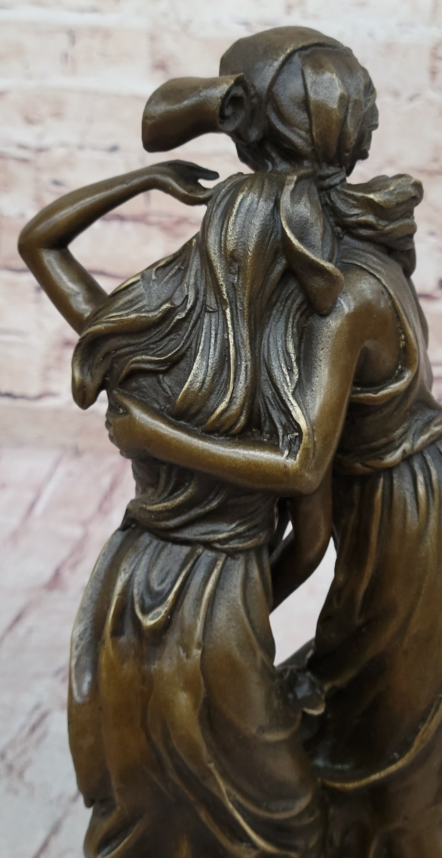 Signed by the artist Moreau, this bronze sculpture is not only a work of art but also a symbol of friendship and consolation. It serves as a meaningful addition to any art collection or interior space, evoking emotions of warmth and togetherness. Whether displayed in a home, office, or gallery, "Consolation" is a captivating piece that resonates with the viewer, making it a cherished and enduring part of any collection.Bronze Dimensions with Marble Base: Height 14" X Width 5"