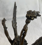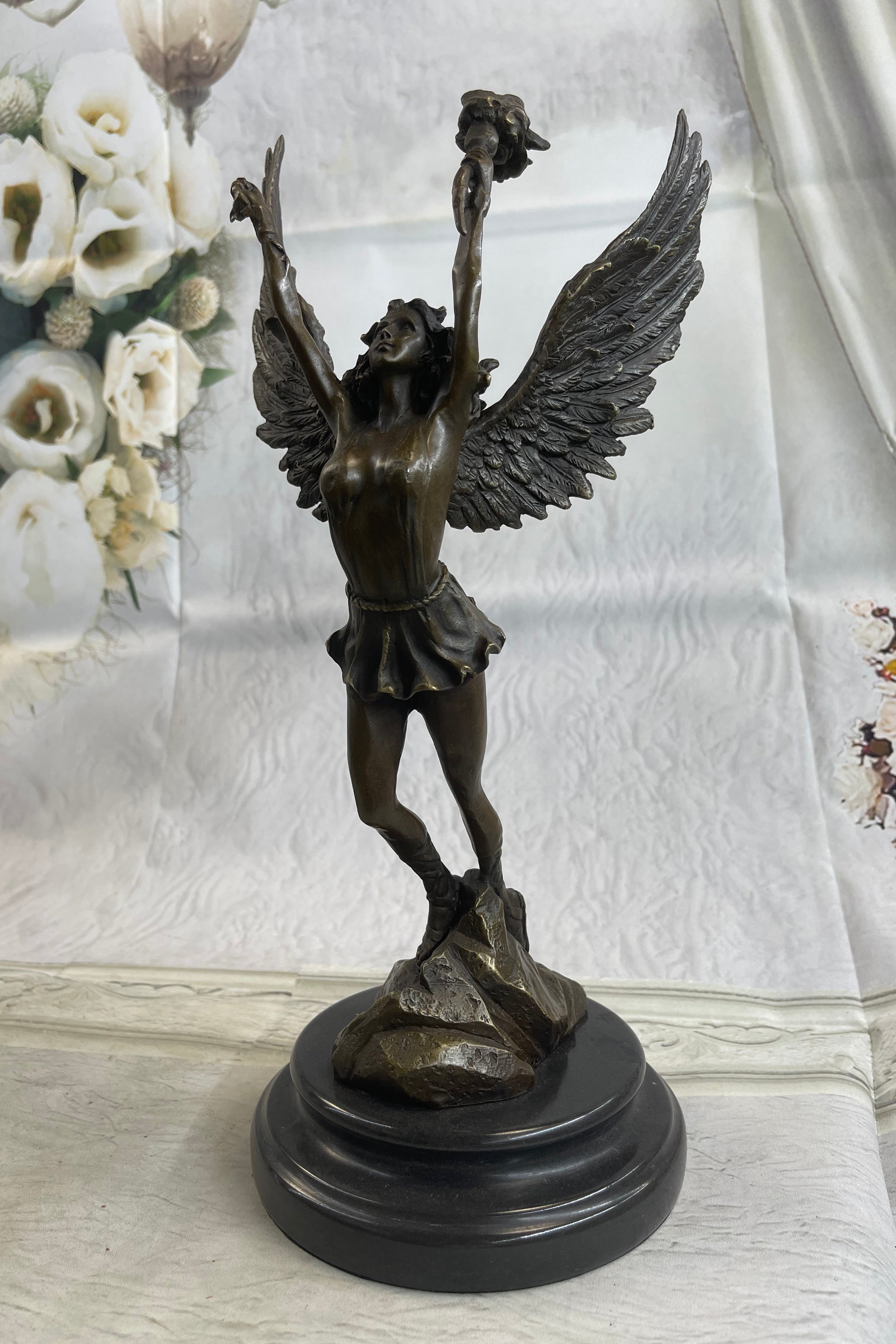 This striking bronze sculpture depicts an angel in a bold and resolute stance, symbolizing her divine mission to safeguard our world from all forms of darkness. With origins from the heavens, she stands as a beacon of hope and salvation, ready to guide and protect. She is adorned in a flowing robe and sandals, her outstretched wings reaching towards the heavens, as if she is signaling her celestial origins. In her hand, she carries a torch, which serves as a metaphorical light to dispel darkness and ignorance. Crafted with exceptional artistry and precision, this sculpture features a stunning brown patina finish, adding depth and dimension to the angel's form. The "lost wax method," a time-honored casting technique, was employed to ensure the finest details were preserved, from the intricate feathers of her wings to the delicate folds of her robe. The sculpture is elegantly presented on a black marble base, further enhancing its visual appeal and stability. This awe-inspiring artwork bears the signature of the esteemed artist Moreau, underlining its quality and artistic value. Whether displayed in a place of worship, a spiritual sanctuary, or an art collector's home, this bronze sculpture of an angel serves as a powerful reminder of the eternal battle between light and darkness and the divine protection that watches over us. It's a profound and timeless addition that inspires faith and hope in the hearts of those who encounter it.