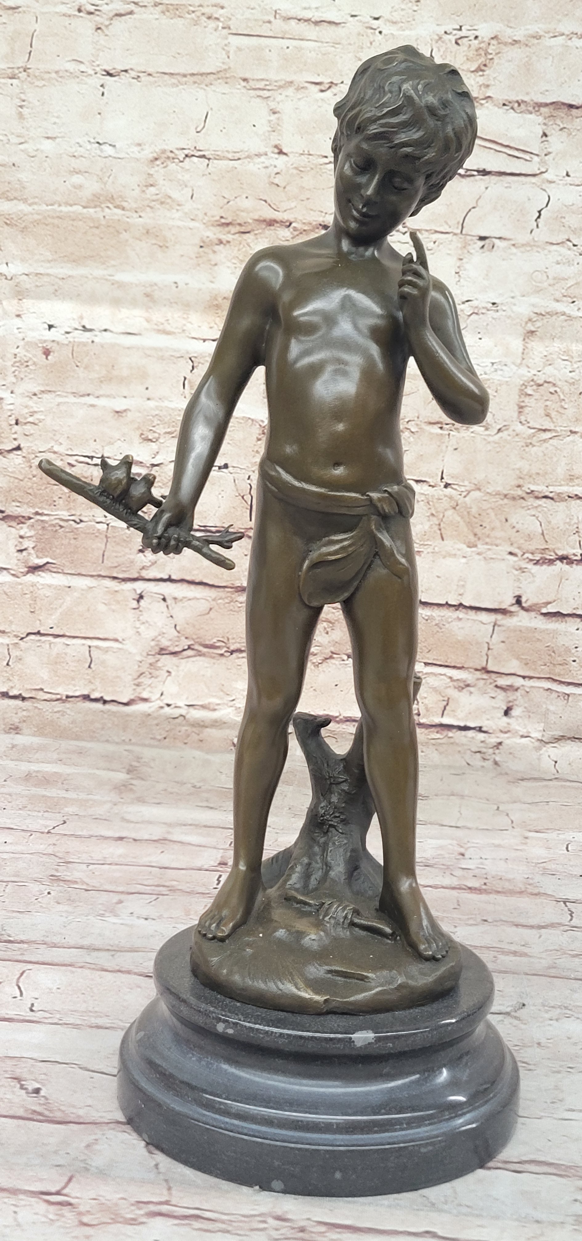 Little Boy Holding a Stick with Birds - Classical Bronze Sculpture by Auguste Moreau