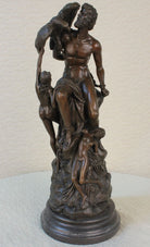 This statue depicts Zeus, the god of sky and thunder in Greek Mythology. He was considered to be the father of gods and men. He was the ruler of the Olympians. He is the symbol of great power and strength. The great god sits high on the peak of a mountain. His eagle perches on his shoulder, while tethered to a chain that is cuffed to Zeus` wrist. Nymphs crawl out of the raging ocean and scale the rocky hill to be near him. He eclipses them in size, a testament to his greatness and immortality. 100% bronze and handmade, this brown patina sculpture was cast using the "Lost Wax Method" and mounted on a marble base and is signed A. Moreau.Original or Reproduction: Reproduction