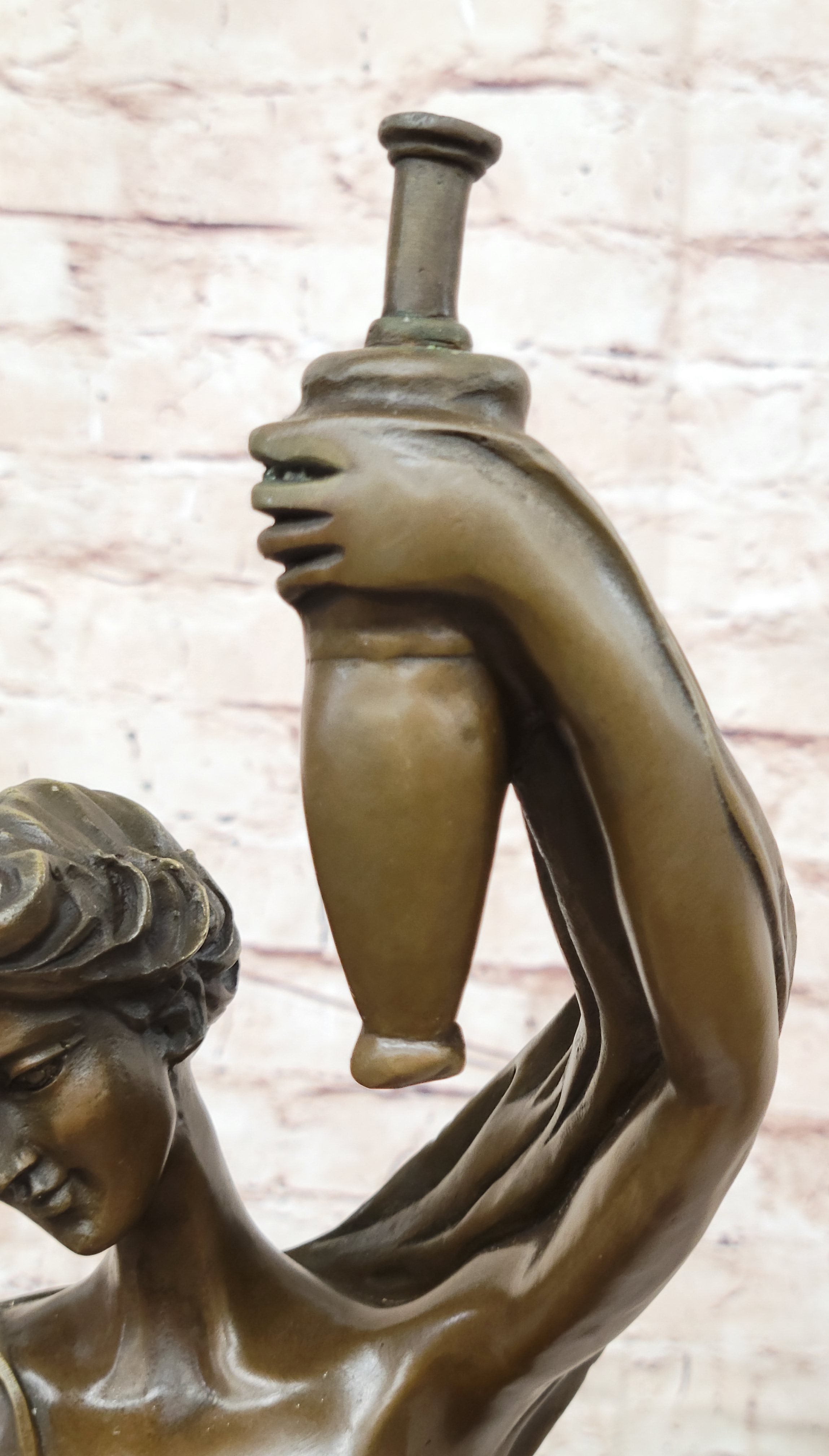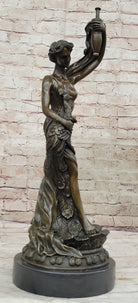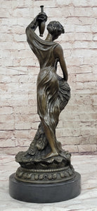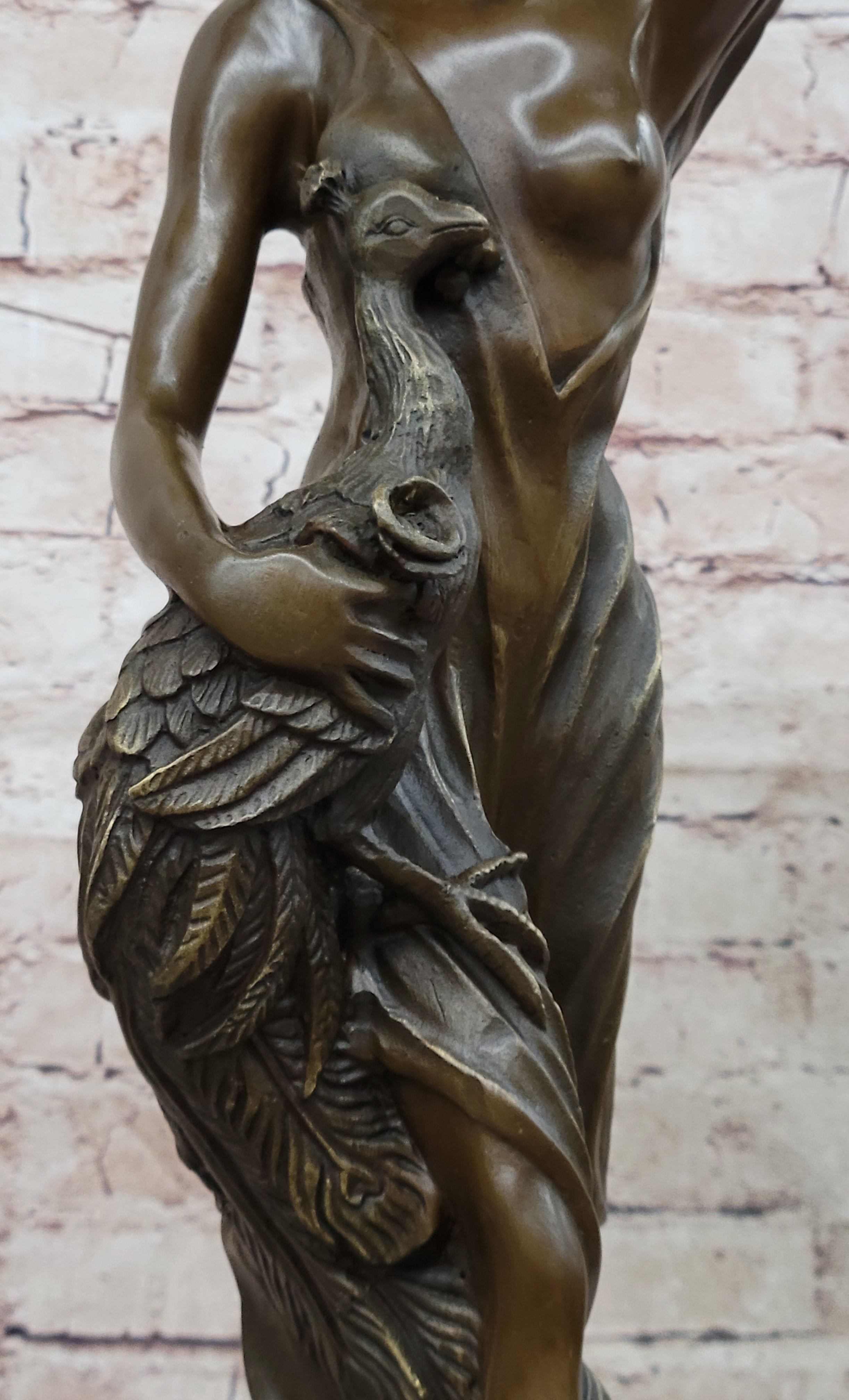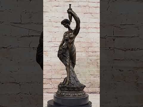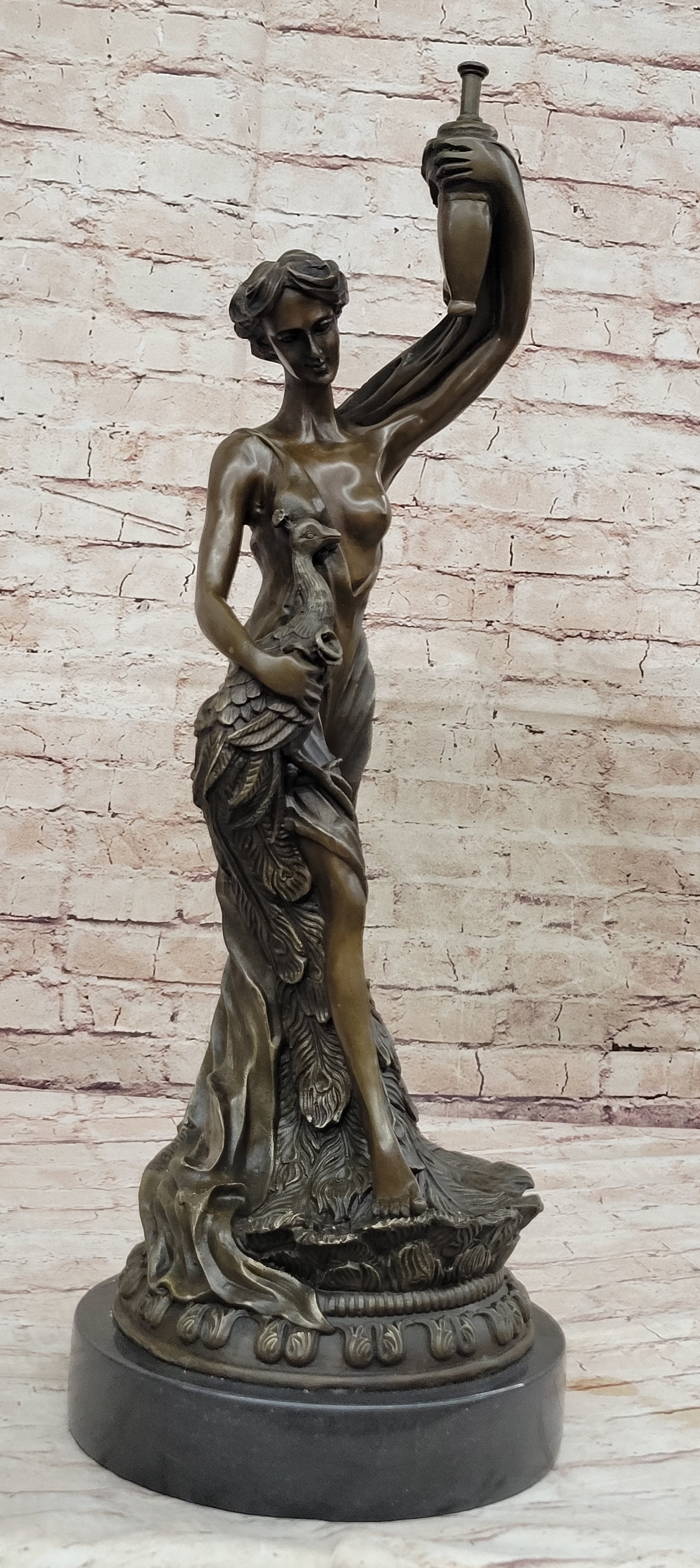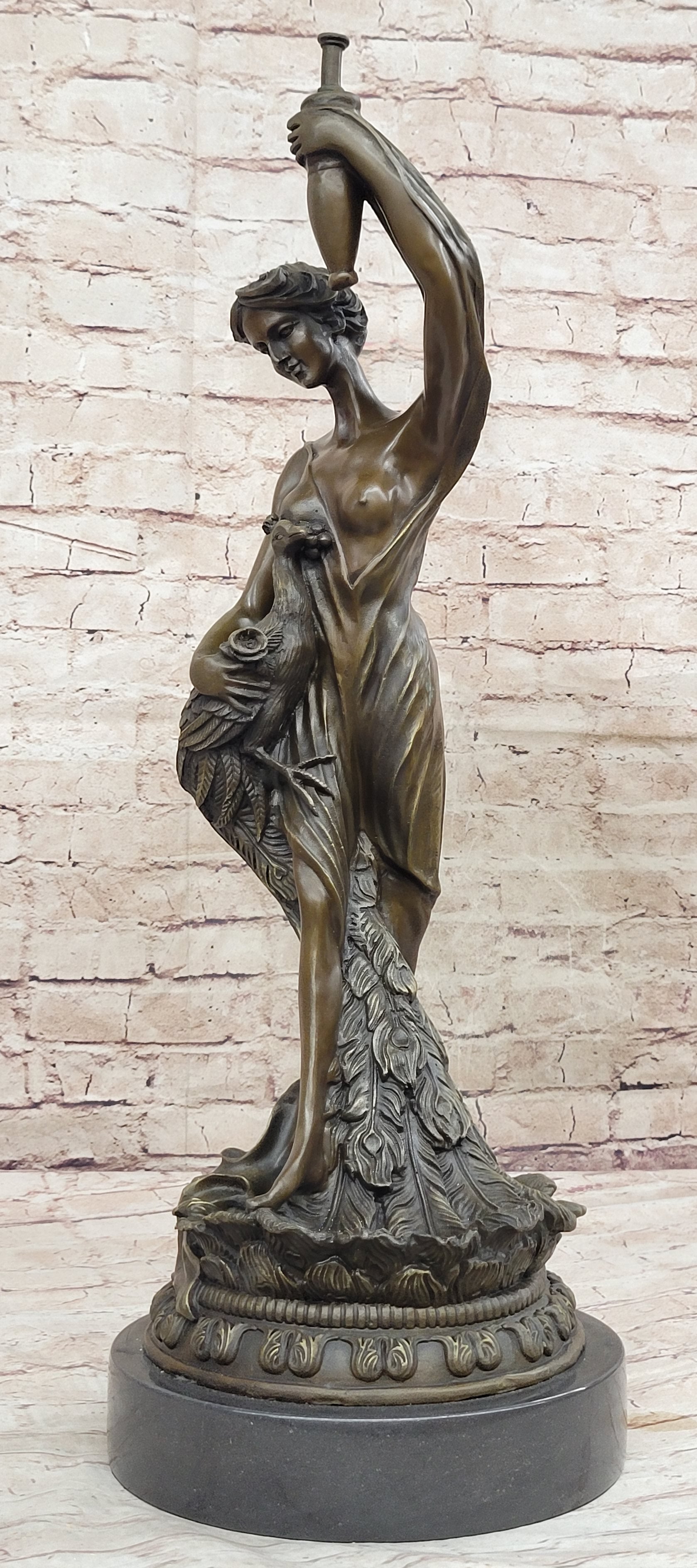 Experience the timeless allure of classical art with this exquisite bronze sculpture of Semi Nude Venus Holding a Peacock. Inspired by the iconic figures of ancient mythology, this captivating artwork showcases the goddess Venus in a semi-nude form, evoking a sense of grace and beauty. The sculpture expertly captures the intricate details of her flowing hair, delicate features, and the gentle drapery that adorns her body, all meticulously handcrafted by the skilled artisans using the lost wax method. Venus, the goddess of love and beauty, stands elegantly on a round black marble base, enhancing the sculpture's aesthetic appeal. The rich brown patina adds depth and dimension to the bronze, creating a sense of warmth and antiquity. The peacock she holds symbolizes immortality and eternal love, complementing the theme of divine beauty and grace. This genuine bronze sculpture is a true work of art, signed by the renowned artist Moreau, whose masterful craftsmanship is evident in every detail. Whether displayed in a curated art collection, gracing a home interior, or placed in an outdoor garden, this Semi Nude Venus Holding a Peacock bronze sculpture will undoubtedly become a focal point, sparking admiration and admiration for its exquisite beauty and artistic expression. Embrace the timeless allure of this masterpiece and elevate your space with its ethereal charm.