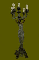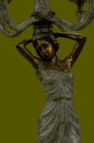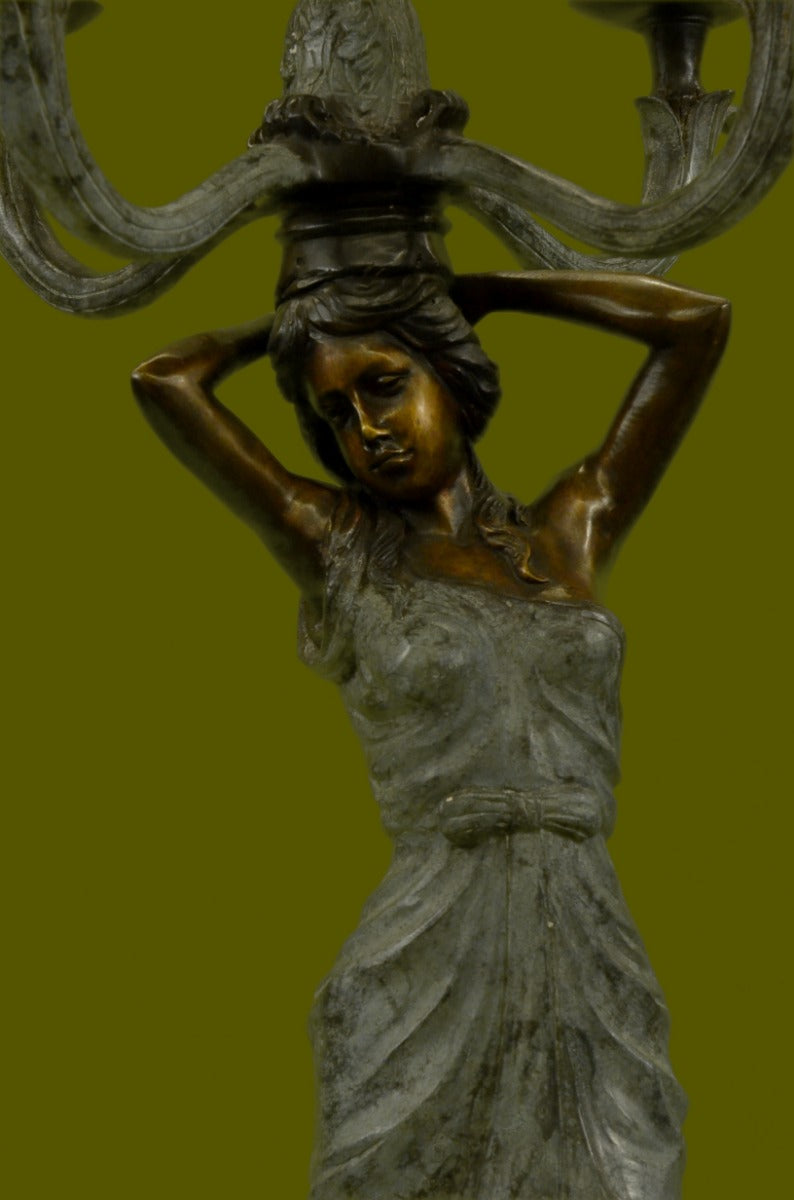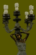 Dressed in gorgeously clad robe she holds up a torch in order for her to see her way through the night. Her robe is tied in place with a brown ribbon that is tied around her waist. Off of her shoulder her sleeve falls giving her a sultry look. Not only is this bronze sculpture gorgeous but she is also a lamp. She wears gladiator shows and a thin band in her hair. Her curly hair is ties up in neat braids and tucked under the band. She comes from royalty and wears gorgeous jewelry. This lamp is lifted off the ground and sits on 4 sphinx. It is an absolutely wonderful way to shed a little light in your life and makes great for décor, giving you a classy look. This bronze sculpture was cast suing the "Lost Wax Method" and has a special hand painted patina. This lamp is sold individually but can also be sold as a pair; we have the mirror image, inquire upon purchase.Original or Reproduction: Reproduction