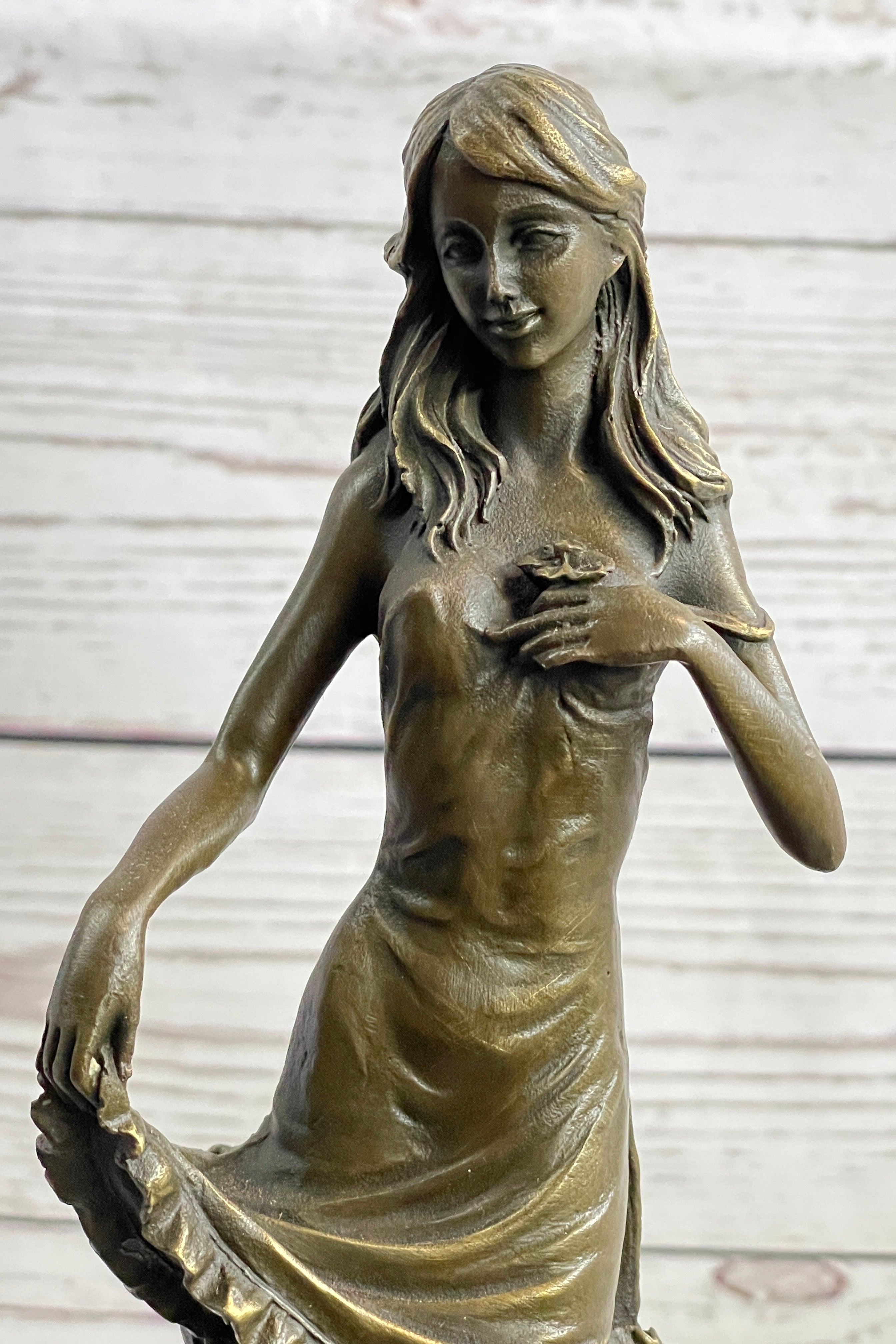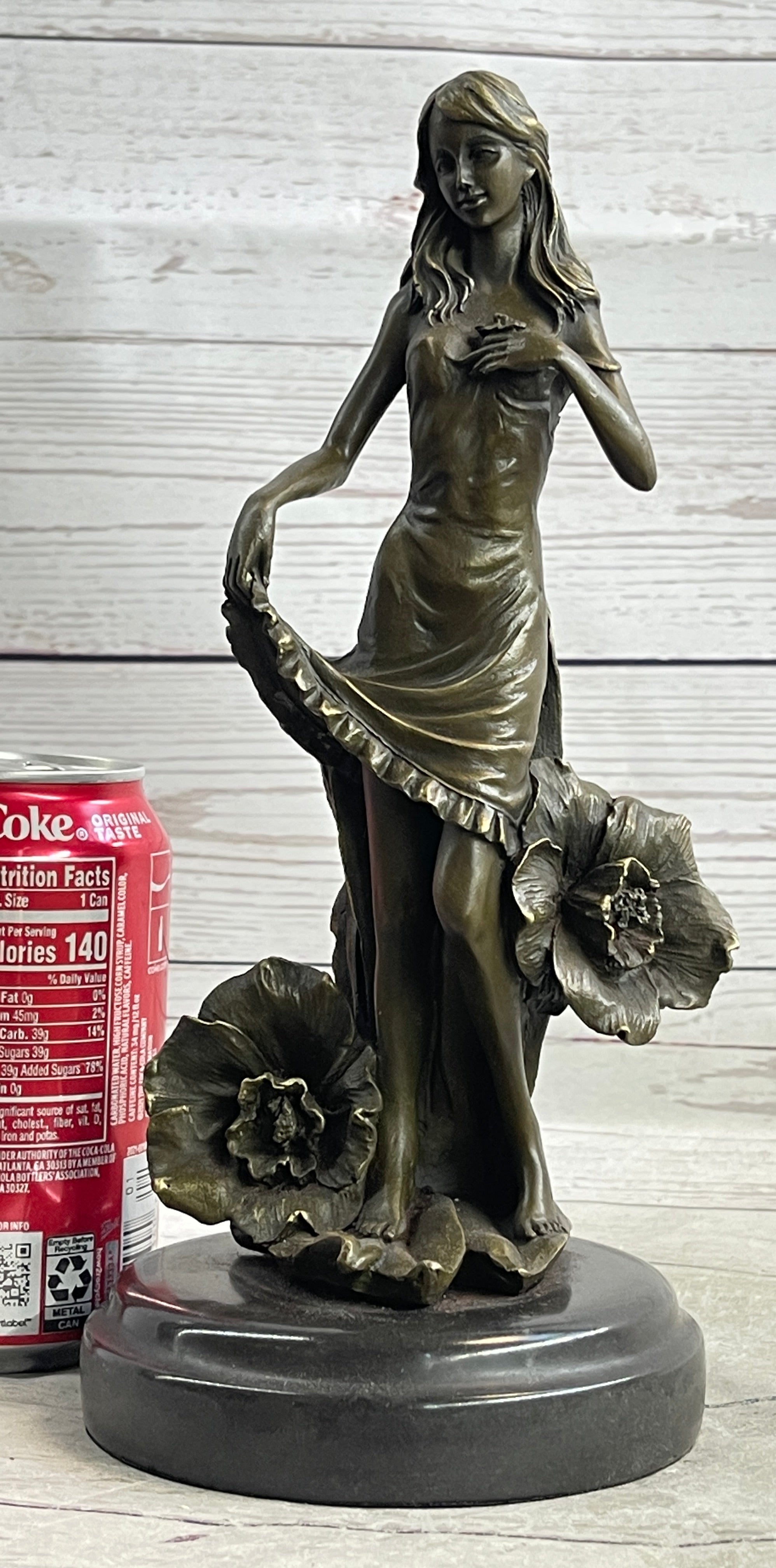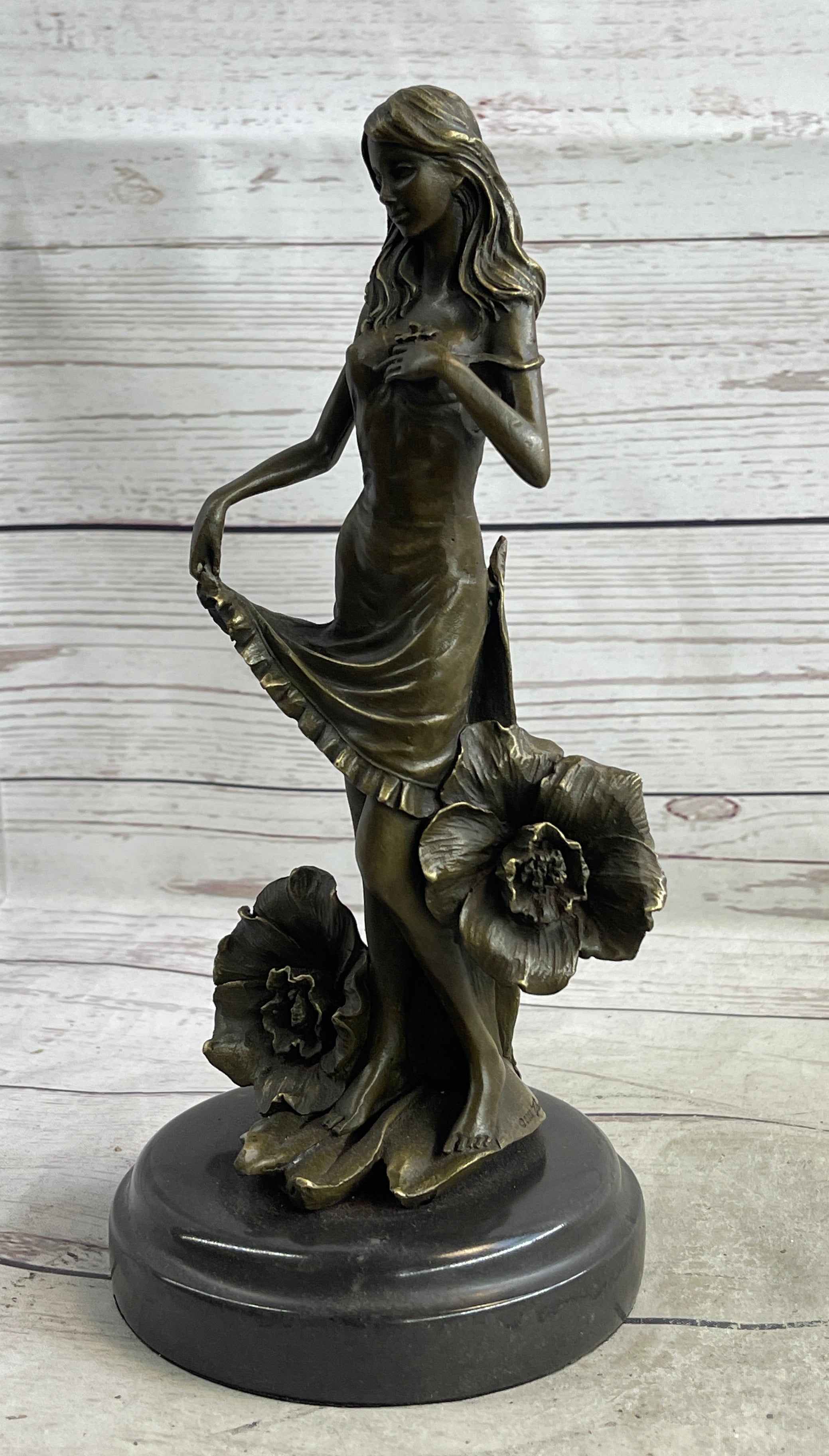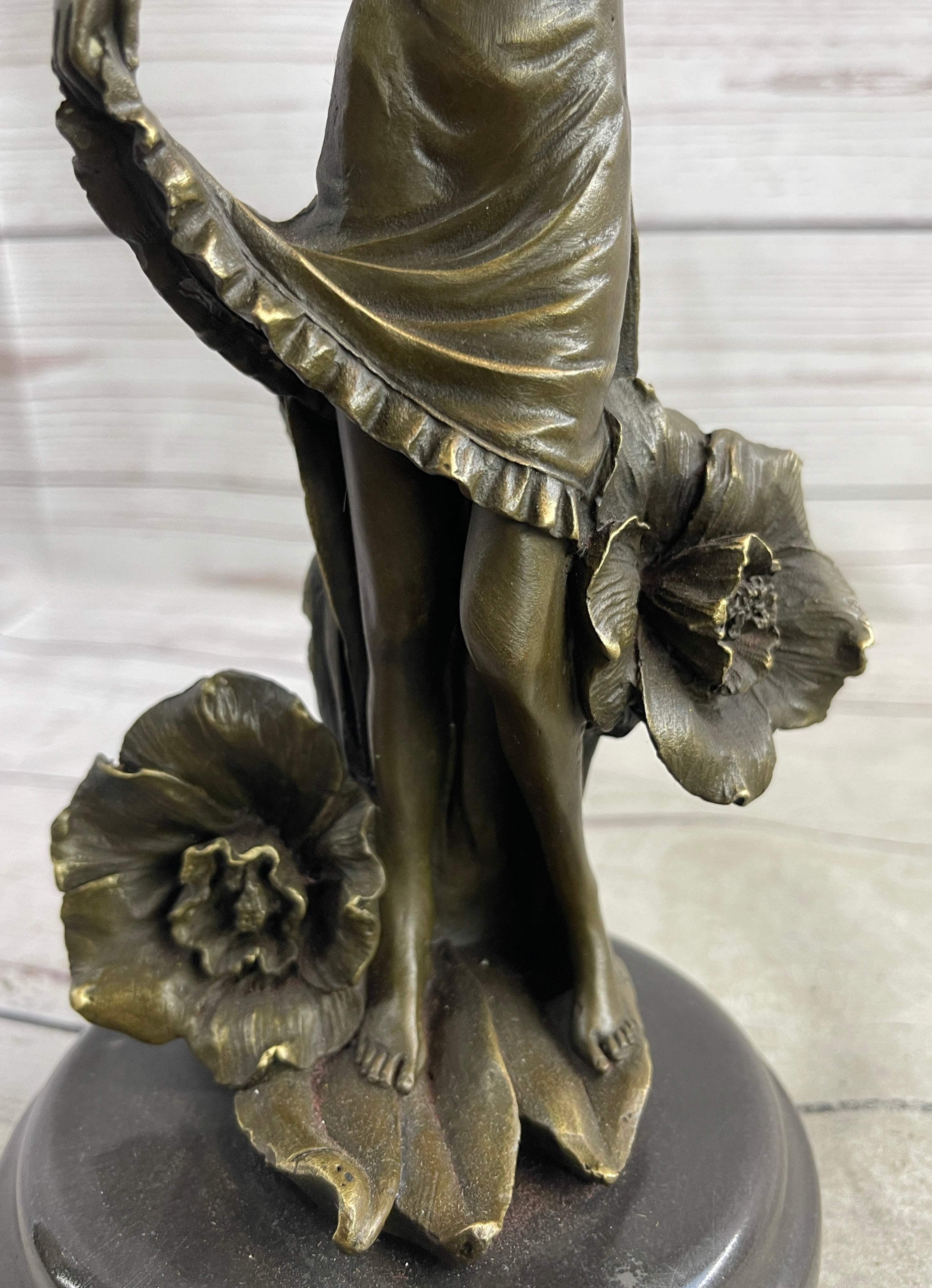Signed Moreau Beautiful Lily Girl W/ Flower Bronze Sculpture Statue Art Deco