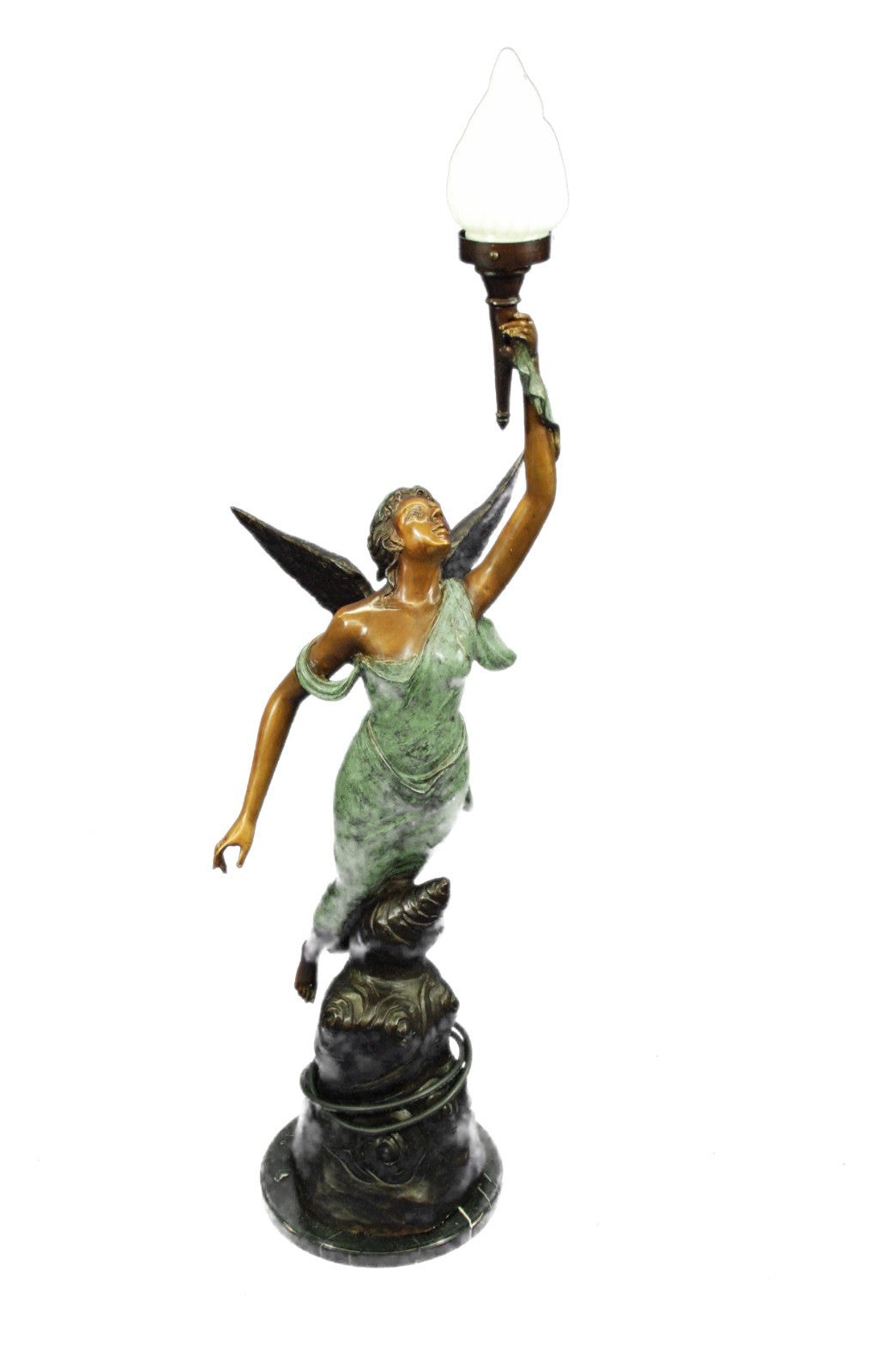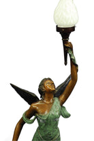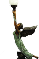 Dressed in gorgeously clad robe this gorgeous Guardian Angel holds up a torch in order for her to see her way through the night. Off of her shoulder her sleeve falls giving her a sultry look. Not only is this bronze sculpture gorgeous but she is also a lamp. She wears gladiator shows and a thin band in her hair. Her curly hair is ties up in neat braids and tucked under the band. She comes from royalty and wears gorgeous jewelry. This lamp is lifted off the ground and sits on black marble base. It is an absolutely wonderful way to shed a little light in your life and makes great for décor, giving you a classy look. This bronze sculpture was cast suing the "Lost Wax Method" and has a special hand painted patina. This lamp is sold individually but can also be sold as a pair; we have the mirror image, inquire upon purchase.Bronze Dimensions with Marble Base:Height 53" x Width 22"
