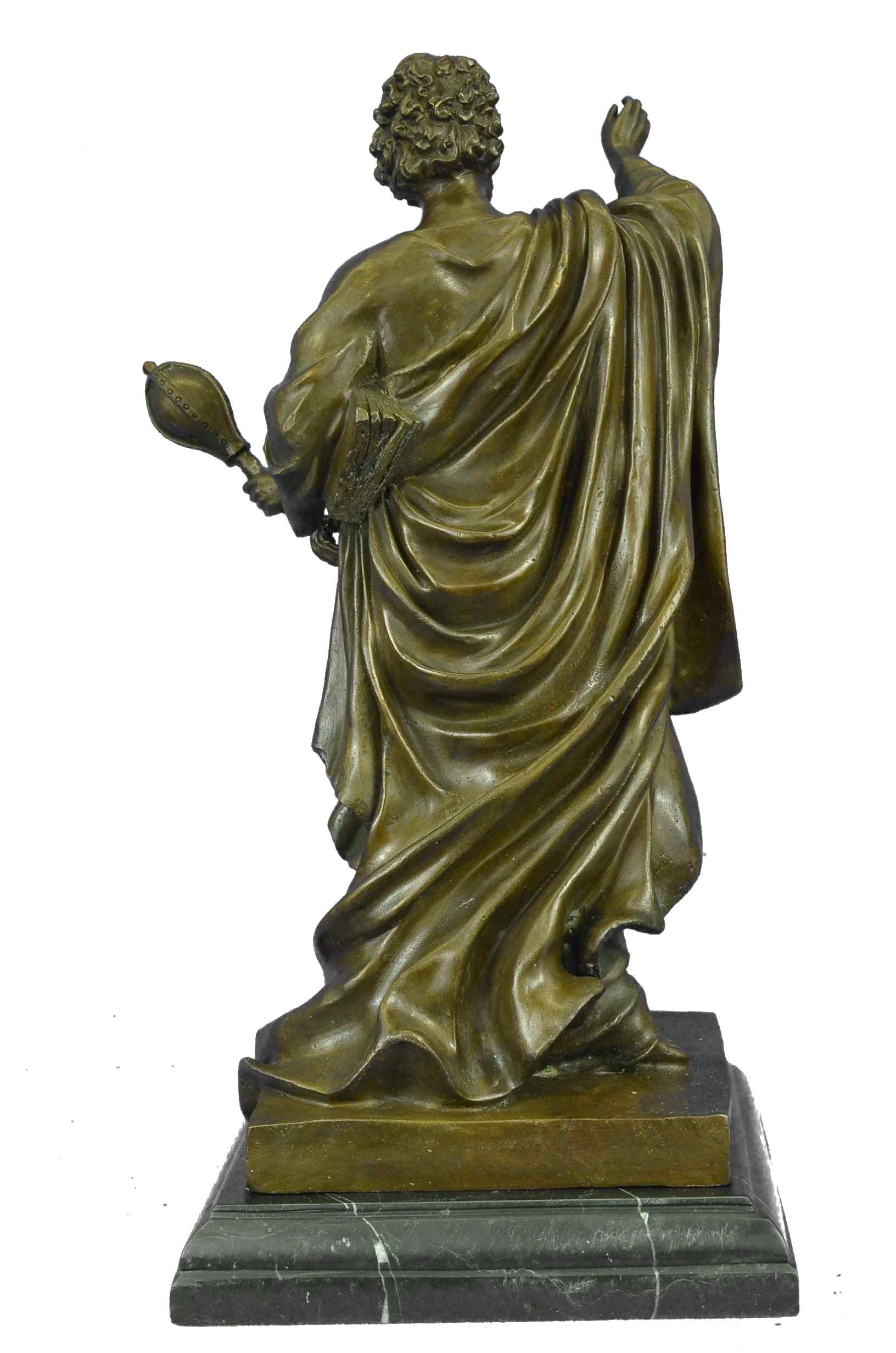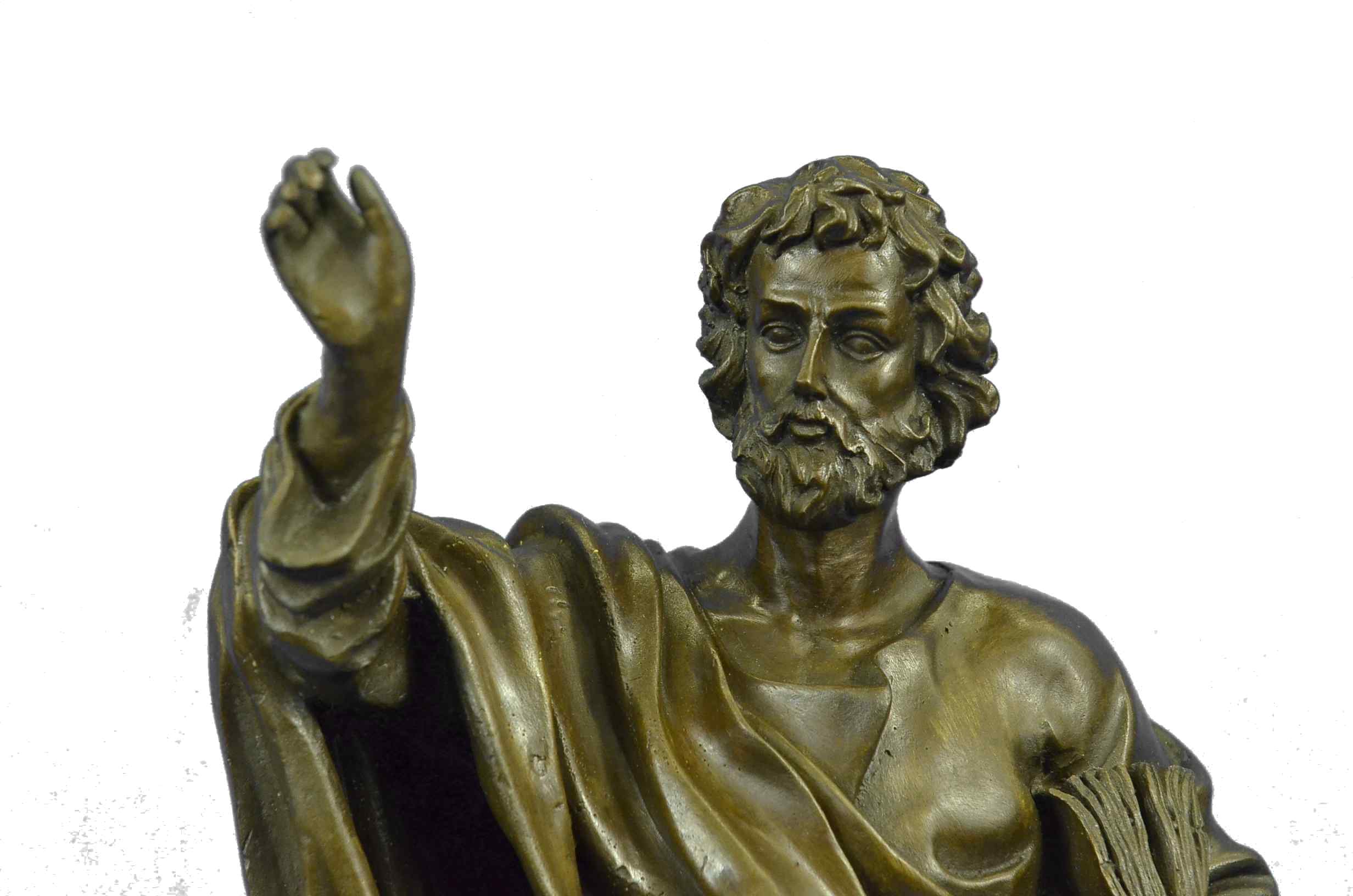 This is a bronze sculpture of Paul the Apostle also called Saint Paul. He was one of the most influential early Christian missionaries, with his writings forming a considerable portion of the New Testament. His influence on Christian thinking has been of utmost significance due to his role as a prominent apostle of Christianity during the spreading of the Gospel through early Christian communities across the Roman Empire. He stands giving the sign of benediction with his left hand while the other holds on the bible and a religious staff. The handmade sculpture was cast using the age-old method of lost-wax casting and stained with a brown patina finish for preservation. It is mounted upon a black marble base with the European Bronze Finery stamp of quality and the artist Moreau`s signature.Original or Reproduction: Reproduction