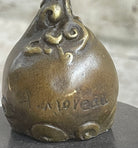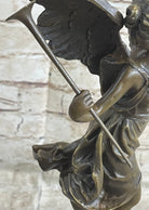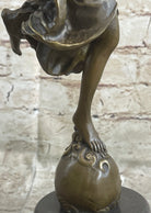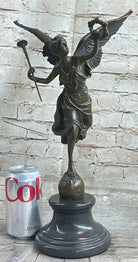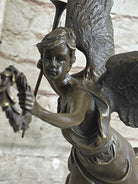Presenting an exquisite bronze sculpture featuring a charming angel perched atop a majestic rock, poised to take flight. With her hand held high and a halo of delicate leaves gracefully cradled in her other hand, she emanates a captivating presence. Her right leg is lifted back, while her gaze is directed towards the vast blue skies, preparing for her celestial ascent. This sculpture showcases meticulous craftsmanship, ensuring that her dress frames her figure beautifully, neither too loose nor too tight. Her enchanting face is accentuated by a perfectly messy bun, allowing her radiant features to shine. Crafted entirely from 100% bronze, this sculpture is lovingly handmade, utilizing the esteemed "Lost Wax Method" for casting. It stands elegantly on a marble base and bears the distinctive signature of the esteemed artist, Moreau.