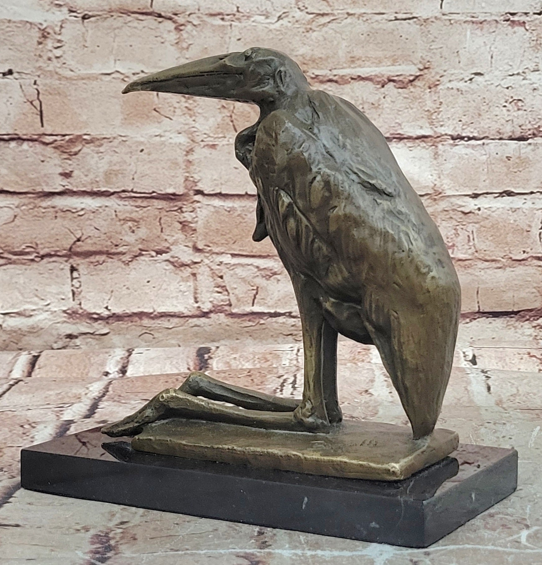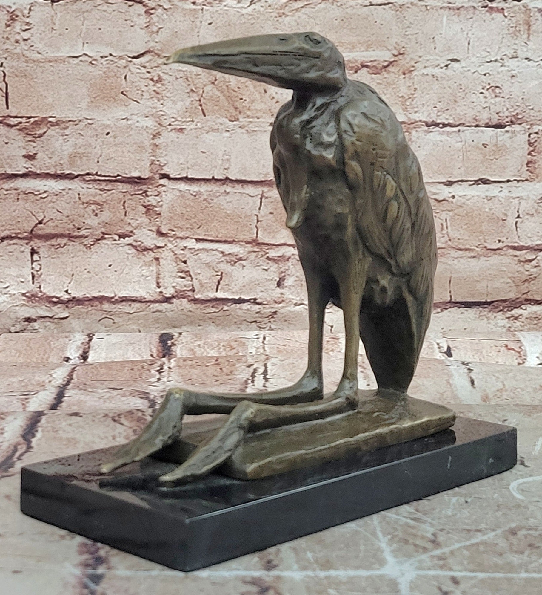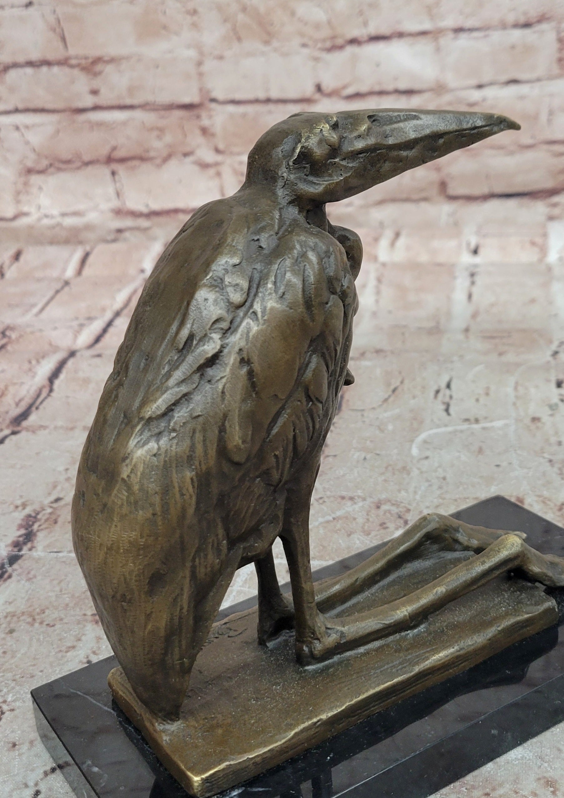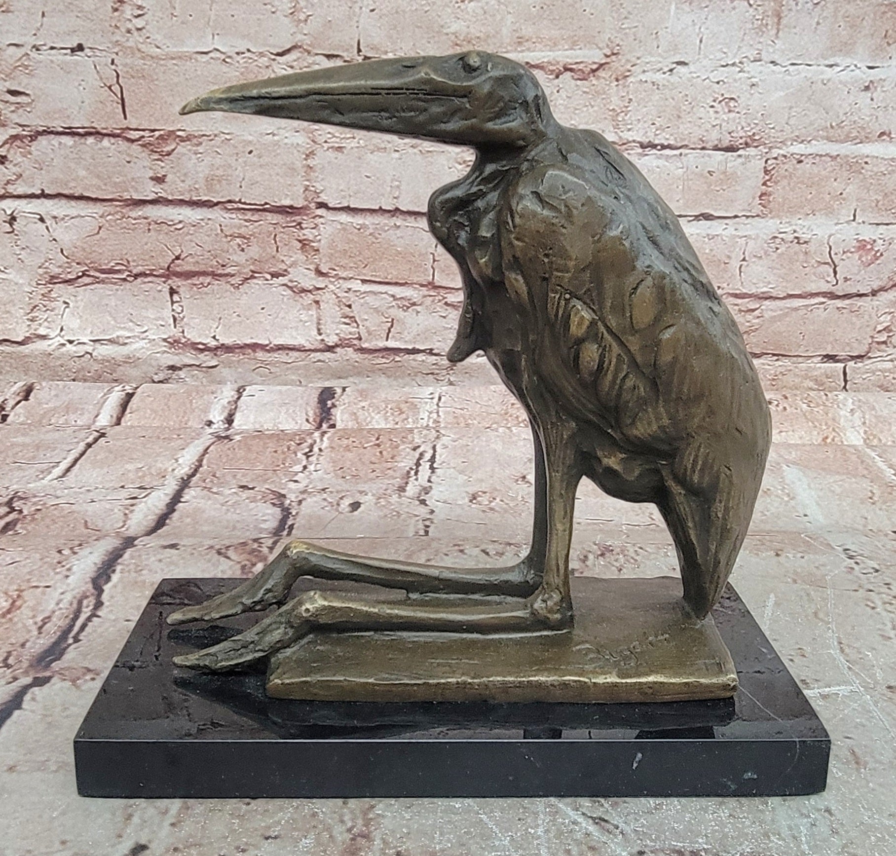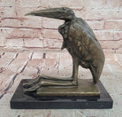 Bronze Stork Pelican Bird Sculpture with Long Beak and Legs on Marble Base