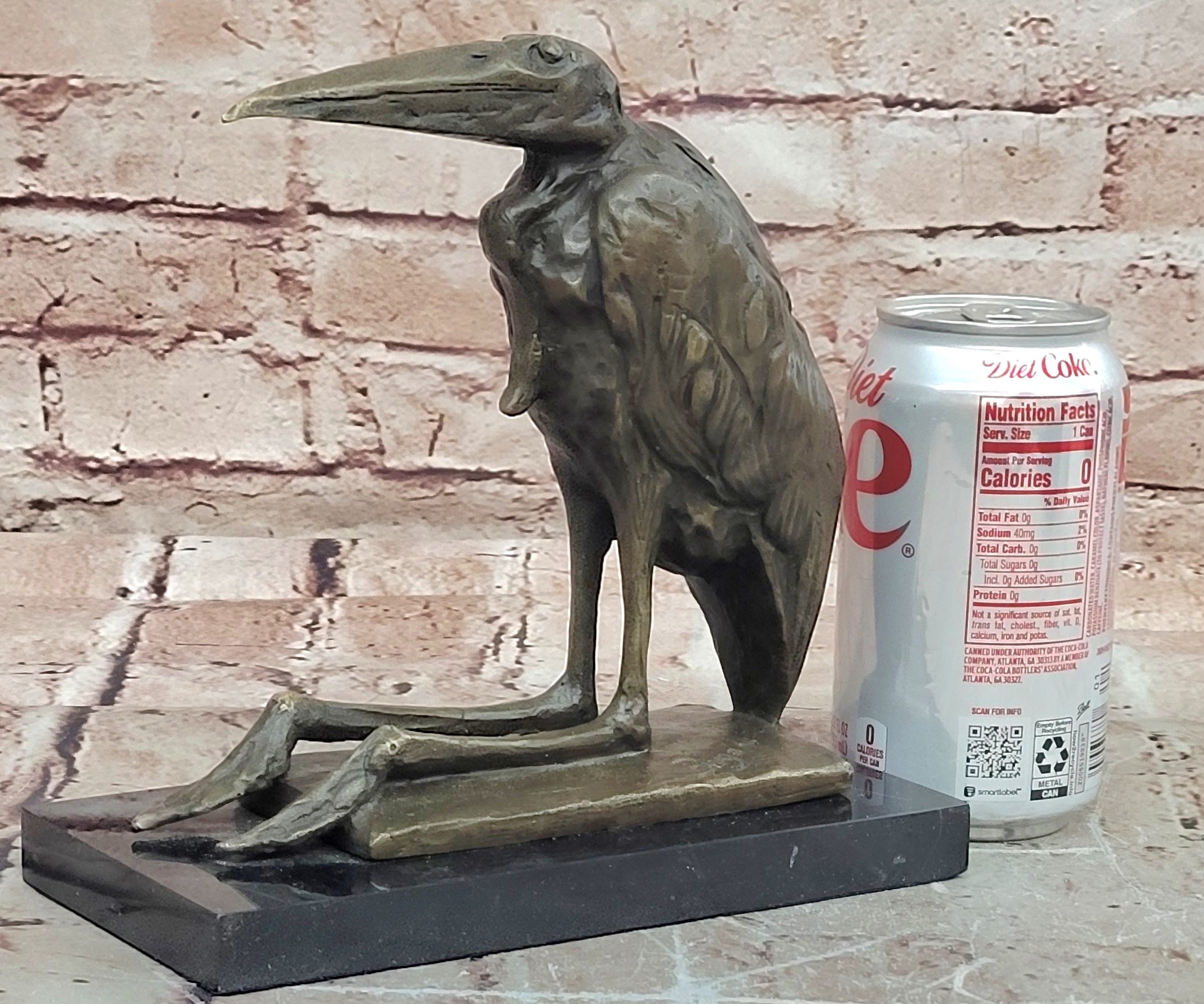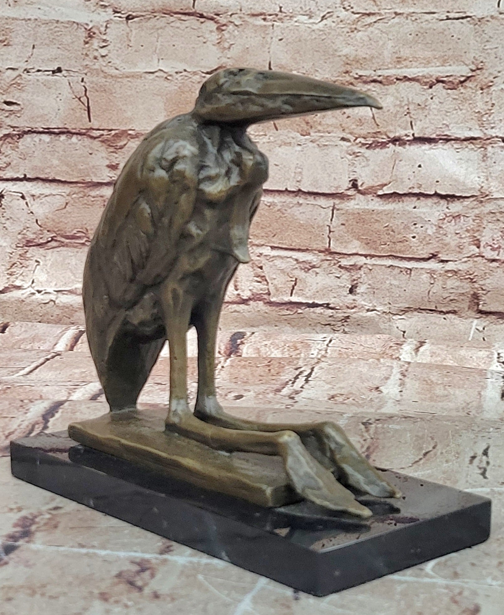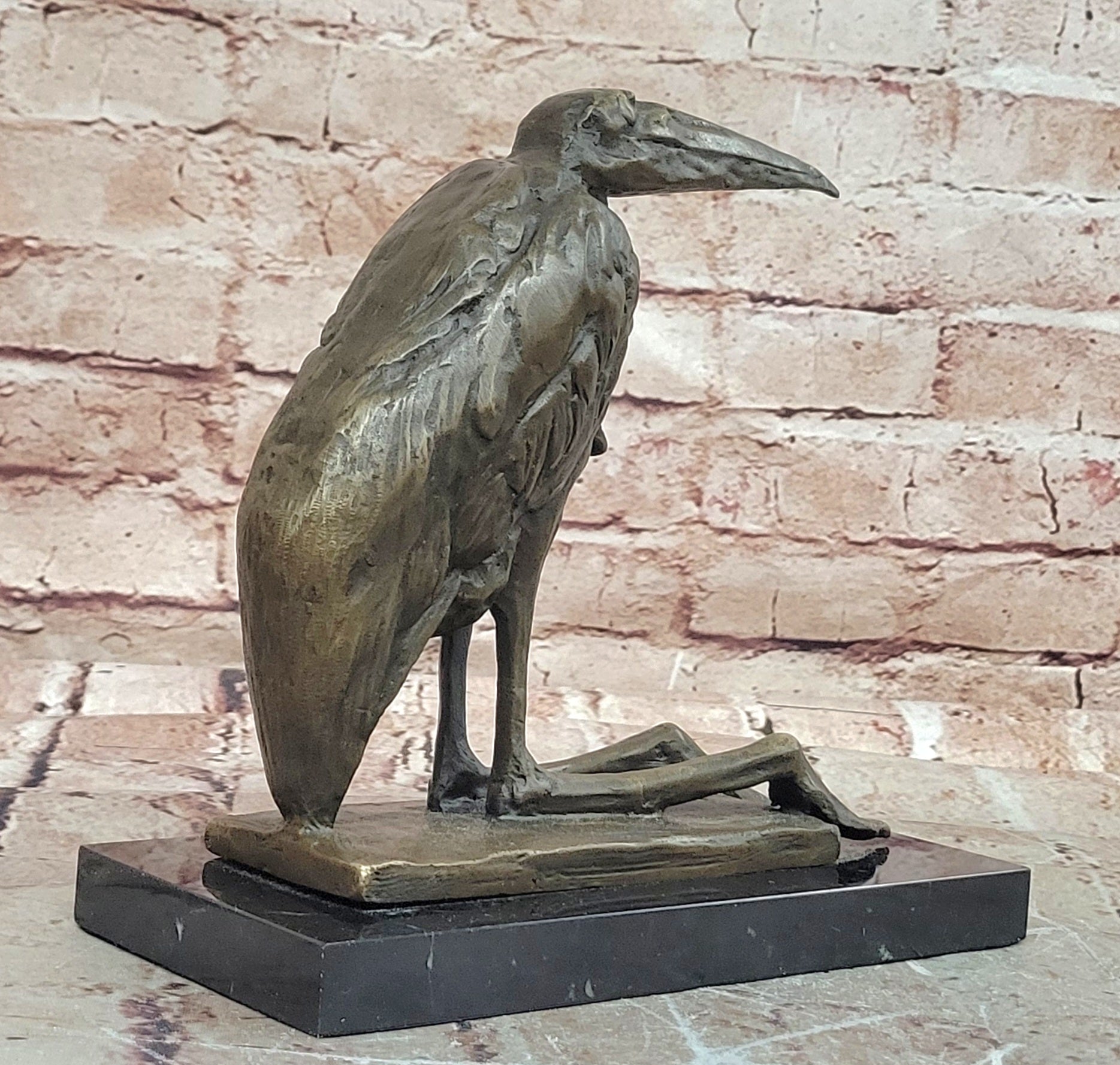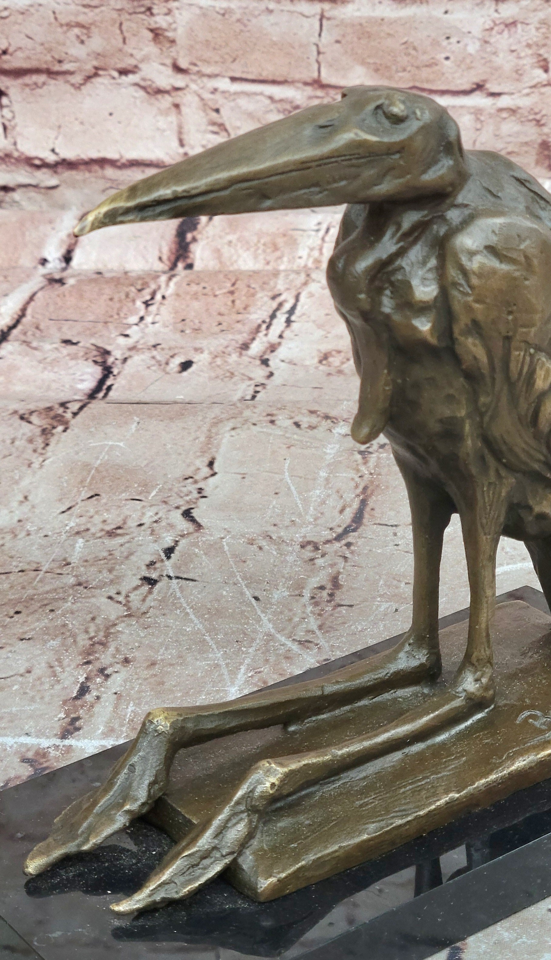 Bronze Stork Pelican Bird Sculpture with Long Beak and Legs on Marble Base