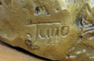 Mounted on a round beige marble base, the sculpture gains stability while offering a complementary, warm-toned contrast to the bronze. Signed by the esteemed artist Juno, this bronze eagle is a remarkable work of art that will appeal to collectors, wildlife enthusiasts, and admirers of finely crafted bronze sculptures alike.Bronze Dimensions with Marble Base: Height 19" x Width 18"