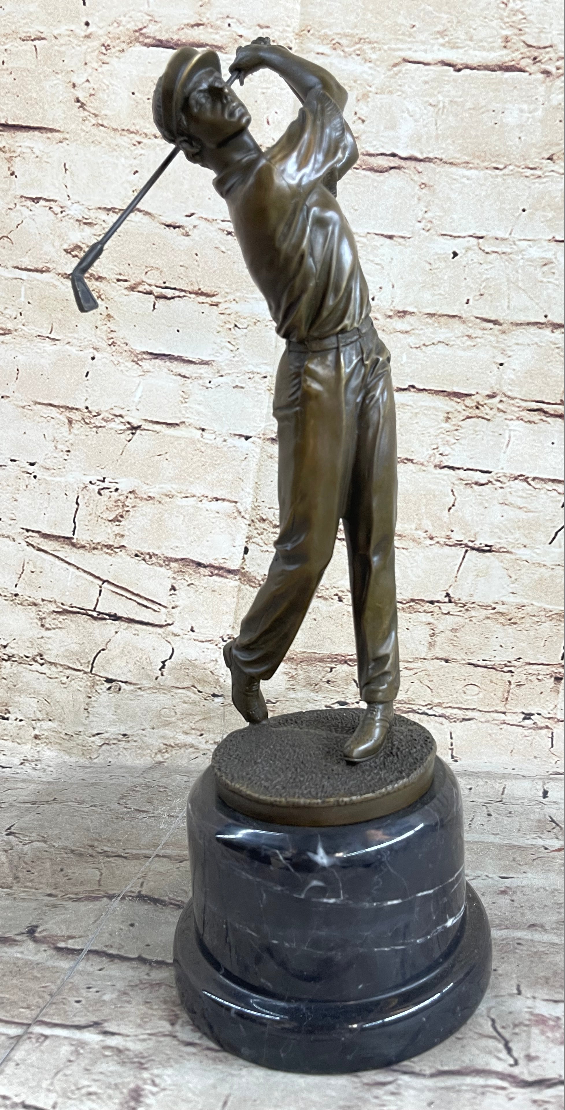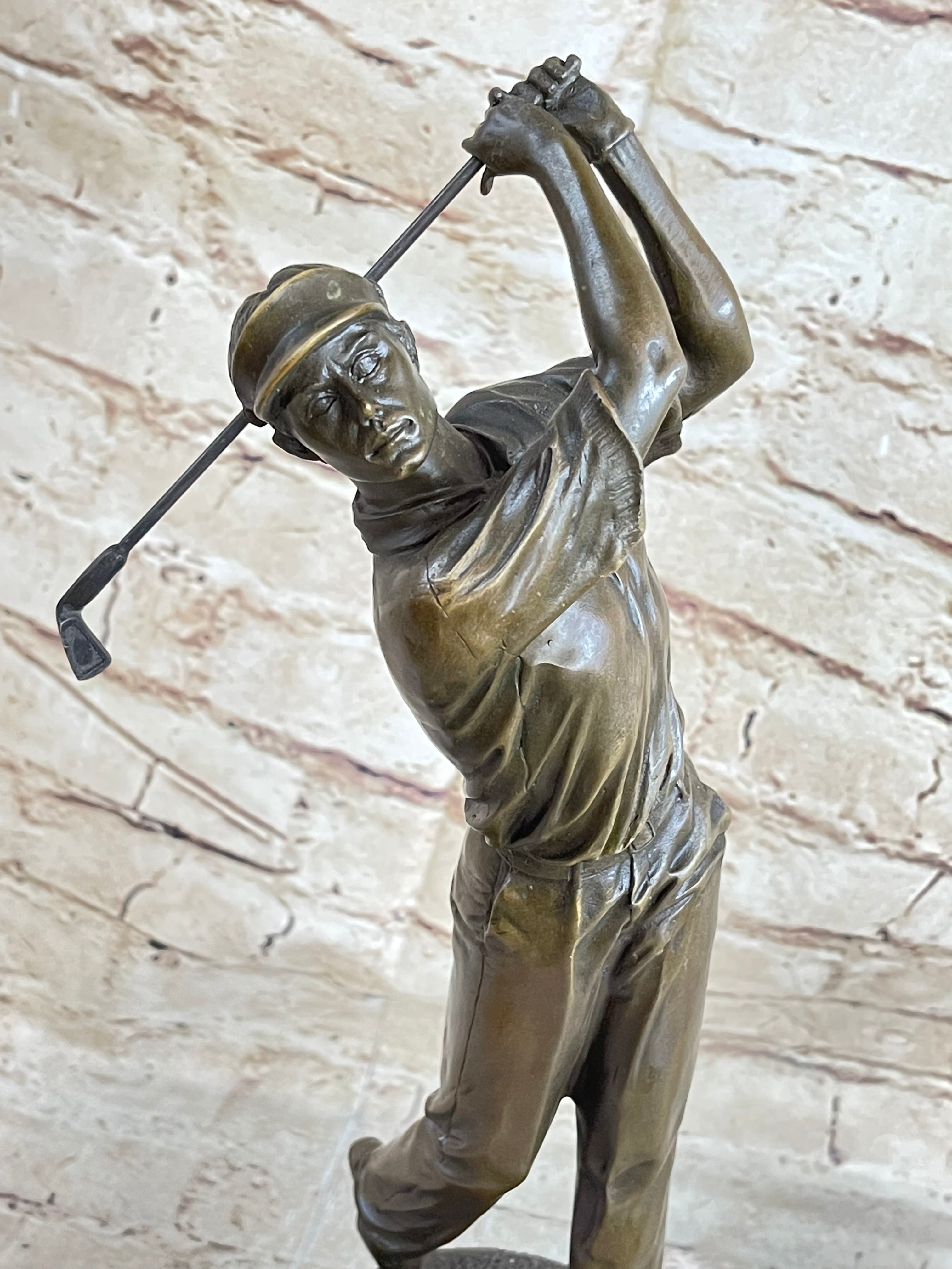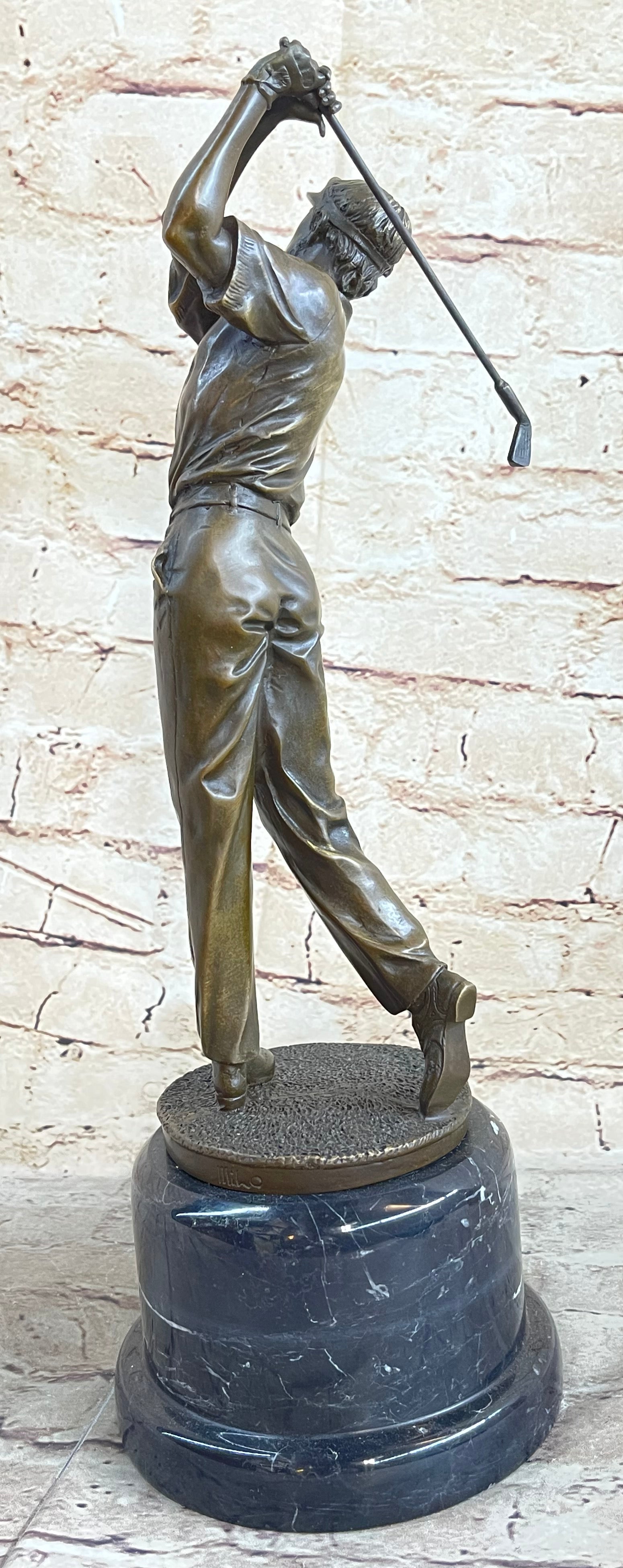 This captivating bronze sculpture captures the essence of a golfer in the midst of a crucial shot. With unwavering focus, he tilts his head upward, his eyes following the trajectory of the golf ball as it soars toward the green. His stance is the epitome of concentration, his body gracefully twisting with the swing, a testament to the precision required in the sport. As the golfer's mind races with calculations about the distance, obstacles, and potential strokes required, the surrounding crowd has already begun to erupt with excitement. Yet, he remains composed, knowing that the outcome hangs in the balance, subject to the whims of the wind and the landscape. This extraordinary sculpture, cast in 100% bronze using the revered "Lost Wax Method," is a testament to both the skill of the artist and the dedication of the golfer. With its intricate details and lifelike portrayal, it captures the tension and anticipation of a pivotal moment on the golf course. Mounted on a sturdy marble base and bearing the signature of the artist Milo, this piece is a remarkable addition to any collection and a tribute to the artistry of sport.