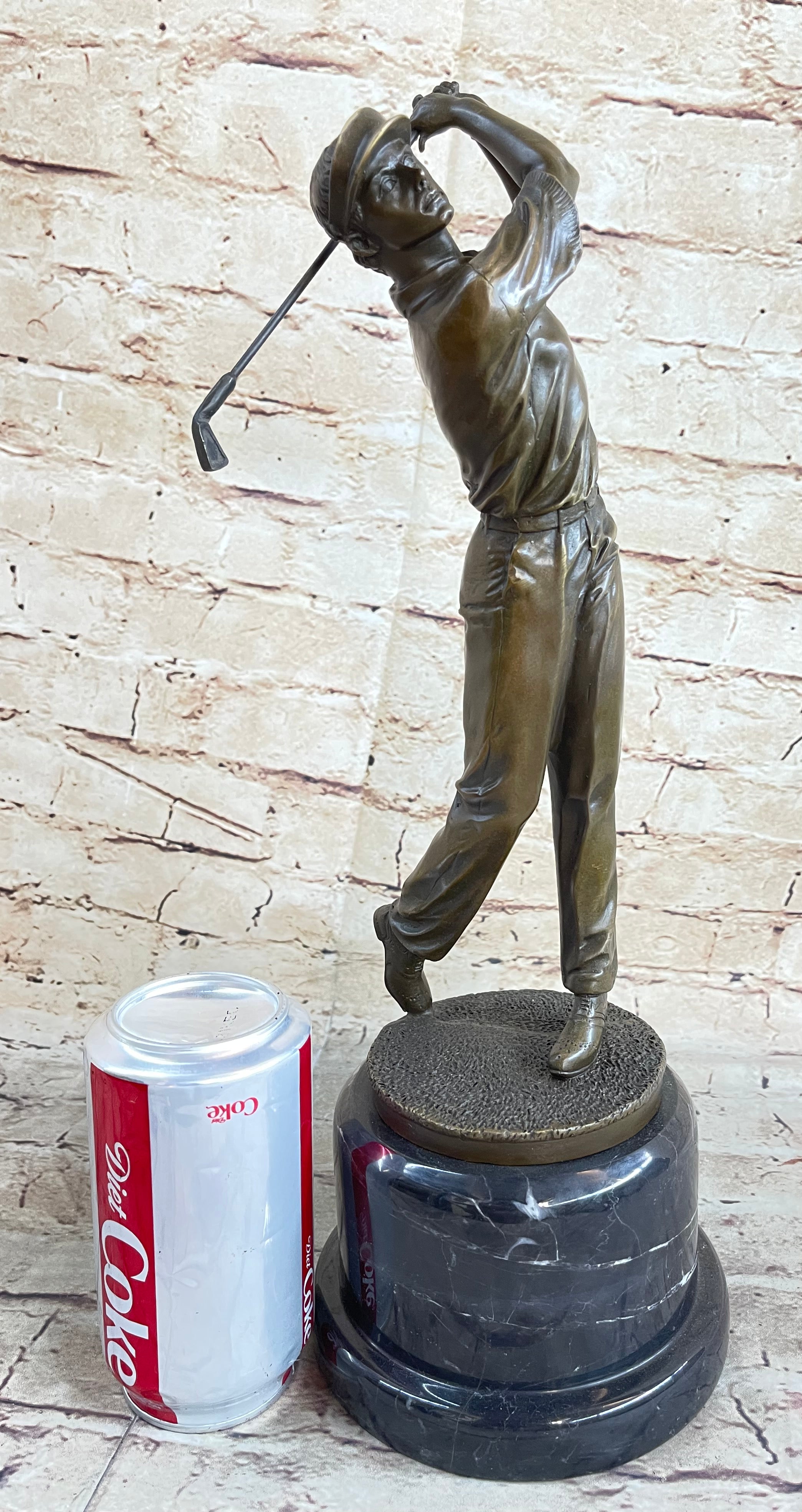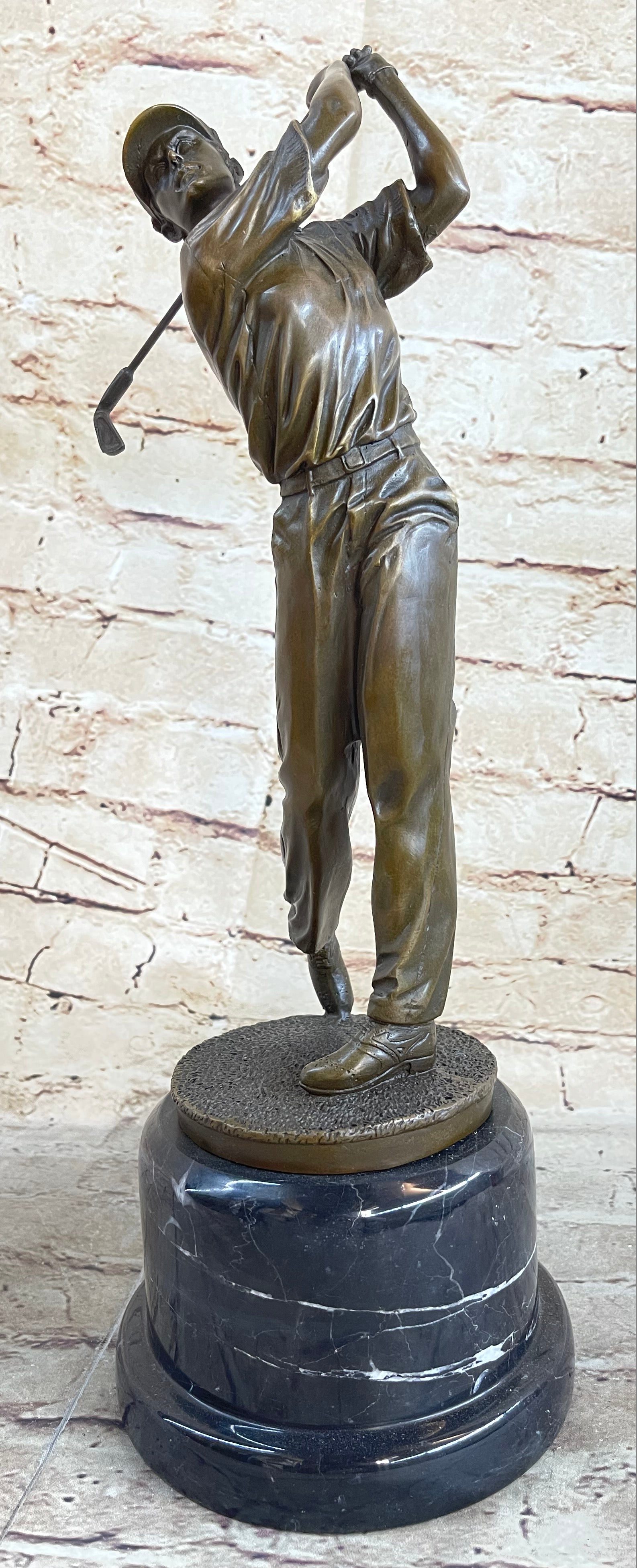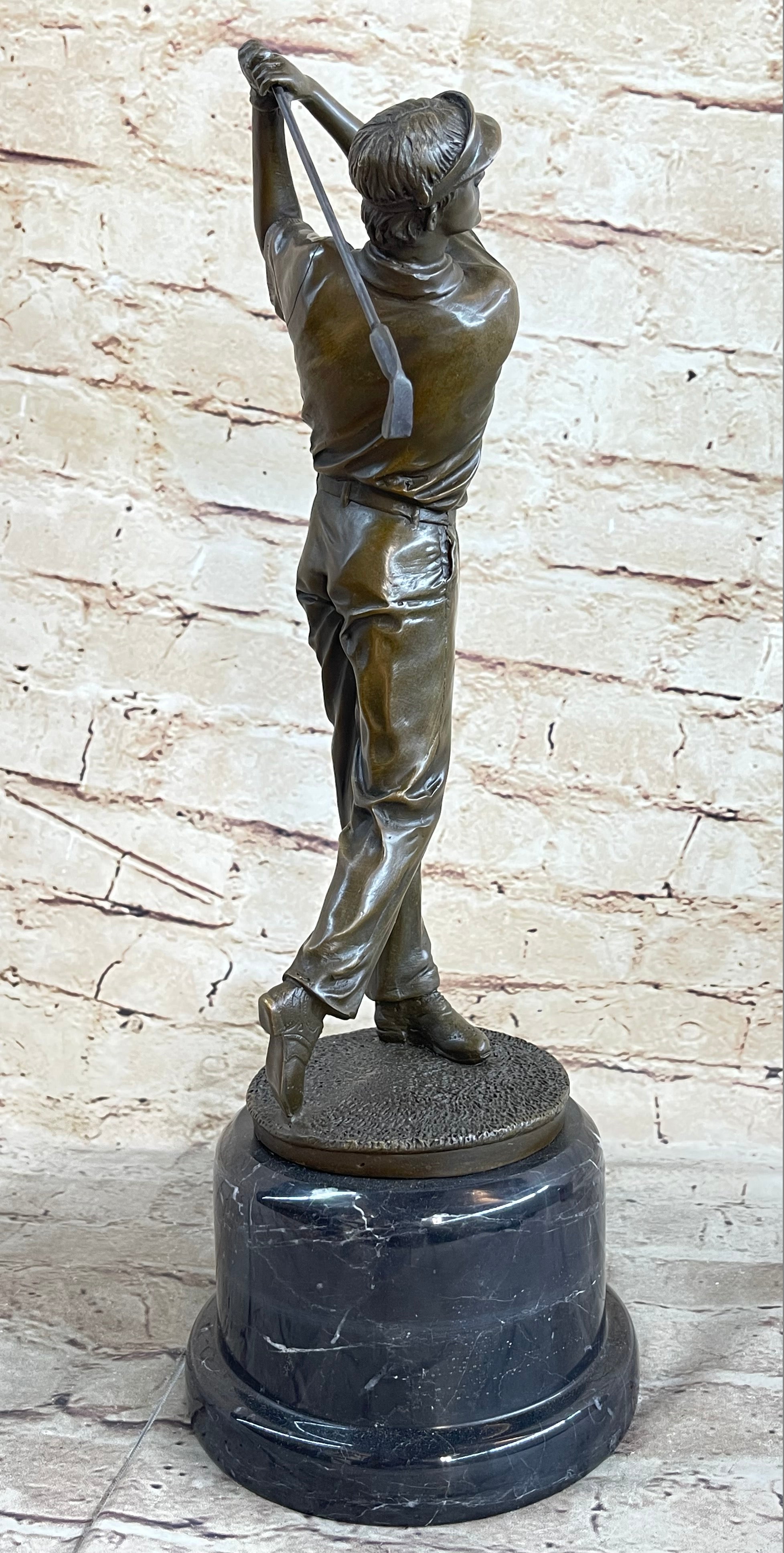 This captivating bronze sculpture captures the essence of a golfer in the midst of a crucial shot. With unwavering focus, he tilts his head upward, his eyes following the trajectory of the golf ball as it soars toward the green. His stance is the epitome of concentration, his body gracefully twisting with the swing, a testament to the precision required in the sport. As the golfer's mind races with calculations about the distance, obstacles, and potential strokes required, the surrounding crowd has already begun to erupt with excitement. Yet, he remains composed, knowing that the outcome hangs in the balance, subject to the whims of the wind and the landscape. This extraordinary sculpture, cast in 100% bronze using the revered "Lost Wax Method," is a testament to both the skill of the artist and the dedication of the golfer. With its intricate details and lifelike portrayal, it captures the tension and anticipation of a pivotal moment on the golf course. Mounted on a sturdy marble base and bearing the signature of the artist Milo, this piece is a remarkable addition to any collection and a tribute to the artistry of sport.